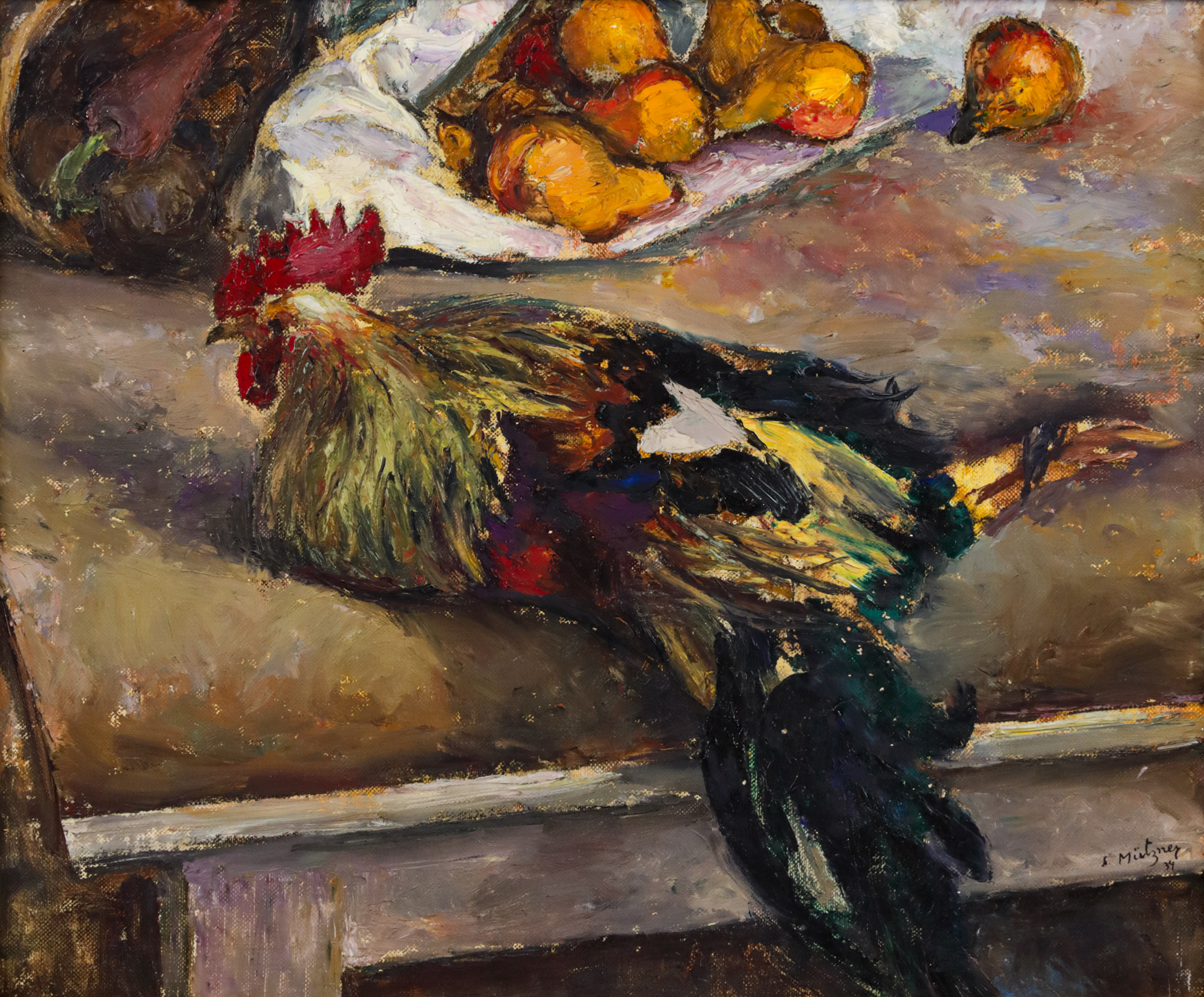 După revenirea în țară, în anul 1923, Samuel Mützner își asumă viața satului ca tematică principală a operei sale. Ridică spațiul rural la rang de artă și surprinde culoarea locală a vieții rustice. Creează, alături de soția sa, pictorița Rodica Maniu, în satul în care aceasta moștenește o mică proprietate, în județul Olt. Casa ascunsă sub umbra arborilor dezvăluie celor doi artiști un cadru unic. Samuel Mützner are totuși un loc preferat din care lucrează, în apropierea unui copac, loc din care poate admira plopii și sălciile satului. Creează în aer liber și străbate numeroase regiuni pe care le integrează, treptat, în pânzele sale. Alteori, ajunge în zona izvoarelor de lângă câmp și își modelează paleta cromatică în funcție de evoluția naturii. Pictează adesea înconjurat de copiii satului, curioși să afle meșteșugul maestrului venit de la oraș. Surprinde peisaje cu dealuri, câmpuri sau lanuri de porumb și se concentrează asupra redării anotimpurilor sub pecetea cărora pictează. Lucrează cu tușe scurte, rapide, juxtapuse armonios și își reglează lumina ținând cont de momentul zilei, de spațiu și de anotimp. În volumul de memorii publicat în anul 1930, Marcu Mützner, fratele artistului, nota despre acesta: ”alerga prin păduri, pe câmpuri, adormea în iarbă, se bălăcea în mlaștini, scălda caii, alerga după rațe sălbatice, ajuta la grădinărit”, oferindu-ne așadar posibilitatea de a păși în intimitatea ludică și familială a artistului ajuns acum la maturitate. Identificăm așadar preocuparea și interesul pentru subiectele de sorginte populară, dar și pentru naturile statice în care apar răsfirate pe mese ori pe jos roade ale naturii, păsări sau alte animale. De cele mai multe ori, utilizează preponderent o cromatică caldă, specifică zilelor toride de vară, însă alteori optează, așa cum se întâmplă și acum, pentru nuanțe neutre, de gri și brun, brăzdate de câteva pete de culoare: auriul perelor sau roșul din creasta cocoșului. Observăm, astfel, modalitatea în care interpretează artistul pasionat de Seneca, Epictet sau Marcus Aurelius, viața rurală și obiceiurile cotidiene ale locuitorilor de la sat.