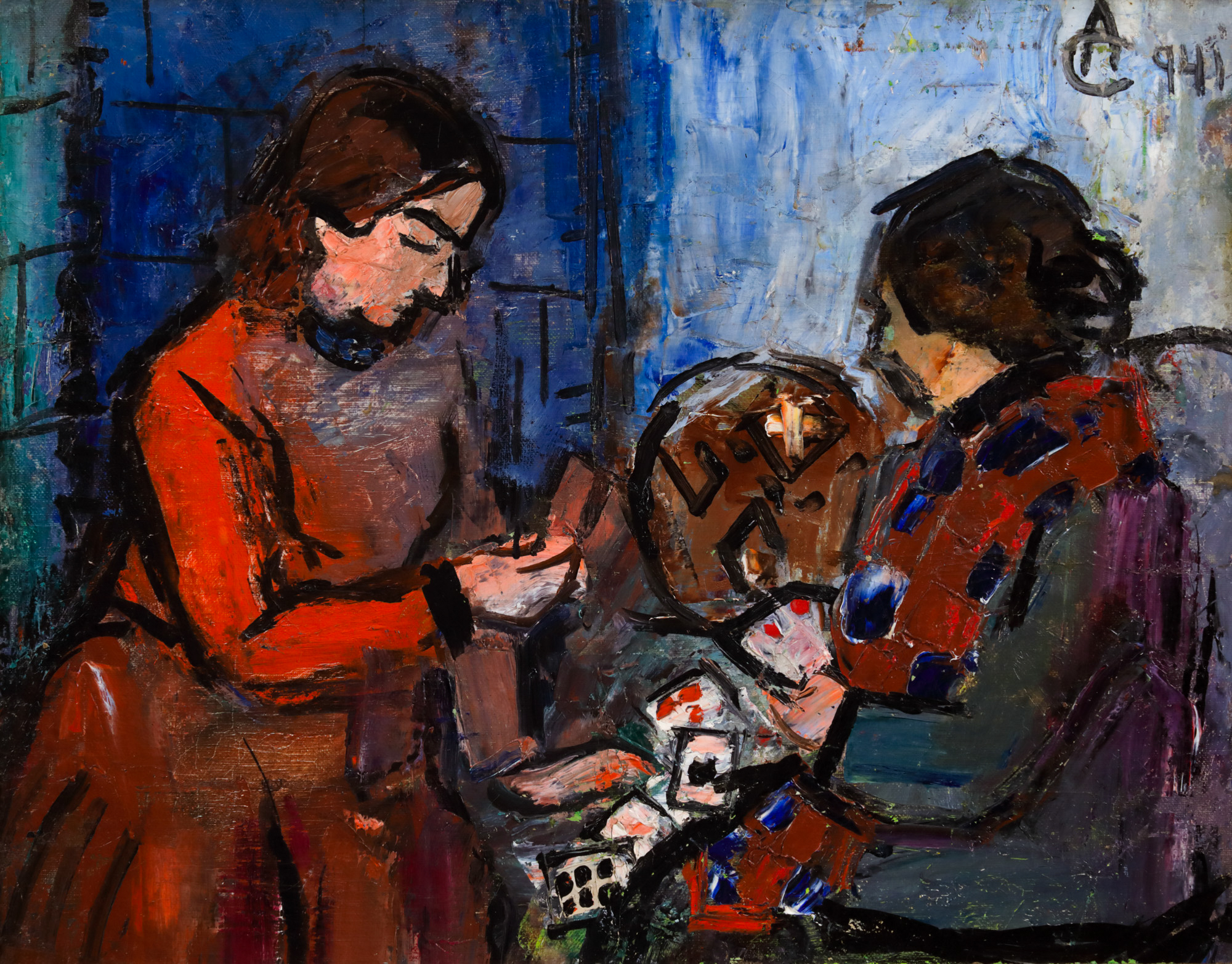 Anii ’30 marchează, în parcursul lui Alexandru Ciucurencu, momentul eliberării de reminiscențele rigorii academiste deprinse în timpul studiilor la București. Perioada de început a creației sale e caracterizată de un lirism discret, cu acorduri luminoase ce posedă o anumită rezonanță muzicală. Asupra tonurilor pure, vibrante, artistul intervine aievea prin câteva accente de negru care subliniază câte un contur. Predomină, în această etapă, naturile statice și scenele de interior. Ciucurencu nu idilizează aspectele cotidiene ale existenței, ci le zugrăvește conform percepției sale proprii. Își surprinde modelele în ipostaze contemplative, așezate pe fotoliu, întinse pe divan, sau în timpul lecturii. Punctează câteva notații sumare ale cadrului real și se concentrează pe realizarea unui desen simplu, concis. Ciucurencu se va remarca, la momentul revenirii din Paris, prin rafinamentul pictural care abundă în unde sensibile ale expresiei artistice. Regăsim, și în cazul operei de față, o scenă de interior, un joc de cărți intens între cele două personaje. Predomină nuanțele de roșu și albastru și se disting câteva accente puternice de lumină încastrate în străfundurile culorii. Vom identifica același spirit de observație și aceeași putere de concentrare a protagoniștilor și în lucrarea ”Jocul de șah”, realizată doi ani mai târziu. Dacă în opera din 1943 jocul se desfășoară în cadrul cuplului androgin așezat de-o parte și de alta a unei mese bine delimitate de restul compoziției, în lucrarea de față avem de-a face cu cele două protagoniste cufundate într-un joc de tabinet. Observăm, așadar, cum Ciucurencu decupează fragmente din cotidian și le transpune cu măiestria sa specifică în motive picturale. Reușește să dibuiască o fascinantă poziționare a tonurilor calde lângă cele reci și răzbește, în cele din urmă, în conturarea unei cromatici exuberante.