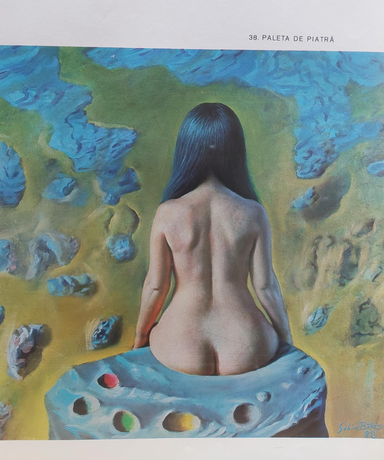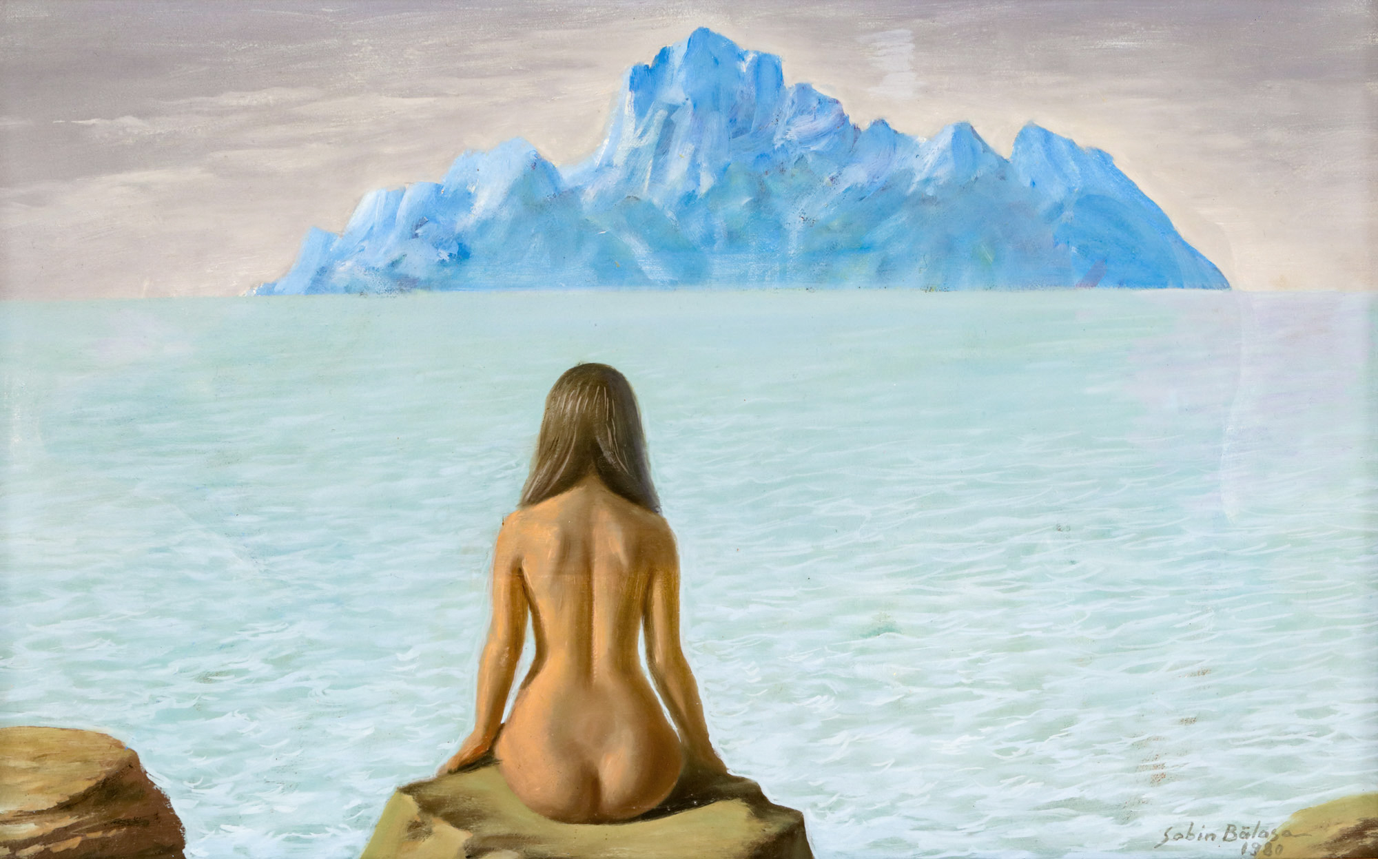 Universul utopic pe care îl regăsim adesea în pânzele lui Sabin Bălașa, înăuntrul căruia artistul se aventurează încă din anii copilăriei, reiterează fascinația sa în fața necunoscutului și a infinitului. În opera sa se remarcă, indiscutabil, trimuful simbolului contemporan în fața simbolului arhetipal, din care va păstra, totuși, valoarea universală. Bălașa abordează teme din legendele și mitologia universală și schițează adesea subiecte precum viața și moartea, copilăria și tinerețea sau speranța renașterii. În creațiile sale, arta apare înțeleasă drept un vis etern – nu atât al artistului, cât al întregii omeniri. Artistul declara că arta este pentru el ”un exercițiu suprem al libertății proprii, o mare capacitate de a iubi”. Pictura lui Bălașa ni se înfățișează drept o continuă difuzare în timp. Cosmosul, lumea marină, deșertul sau munții reprezintă doar o mică parte din universul infinit în care artistul își așează cu grijă ființele fabuloase. Folosit cu predilecție încă din perioada de început, albastrul, în viziunea sa, ”este lumina cea mai îndepărtată, este imensitatea în care se rezolvă și renasc toate culorile și toate formele, este adevărul, idealul, eternitatea”. Artistul care a reușit să populeze cerul cu ființe umane își construiește propria semantică plastică cu ajutorul căreia va picta metafore cu rezonanțe poetice. Devenită laitmotiv, cariatida lui Bălașa apare, de această dată, prefigurată în prim-planul pânzei, purtând pe umerii săi întreaga armonie a luminii. Redate nud, cu fizionomii mai mult sau mai puțin articulate, modelele lui Bălașa capătă, pe rând, statutul de muze ale ploii, mame ale pământului, zeițe sau cariatide ale civilizației. Omul va fi consacrat, așadar, visurilor și dorințelor artistului. Arta fantastică a lui Bălașa, indiscutabil orientată către univers, se supune adesea unui topos necunoscut și unui interval de timp incert. Valoarea afectivă a lucrărilor sale e intensificată de coagularea vizuală a mitului, a istoriei și a întinderii nemărginite a imaginației sale. De această dată, cariatida lui Bălașa e surprinsă din spate. Ipostaza a fost reluată de-a lungul timpului și în alte opere (”Paleta de piatră”) în care muza apare înfățișată cu trupul dezgolit, sprijinită cu mâinile de piatra de hotar pe care-și balansează greutatea trupului. Părul lung e despărțit în două secțiuni și condus dincolo de umeri, lăsând să se zărească detaliile anatomice pe care pictorul le-a studiat îndelung. Regăsim acum expresivitatea diafană a siluetei muzei, nesfârșita întindere acvatică și formațiunile cenușii ale naturii, care ascund razele timide ale soarelui și tulburarea cerului. Plasată astfel, cariatida se află într-o profundă comuniune cu natura și se camuflează, ușor, în cromatica fadă a compoziției.