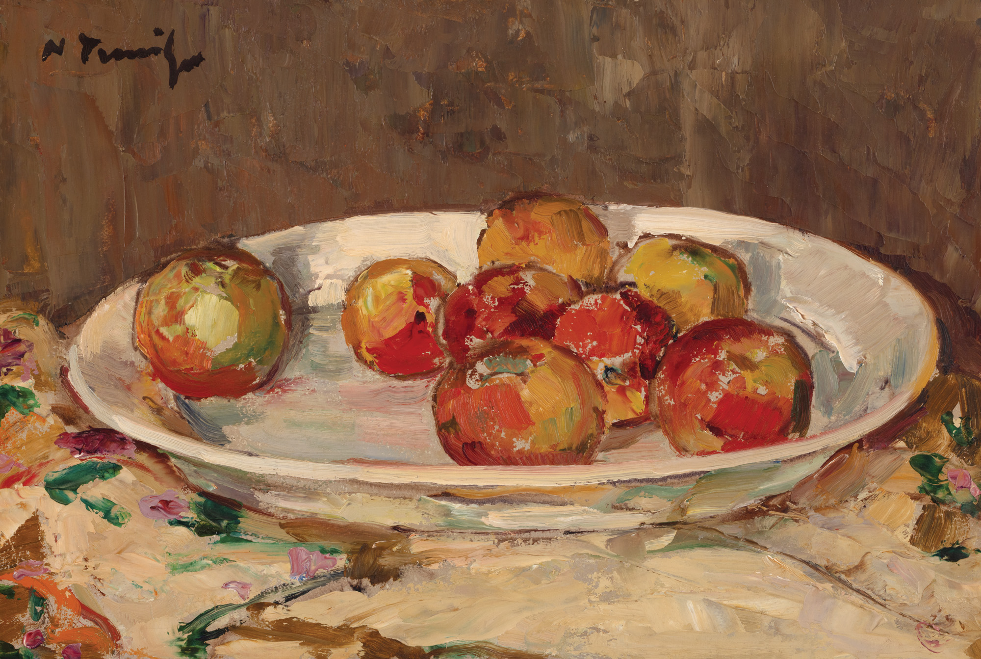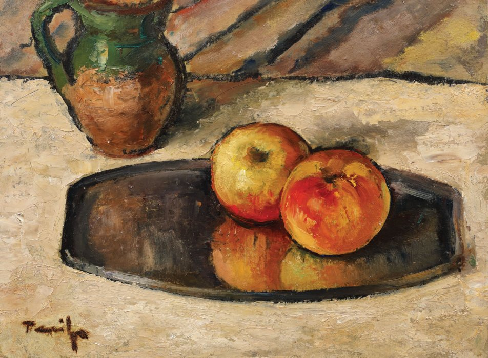 ”Cînd reproduci natura - ești sclavul ei. Cînd o reprezinți - o domini” avea să declare artistul. Seva inspirației sale ar putea fi identificată chiar din lucrul în mijlocul naturii. La Vălenii de Munte, avea o grădină de zarzavat în preajma casei și o livadă de pruni ce le servea drept un memorabil spațiu de joacă copiilor. Expedițiile de studiu organizate cu elevii săi la Durău, au fost, de asemenea, eficiente în preluarea unor teme care aveau să își expună roadele mai târziu. Așezate pe farfuria albă, fructele însumează aici un exercițiu cromatic cuprinzător, ce pornește de la roșul rubiniu și galbenul solar și purcede până la ampla extindere a albului care poartă deasupra sa greutatea roadelor. Farmecul inserțiilor de lumină în pigmentul fructelor, simetria compozițională, efectele de spațialitate și echilibrul pe care îl degajă lucrarea contribuie la tratarea triumfătoare a genului de către artist. Acesta abordează natura statică destul de rar, astfel că regăsim un număr restrâns de lucrări de acest gen în creația sa. Unele dintre ele au fost incluse de-a lungul timpului în colecții reputate (Iosif Dona sau Maria Avramescu), iar altele au participat la principalele manifestări artistice dedicate pictorului. ”Natură statică cu ulcior și mere”, expusă în cadrul retrospectivei sale din 1964, tratează un subiect asemănător, cu o paletă cromatică izbitoare, asemenea celei de față. Remarcăm o altă ”Natură moartă cu mere și pipă” dar și alte opere în care se înlănțuie pe suprafața pânzei ori a cartonului vase tradiționale din ceramică, legume ori fructe. Identificăm mai curând vase cu flori ori panouri florale, astfel că naturile statice similare celei de față devin apariții singulare.