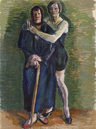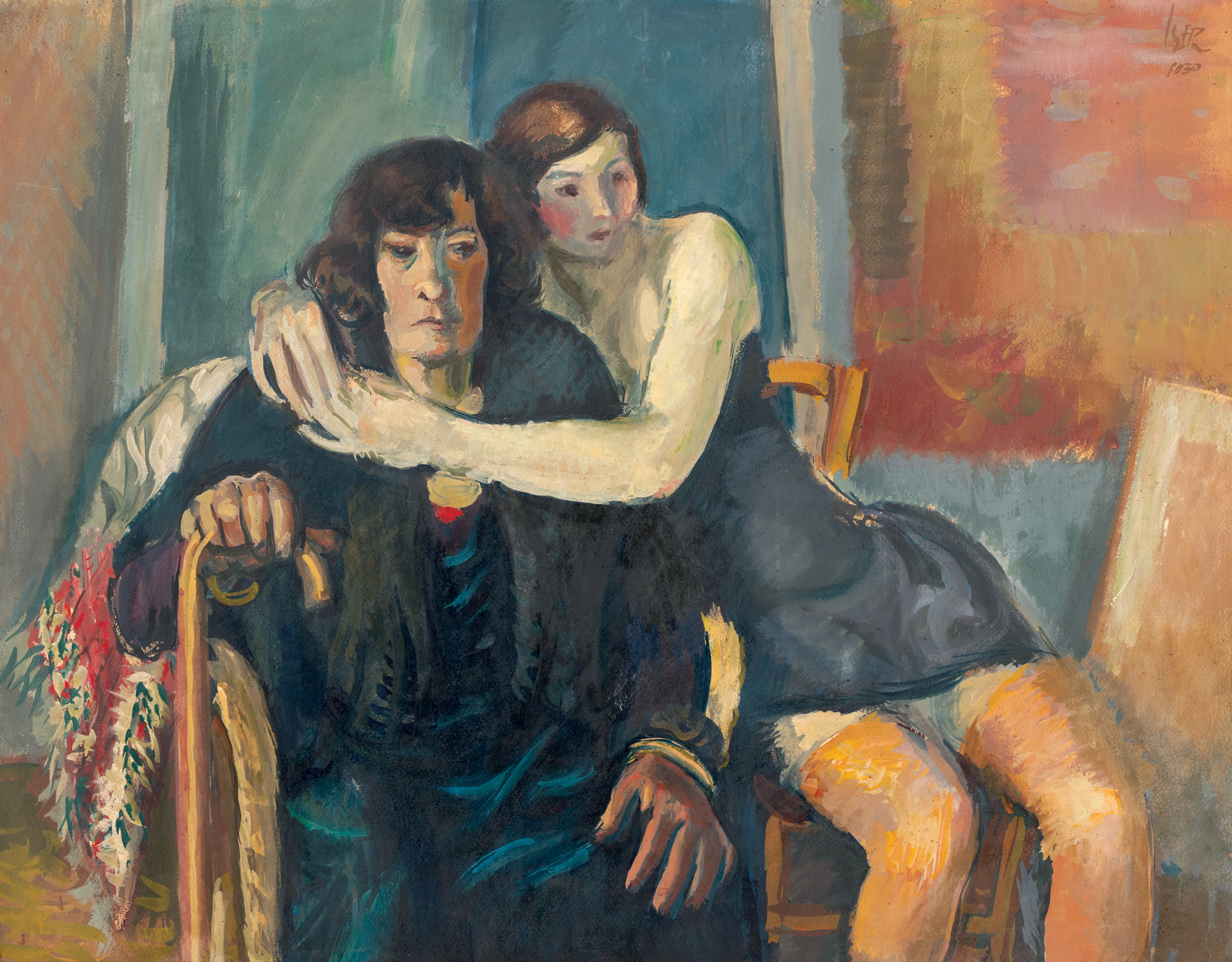 Anul 1930 îl găsea pe Iosif Iser într-un lung peregrinaj european întreprins alături de soția sa, Desirée Sterian Iser. Cei doi călătoreau la München, Paris și Spania – acesta din urmă fiind unul dintre locurile preferate de artist și intens transpus în creația sa. În 1931, aflat la Paris, Iosif Iser participa la principalele manifestări artistice ale vremii; ba chiar organiza și o expoziție personală la Galeria Drouet din capitala franceză. Realizată în aceeași perioadă, opera de față ne introduce în universul intim al pictorului, un univers în care regăsim, cel mai probabil, o cordială relație între două generații. Aceleași personaje devin subiectul operei omonime aflată în repertoriul Muzeului Colecțiilor de Artă din București. Reprezentate așezate, într-o strânsoare ce trădează relația apropiată, protagonistele lui Iser apar, și de această dată, în pereche (așa cum apăreau și odaliscele și tătăroaicele din zona Dobrogei și a Balcicului). Remarcăm deosebirile generaționale, dezvăluite prin vestimentația frivolă a tinerei și hainele lungi, mănușile și bastonul bătrânei. În cealaltă lucrare, muzele artistului pozează în picioare, lăsând să se întrezărească, de această dată, și mai mult caracteristicile care le individualizează. Această a doua operă amintește, parcă, de celebra ”Duas amigas” a lui Ernesto de Fiori. ”Modelele sale feminine – țărănci, odalisce, dansatoare, spaniole – exprimă uneori un fel de vrajă tristă, melancolică, pe care o receptăm nu atît prin expresia figurii, cît prin culoarea ce creează această atmosferă.” Avea să conchidă Paraschiva Glauber Pojar.