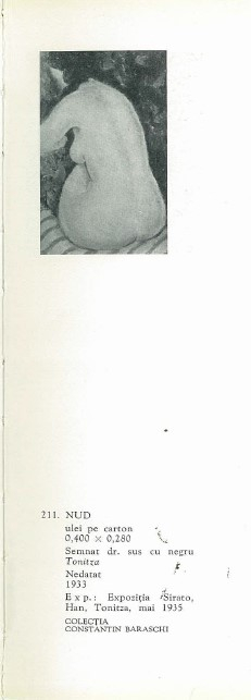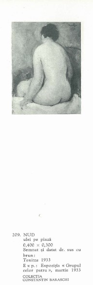 Voluptatea formelor și grația trupurilor sculptate pe pânză amintesc de personajele pictate de Gauguin în Tahiti, în timp ce chipurile prelungi și ochii migdalați fac trimitere la protagoniștii imaginați de Modigliani. Nudul va deveni o temă predilectă în creația sa în jurul anului 1926. Nudul capătă, totodată, statutul de pretext pentru studiu și statutul de laitmotiv al operei sale. În textele sale critice, Tonitza recunoaște și dezbate polemica apărută în epocă în jurul reprezentării nudului în artă. În Antichitate și Renaștere, reprezentanții curentelor artistice vor îndepărta veșmintele lui Eros, aducând în fața privitorilor natura sa umană. Eros va lua apoi forma amorașilor, care se vor transforma ulterior în îngeri și heruvimi. Înfățișați cu trupurile dezgolite, eroii operelor antice vor deschide calea familiarizării artiștilor și publicului deopotrivă cu un nou tip de artă. De la primii pictori români moderni, reveniți în țară de la studiile efectuate peste hotare și până în contemporaneitate, nudul a fost integrat în pictură și ridicat la rang de artă. Spre deosebire de sculptori, care și-au îndreptat atenția și asupra volumelor masculine, pictorii se vor concentra mai degrabă asupra idealizării proporțiilor feminine. Nicolae Tonitza se numără printre pictorii care ”au dominat prima jumătate a secolului XX și care au făcut din tablourile cu nuduri un gen independent al picturii”, după cum afirmă Mircea Deac; alături de Theodor Pallady, Gheorghe Petrașcu și Camil Ressu. În operele lor vom identifica figura ființei iubite, a unui model ori a unei personalități reputate. De obicei, modelul se confundă cu personaje din biografia artiștilor, astfel că îi va fi îngăduit să pășească atât în atelier, cât și în căminul pictorului. În economia creației artiștilor menționați anterior, nudul va beneficia de numeroase studii pregătitoare, desene și caroiaje. Aceștia vor dedica un timp îndelungat studiului anatomic iar transpunerea imaginii în ulei va fi realizată, în consecință, la finalul unei perioade generoase destinată cercetării și experimentelor. Situat dincolo de redarea veridică și extazul în fața motivului, Nicolae Tonitza își va surprinde muzele în iatac, șezând pe scaun, întinse pe divan; înfățișate frontal, din profil sau chiar din spate. Artistul posedă capacitatea de a reda expresivitatea corpului indiferent de ipostaza în care pozează modelul său. De cele mai multe ori, însă, redă atmosfera intimă și căldura interioarelor. Devine un observator atent, care sintetizează fidel trăsăturile muzelor sale, reinterpretându-le prin linii elegante. Surprinde atitudini distincte și conferă trupului o construcție simbolică. Personajele sale sunt prezentate adesea într-un contrast evident cu fundalul. Deși optează de cele mai multe ori pentru o cromatică neutră, folosește tonuri puternice și contururi în nuanțe închise. Interesul pentru natură și auspiciile traiului cotidian sunt transpuse în liniștea intimă care cuprinde arabescurile decorative ale liniei. Distingem, și în opera de față această predilecție pentru fundaluri în nuanțe închise, în care surprindem atmosfera rece și duritatea peretelui din planul din spate. Catalogul expoziției retrospective organizată în anul 1964 ne aduce la cunoștință mai multe opere aparținând acestui ciclu extins. De la cadre largi la planuri-detaliu, protagonistele lui Tonitza sunt redate în ipostaze variate, însă regăsim în cadrul acestei teme o serie mai restrânsă dedicată exclusiv personajului feminin redat cu spatele. În scrierile sale despre artă, Tonitza aduce în discuție problematica receptării nudului în arta autohtonă, făcând referire la reticența și puritanismul manifestat de unii privitori. ”Cine se lasă cucerit în fața unui nud de voluptatea cărnii și nu de voluptatea de a picta – ratează”, avea să remarce artistul, astfel că după însușirea preceptelor academismului münchenez și a învățăturilor de la Belle-Artele din Iași, va stăpâni anatomia umană și va prelua tematica în creația sa.