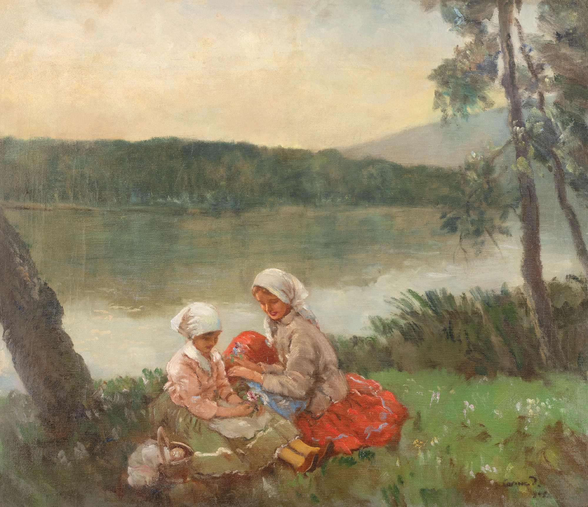 Pictura lui Janos Czencz abundă de scene surprinse în plein-air, în care protagoniste sunt țărăncuțele cu baticuri și rochii lungi, așezate pe pături, ori chiar direct pe iarbă. Florărese elegante sau odalisce cu șaluri colorate și șalvari devin personajele recurent din opera artistului. Czencz va urma cursurile Academiei de Arte Frumoase de la Budapesta, în perioada 1907-1912, iar activitatea sa va fi recompensată prin numeroase premii care atestau calitățile sale plastice. Pictorul se va bucura de foarte multe expoziții personale, iar în prezent multe dintre operele sale pot fi admirate în cadrul casei memoriale de la Pecz, Ungaria. Operele prezente pe simeze ne relevă, așadar, interesul pentru scenele de gen – de la pescuit la treburi gospodărești, ori chiar băi de soare. În opera de față, însă, artistul ne indică peisajul, cu lacul, și pădurea, dar se îngrijește să insereze și cele două personaje, cu basmale și veșminte lungi, viu colorate, pete de culoare specifice stilului său.
