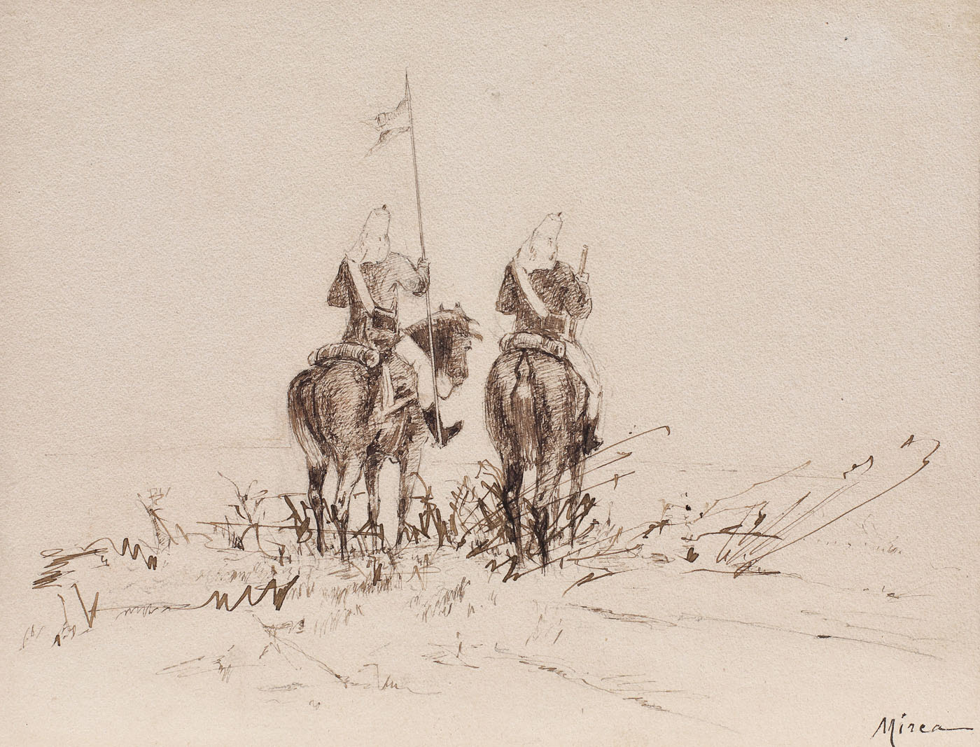 semnat, datat şi intitulat dreapta jos, cu negru, "Mirea, 1877, Vedetă de cavalerie"