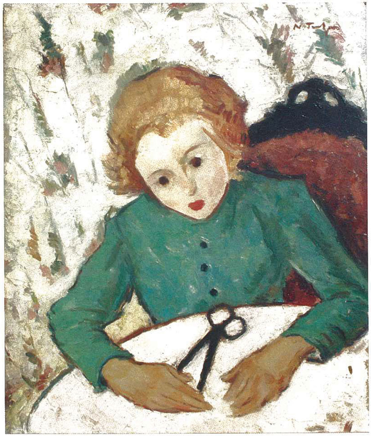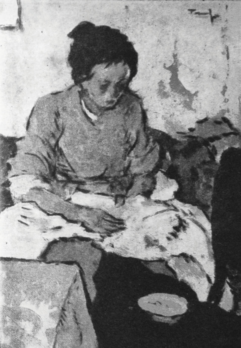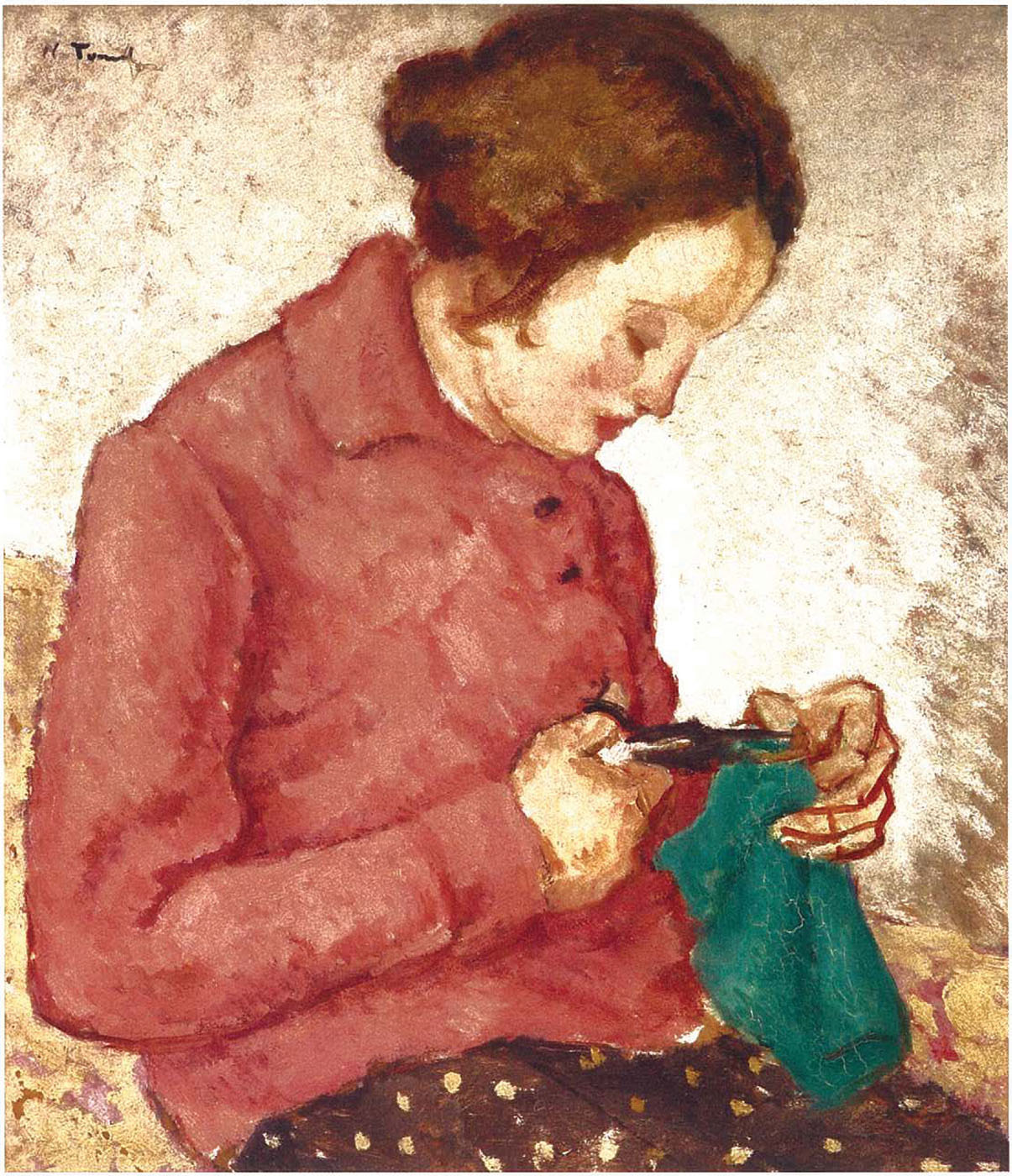 Sensibilă, luminoasă și virtuoasă prin teme și cromatici, opera maestrului Tonitza este împletită adesea cu fragmente desprinse din realitățile sale cele mai apropiate. Astfel, viața se împletește cu creația sa, influențându-i și inspirându-i instinctele. Redusă ca dimensiune, lumea lui Tonitza este alcătuită dintr-o galerie de ființe nevinovate pe care le alege din universul său intim, copiii din jurul său și femeia, constantă în opera sa. Reprezentarea și contemplarea ei va fi una din temele dezbătute de artist pe tot parcursul activității sale. La Balcic, în iatac ori în interioarele propriei locuințe, femeia va rămâne un subiect predilect în creația sa, pe care o va evoca atât prin desen, cât și prin pictura sa. Perioada petrecută la Vălenii de Munte alături de membrii familiei sale a însemnat pentru Tonitza prilej de observare și studiu, copiii și soția regăsindu-se adesea în reprezentările sale. Îi surprinde de multe ori pe neașteptate; pe copii, la joaca de zi cu zi, când dorm ori când se supără și plâng iar pe soție o surprinde adesea pregătind mâncarea, măturând ori cusând o hăinuță agațată la joacă de cei mici. Pictura de la Văleni primește astfel valori intimiste, cele mai multe lucrări realizate aici luând naștere în interiorul căminului său, peisajului exterior primind mai rar atenția sa. Multe din operele sale realizate în acest spațiu vor reprezenta proiecții ale traiului de zi cu zi, precum se înfățișează înduioșătoarele kinderszene ori scenele interioare care o au în prim plan pe stăpâna casei, surprinsă în diverse activități domestice, precum și cea în care ia numele de Cusătoreasă. Soție și mamă a trei copii, personajul este reprezentat în atmosfera intimă a căminului său, prilej propice pentru artist. Părul, aranjat într-un coc auster, încadrează chipul mamei grijulii care se îngrijește de toate sarcinile casei. Într-o manieră ușor carizaturizată, figura soției este sugerată prin detalii liniare subtile, înviorate de ușoare accente de roșu. Deși au la bază un studiu preliminar, realizat pe viu de către artist, majoritatea picturilor sale iau naștere din memoria artistului, așa cum el însuși ne mărturisește, care după ce realizează studiul, îl distruge pentru ca apoi să poată crea liber, conform cu interpretarea sa interioară. Pe lângă viziunea sentimentală, curentă în creația sa, preocuparea artistului pentru rezolvarea plastică va fi prioritară celei dintâi. Din mărturiile sale aflăm că peisajele și portretele pe care le realiza erau săvârșite după studii mărunte, prelucrate apoi pictural, fără model, ajutându-se de memoria culorii, care devenea una din virtuțile sale. Ceea ce îl interesa cel mai mult însă era culoarea, culoarea limpede și înaltă cu care își îmbrăca ființele plăpânde. Figurile, interpretate ca planuri și interpretate pictural, nu dobândesc adâncime în perspectivă, apropierea planurilor obținute prin abrevierea perspectivei și decantarea formelor oferind personajelor o certă impresie de monumentalitate. Uneori culoarea este umbrită de alte culori, luminile și umbrele fiind obținute prin gradarea aceluiași element cromatic, de unde se remarcă o calitate picturală insolită, născută din alăturarea diferitelor valori de nuanțe. Caligrafierea liniei, realizată cu o impresionantă iscusință rezumă calitățile deosebite ale artistului de a reda caracterul uman, reușind să surprindă sentimentul interior pe care îl năzuiește ființa contemplată. Lirismul și candoarea sensibilității sale ne dezvăluie o manieră sinceră de a reda realitatea, propunând teme ce aparțin umanului, artistul fiind mereu călăuzit de o viziune caldă, duioasă. Tratată în interiorul propriului cămin, tema intimă a reprezentat prilej de propășire a talentului său de colorist, dezvăluind o cromatică de asemenea intimă. Imaginea cusătoresei va fi interpretată de artist și cu altă ocazie, în anul 1924, în cadrul unei expoziții colective, când figura cu o lucrare pe aceeași temă, încadrată de artist în categoria „obosiților”, denumire oferită de artist și altor schițe ce surprindeau scene laborale, precum și scene pe tema copilului. (G.M.)