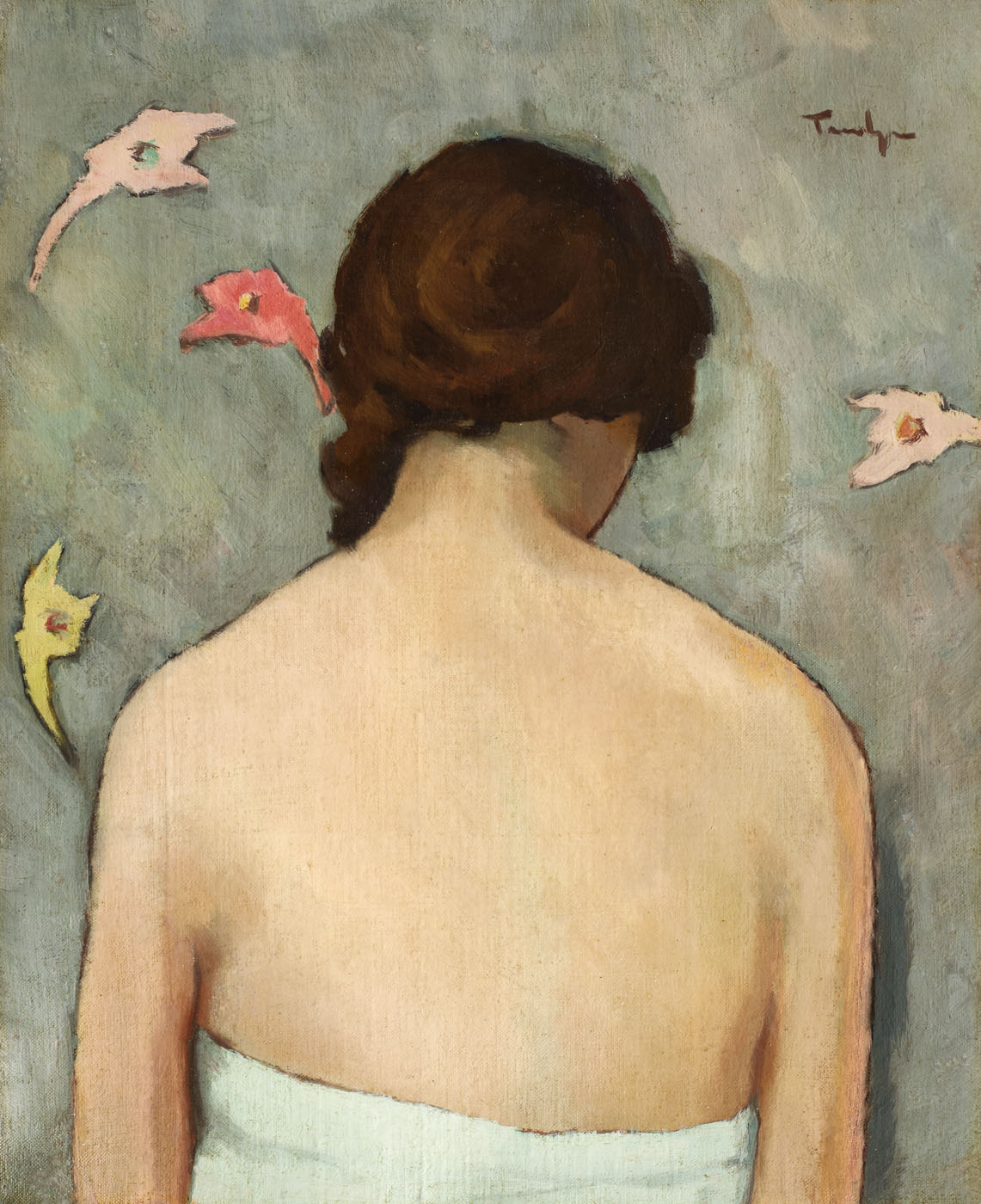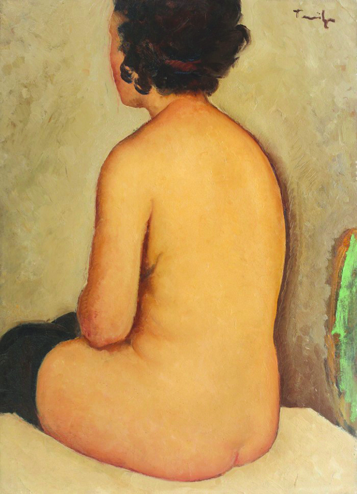 Reintrodus în artă de pictorii Renașterii, nudul a reprezentat o temă de mare interes în arta universală, fiind interpretat ca imagine a purității și a adevărului, a frumuseții, a grației și a virtuților omenești. Dintre cel două genuri, nudul feminin va fi cel mai adesea reprezentat, femeia fiind imaginea conceptului de frumos, grație simetriilor și proporțiilor armonice, trăsături ce îi sunt evidențiate în mod firesc. Introdusă ca subiect de studiu și în academiile de belle arte românești, tema nudului va prelua modelul școlii franceze ce oferea noi semnificații și interpretării acestei reprezentări artistice. În peisaj, în natură, sub lumina solară sau în interioarele atelierelor artiștilor, nudul își va găsi locul și sensurile. În arta românească introducerea nudului este remarcată la artiști precum Nicolae Grigorescu, care îl va interpreta la început în peisaj, urmat apoi de artiștii Nicolae Tonitza, Theodor Pallady, Gheorghe Petrașcu sau Ion Țuculescu, care vor trata tema adesea. Dintre reprezentanții prolifici ai temei nudului cel mai mult se vor remarca Theodor Pallady și Nicolae Tonitza, care vor trata tema la un nivel nu exterior, ci unul interior, interpretând nudul și găsindu-i semnificații lăuntrice. În cazul celui din urmă, tema nudului va avea întotdeauna înțelesuri picturale, interesele exprimate de artist fiind statornic îndreptate spre grație și culoare. Cromatica devine pentru artistul Tonitza izvorul cel mai bogat al operei sale, pe care o va supune unei atente și stăruitoare cercetări și pe care o va utiliza pentru a-și duce la realizare crezul său asupra umanului, ce constituia centrul de interes al creației sale. Pentru acesta, pictura însăși era aproape în totalitate culoare. De la prima, până la ultima analiză, Tonitza înțelege culoarea ca mijloc de expresie a diverselor sentimente umane, care se întâmplă în funcție de ceea ce artistul alege să exprime, oglindind limpede, de la prima vedere sentimentul de bază pe care este clădită întreaga operă. Culoarea prinde astfel viață doar în mâinile artistului care o învie, alegându-i atent nuanțele și așternându-le pe pânză, făcând-o să grăiască în adevărate game ale sufletului. Desenator virtuos, cu o mână exersată la clasele de accademie, artistul se deprinde cu redarea corpului uman, analizându-i volumele, proporțiile, măsurile, dinamica și plasticitatea dar mai ales îi descoperă armoniile, cărora le va da noi interpretări în creația sa. Studiile sale acordate nudului sunt interpretări ale unei feminități pure, contemplate cu fascinație de către artistul ale cărui interese erau trăsăturile interioare transpuse printr-o cromatică sinceră. Contemplarea sa este calmă, realizată cu încântare din prisma cromaticii luminoase pe care o putea observa și înțelege. Nu copiază natura pe care o are în față, nici nu încearcă să o imite într-un anume fel, ci alege să îi recompună formele în corespondențe cromatice și în luminozități pe care le surprinde liber, fără constrângeri. Surprinse în iatac- locul primelor reprezentări ale temei, în intimitatea căminului sau la Balcic, nudurile sale ne oferă imaginea interpretării sale particulare, poziționând întotdeauna culoarea pe scara valorilor sale picturale. Când pictează nuduri, Tonitza jonglează cu tușele în planuri largi, evitând astfel anatomiile perfecte, detaliu ce explică și predilecția sa pentru reprezentarea torsurilor, surprins adesea din spate și asupra căruia artistul își concentrează atenția asupra luminozităților tonale. Interpretarea vibrantă a epidermei, conturată de artist prin detalii de linii fine, încadrează personajul într-un fundal aproape mat, într-o singură nuanță dominantă. Alteori acordă fundalului o atenție specială, inserând mici detalii decorative, de forme idealizate, cromatice, armonizându-le cu celelalte tonuri. Practica picturii sale, și în cazul studiilor de nud este realizată de obicei din memorie, de unde putem interpeta că prezența elementelor decorative din fundal sunt rodul unei imaginații creative pe care artistul le adaugă atunci când pictează din amintire. Desprinsă din sfera umanului, tema nudului, propusă de artist începând cu anul 1926 va revela trăsăturile senzitiviste ale interpretării sale artistice, dezvăluind o manieră contemplativă de a interpreta viața ce i se desfășura în juru-i și din care artistul făcea parte cu toată ființa sa. (G.M.)