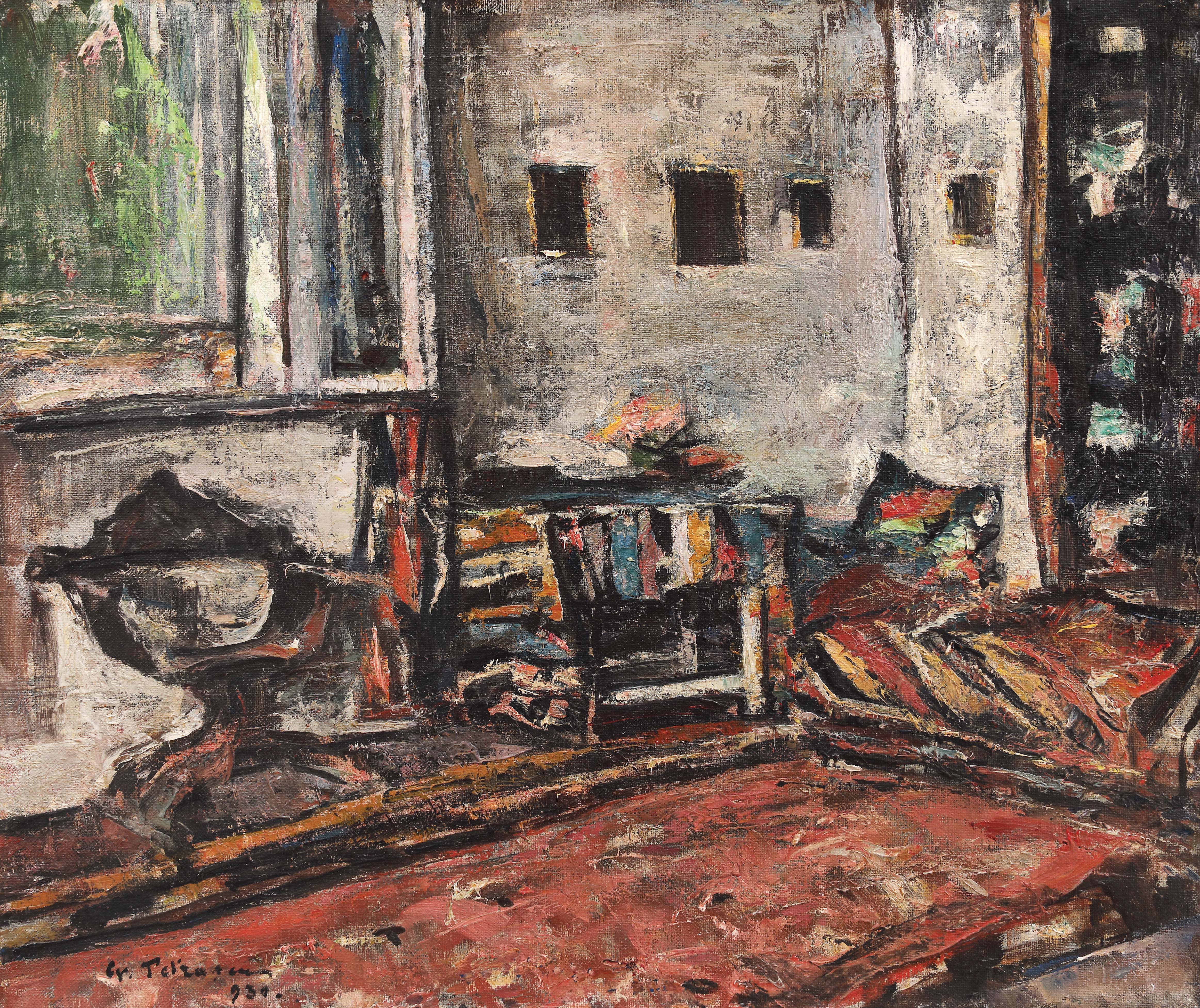 În atelierul de la Târgoviște, pe care îl construiește în primăvara anului 1922 și unde va lucra aproape douăzeci de ani, începând cu anul 1924, când se retrage în acest orășel lipsit de gălăgie, Gheorghe Petrașcu avea să își găsească liniștea necesară pentru a crea. Când nu lucrează în atelier, pictorul este întâlnit deseori plimbându-se pe străzile micului oraș, alături de copii și de soția sa, pe care și portretizează cu dese ocazii, putând fi observat de asemeni și în preajma ruinelor Curții Domnești, unde își așeza adesea șevaletul pentru a lucra în aer liber. Atelierul devine încă din anii '20 și sursă vizuală, camerele acestuia fiind pictate fie ca suport vizual, pentru compoziții cu personaje, fie de sine stătătoare, drept compoziții de interior.