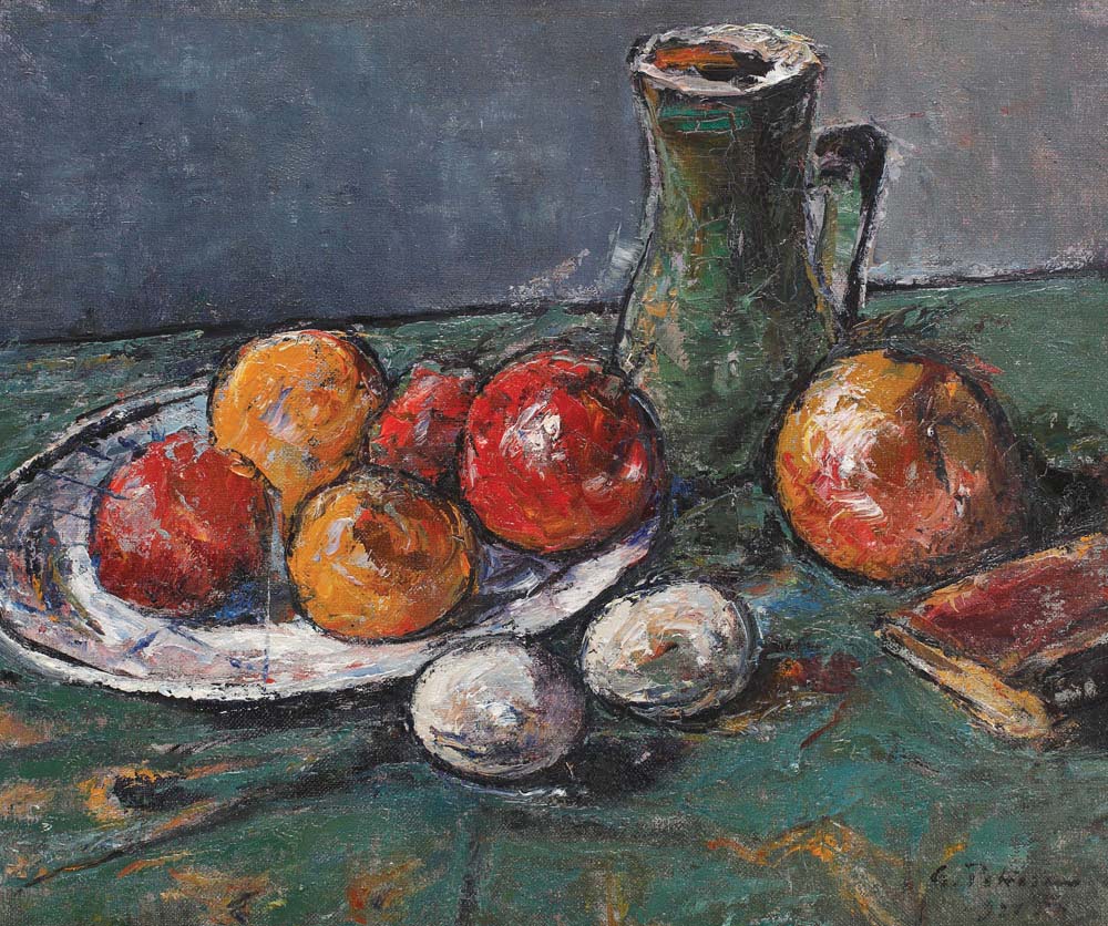 Concentrându-și creația pe un registru tematic restrâns, artistul Gheorghe Petrașcu realizează o artă a concretului, care irumpe din realitatea mediului cotidian, din locurile pe care le vizitează sau din contactul pe care îl are cu cei în jur. Va stărui cel mai adesea asupra universului domestic, intimist, în cadrul căruia vom întâlni interioare, portrete, nuduri, naturi statice sau flori. Admirabil maestru al culorii, Petrașcu va construi formele direct în culoare, materia căpătând sub penelul său o consistență inerentă și un puternic aspect tactil. Unul din genurile predilecte din perioada matură, răspunzând preferințelor sale asupra realității imobile va fi natura statică. Variată și savantă ca aranjament compozițional, acest gen va cuprinde în repertoriul său obiecte apropiate spațiului de atelier - cărți, flori, ulcele, fructiere, tingiri, borcane cu pensule - învăluite de artist într-un colorit sculptural prețios. (G.M.)