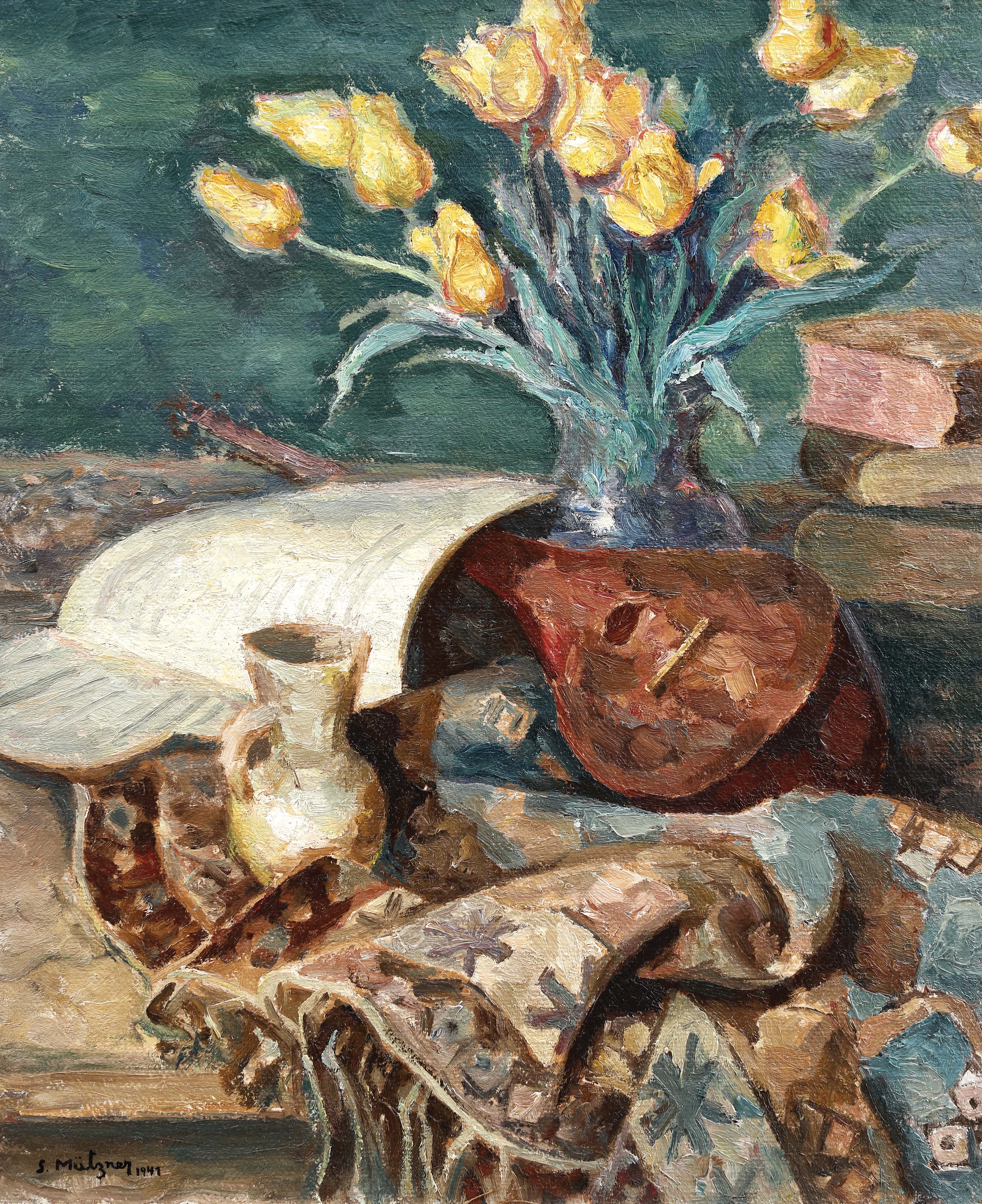 146. Natură statică cu lalele galbene și teorbă [1941]