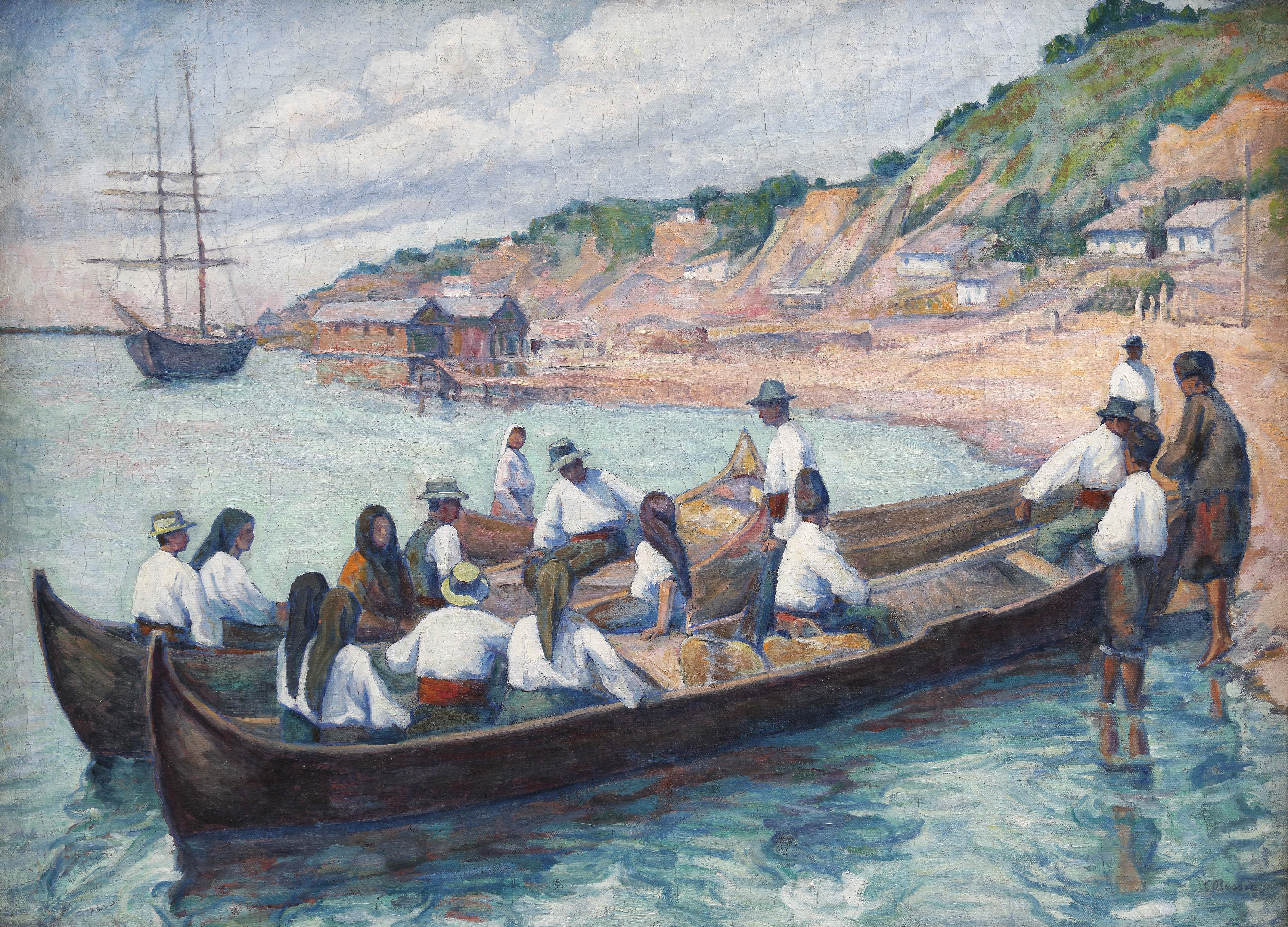 Opera a participat la prima expoziție personală a artistului, de la Ateneul Român, București, 1913, cat. 3. Opera a participat la expoziția retrospectivă itinerantă de la București (Sala Dalles), Târgu Mureș, Cluj, Galați, 1955, cat. 38. Opera este reprodusă în „La peinture roumaine au XXe siècle”, Edition en langues etrangeres, Bucarest, 1956, f. 34, sub titltul „Beteliers de Galatzi”. Opera este reprodusă în monografia „Camil Ressu”, Theodor Enescu, Ed. Academiei Republicii Populare Române, București, 1958, la p. 50, fig. 26, sub titlul „Bărci de țărani la Măcin”. Opera a participat la expoziția retrospectivă „Camil Ressu. Pictură și sculptură”, dedicată centenarului nașterii artistului, de la Muzeul de Artă al Republicii Socialiste România, București, februarie – aprilie 1982 și este reprodusă în catalogul expoziției la p. 120, cat. 24, sub titlul „Barcagii la Galați”. Opera este reprodusă în monografia „C. Ressu”, Theodor Enescu, Ed.Meridiane, București, 1984, fig. 154, sub titlul „Bărci cu țărani la Măcin”. Opera este reprodusă în articolul „L exposition retrospective C. Ressu, artiste du people de la R.P.R.”, Radu Bogdan, L'art dans la Republique Populaire Roumaine, nr. 10, 1995, la p. 60. Opera este semnalată în articolul „Camil Ressu”, K. H. Zambaccian, SCIA, nr. 3-4/1955, p. 170.