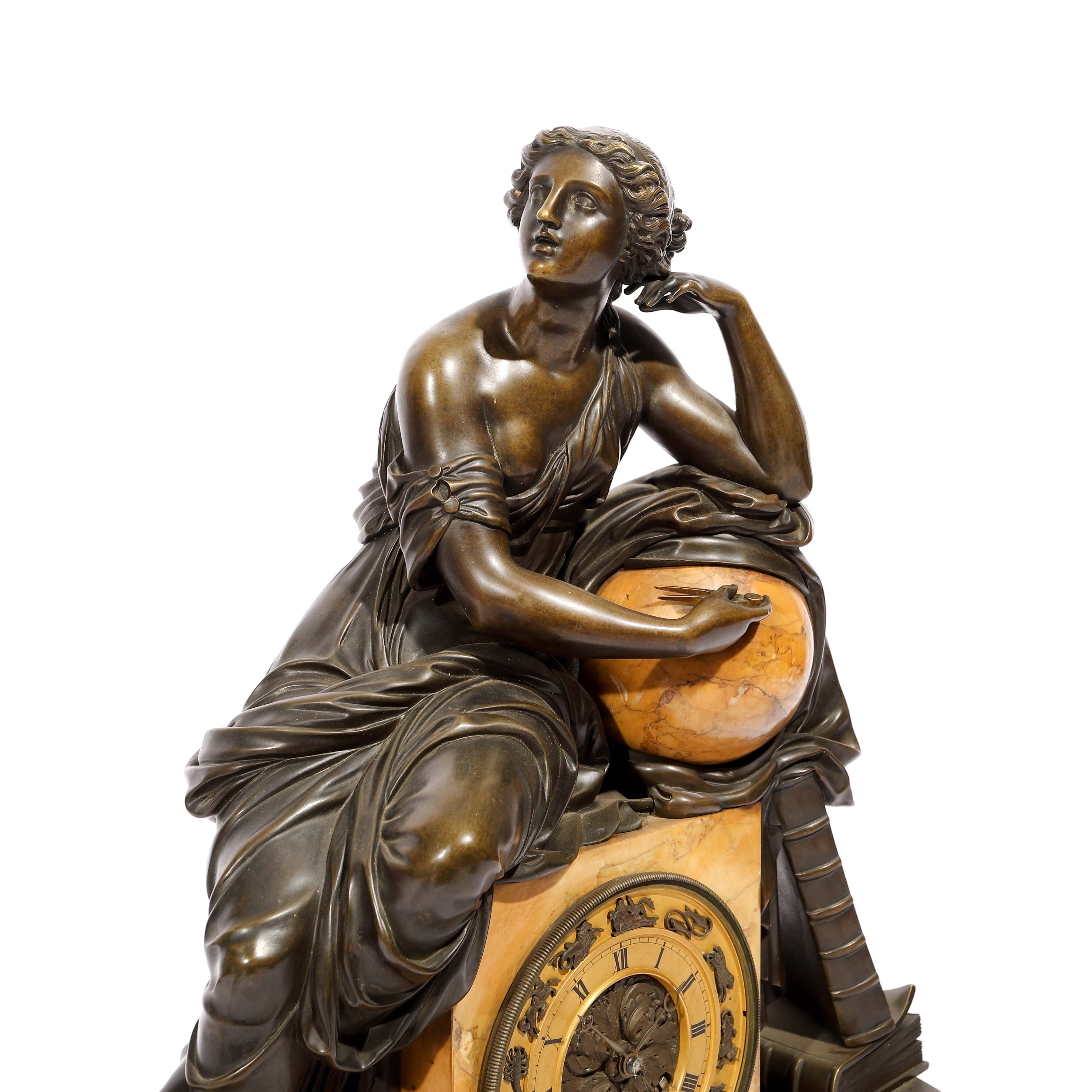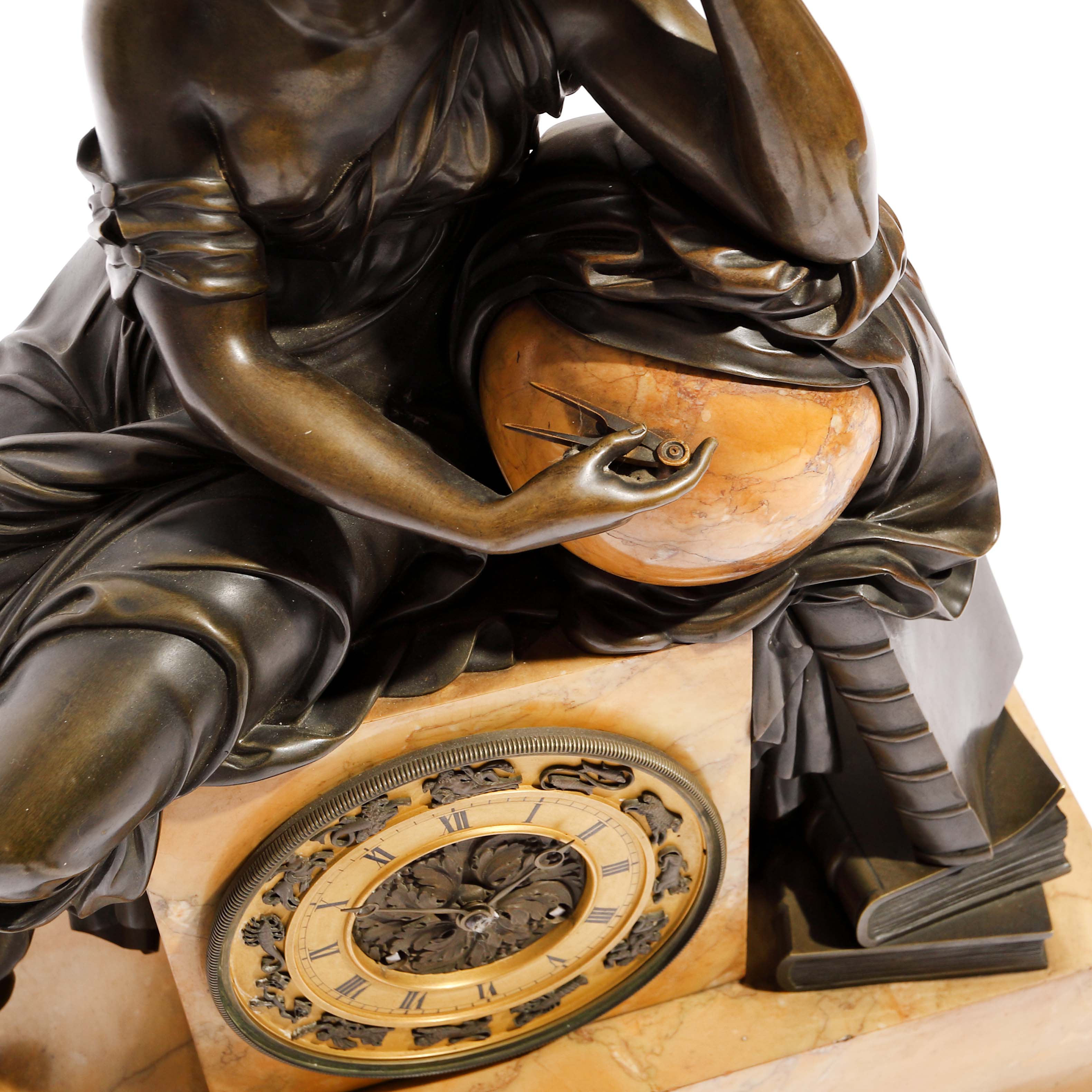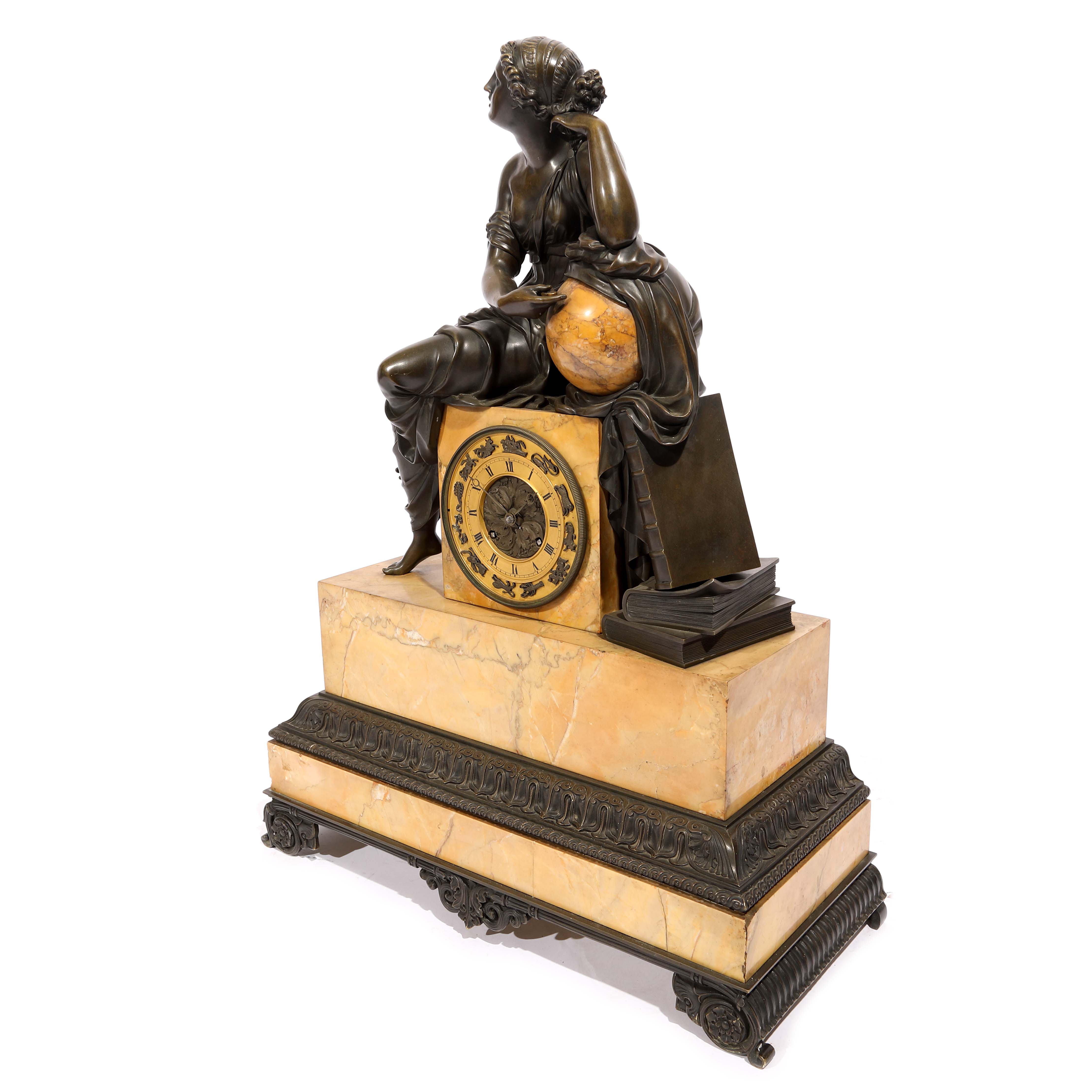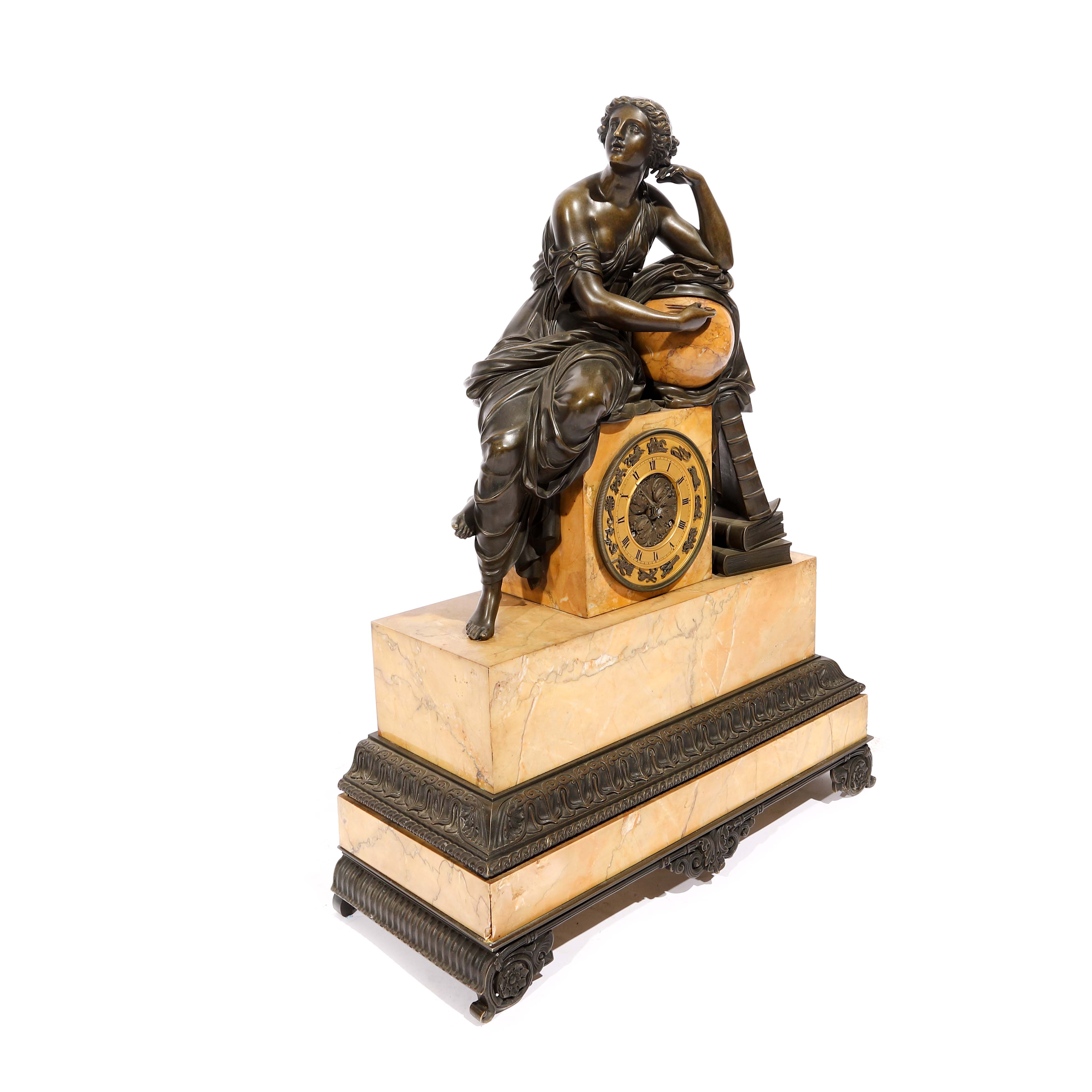 88. Ceas în stil Neoclasic din marmură și bronz, decorat cu silueta zeiței Urania, zeița astrologiei, cu cadran decorat cu semnele zodiacale, cca. 1825-1830