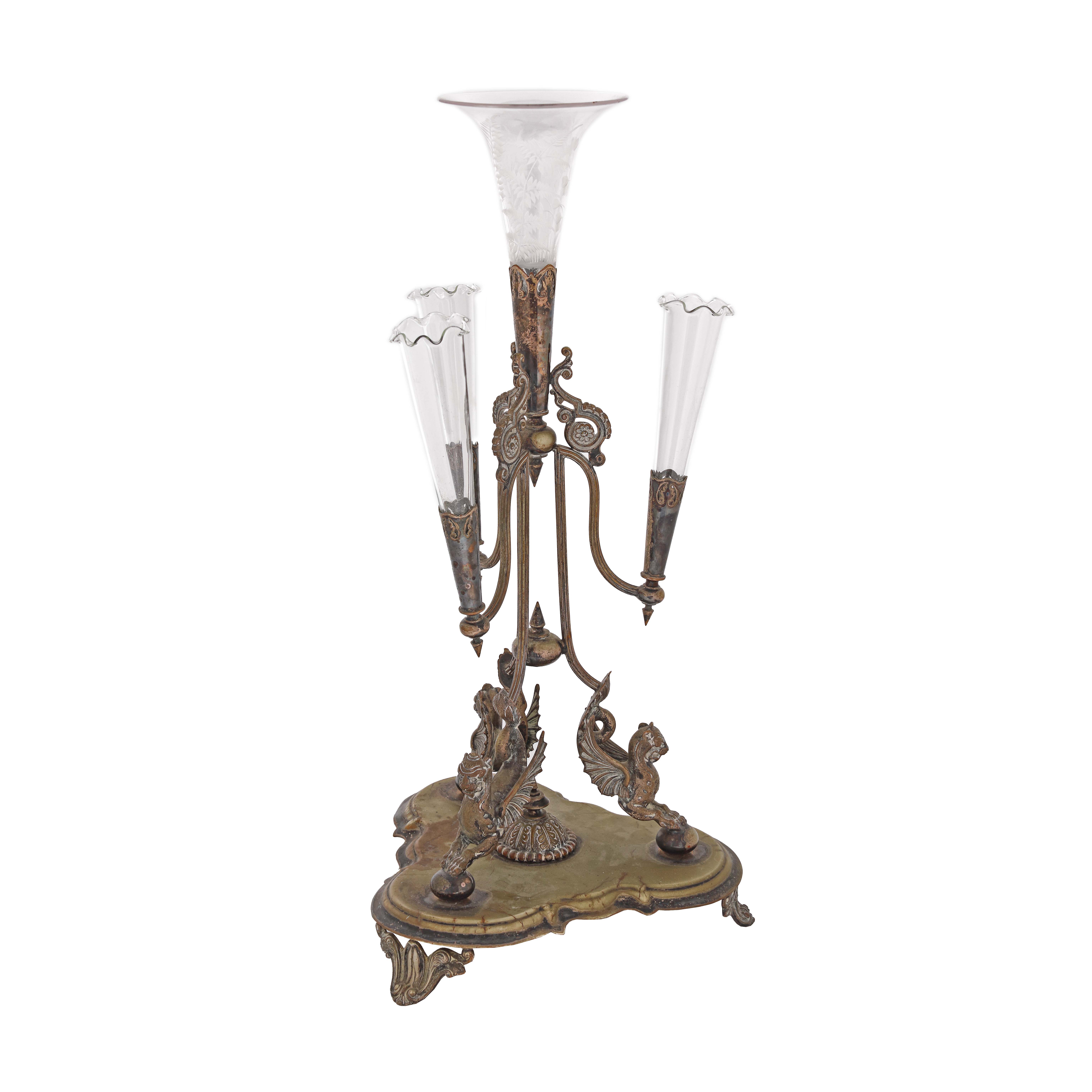 66. Centru de masă Walker & Hall cu trei brațe, decorat cu grifoni, a doua jumătate a sec. XIX, provine din colecția unui reputat istoric de artă din Constanța
