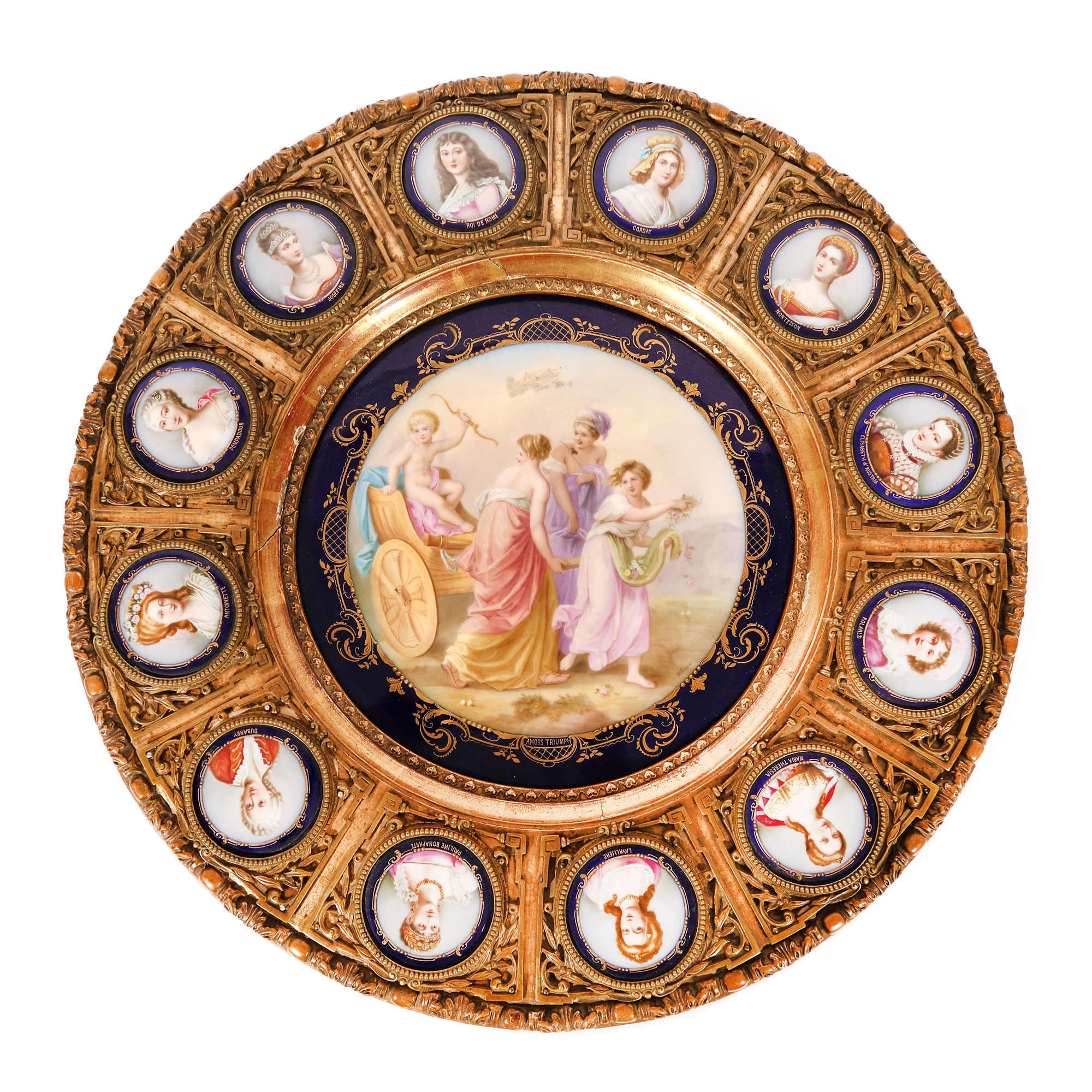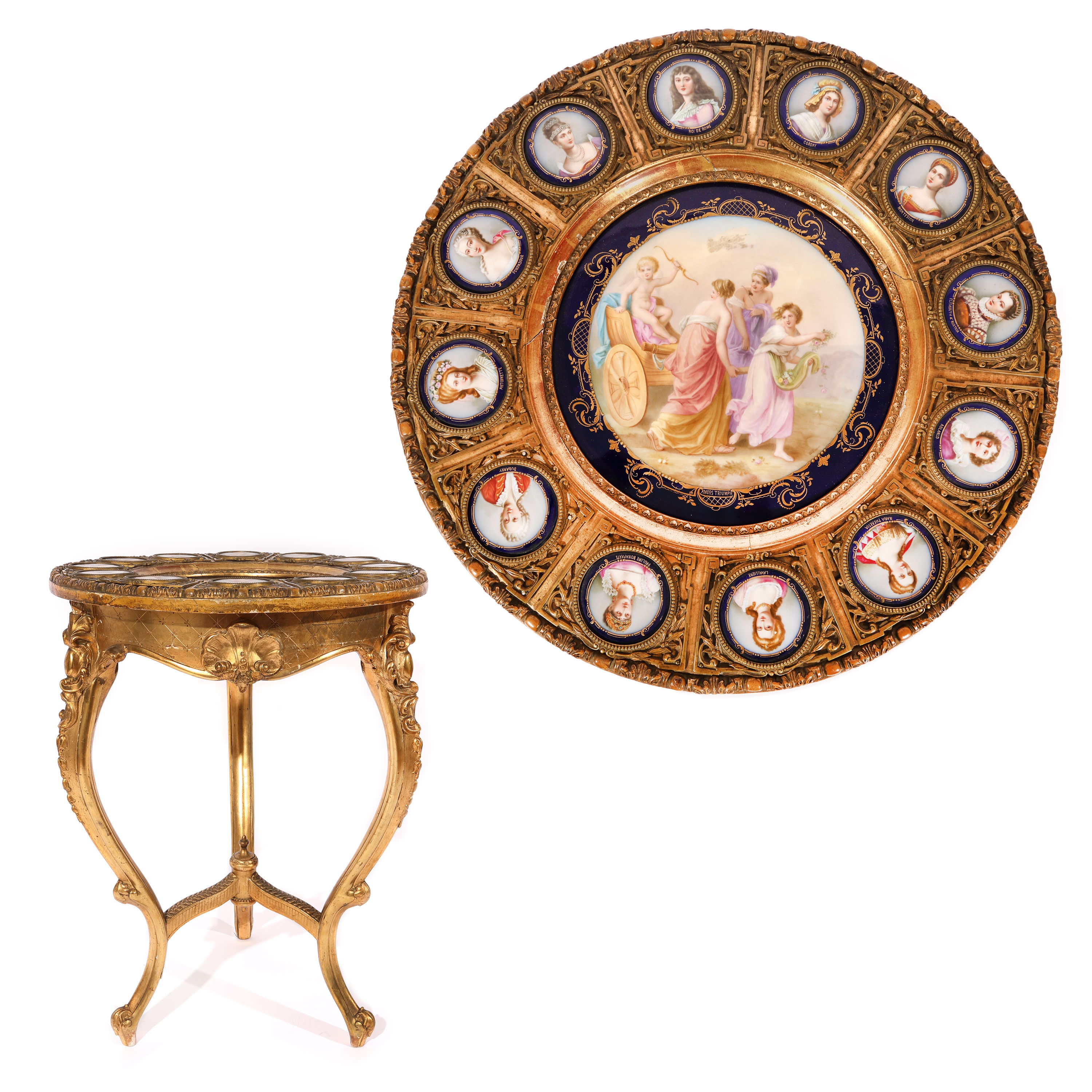 83. Gheridon în manieră Louis XV, fastuos ornat cu panouri din porțelan, scena centrală ilustrează "Le Triomphe De L’Amour", după Angelica Kauffmann și medalioanele înconjurătoare portretizează doamne celebre din epoca Iluminismului, sec. XIX