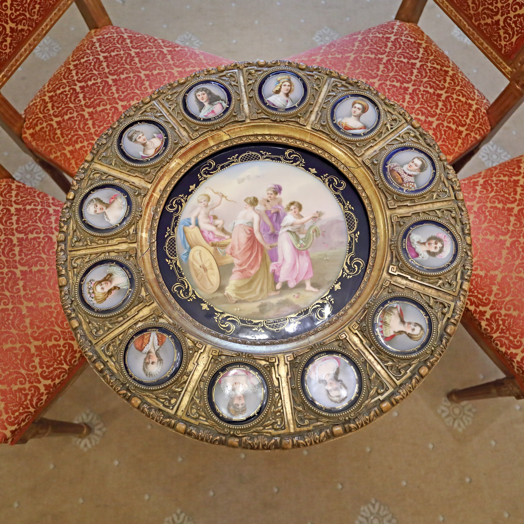 Medalioanele portretizează următoarele figuri istorice: Charlotte Corday, Charlotte Jeanne Béraud (Madame de Montesson), Elisabetta Amalia Eugenia di Wittelsbach (Elisabetta d'Austria), Joséphine de Beauharnais, Marie-Antoinette, Jeanne-Antoinette Poisson (Madame de Pompadour), Louise de La Vallière, Pauline Bonaparte (Borghese), Jeanne-Marie „Manon“ Roland de La Platière (Madame Roland), Maria Theresia, posibil Marie-Louise von Österreich (mama prințului Napoleon II - "Roi de Rome"). Gheridonul prezintă numeroase zone deteriorate, localizate atât la nivelul blatului și al centurii (crăpături) cât și al picioarelor, lipsind ornamente din structura de stuc.