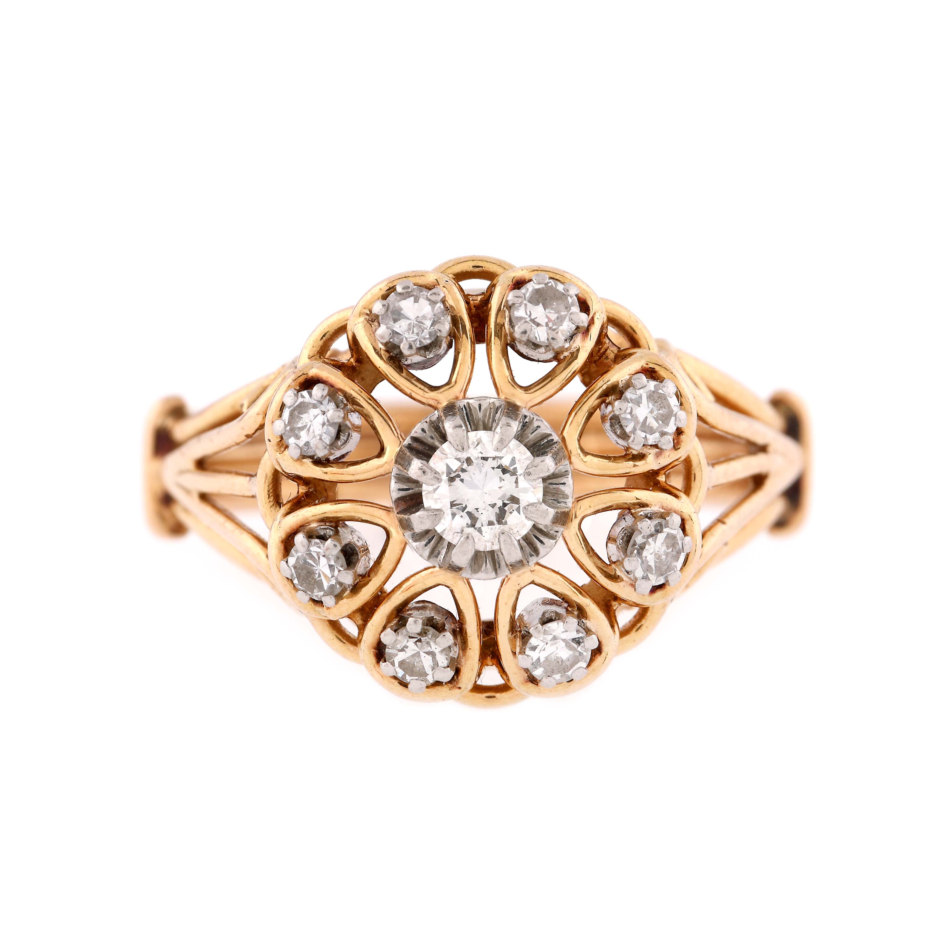 1 diamant rotund briliant, culoare H-I, claritate SI2, cca. 0,18 ct. și 8 diamante single cut, culoare H-I, claritate VS-SI, cca. 0,32 ct.