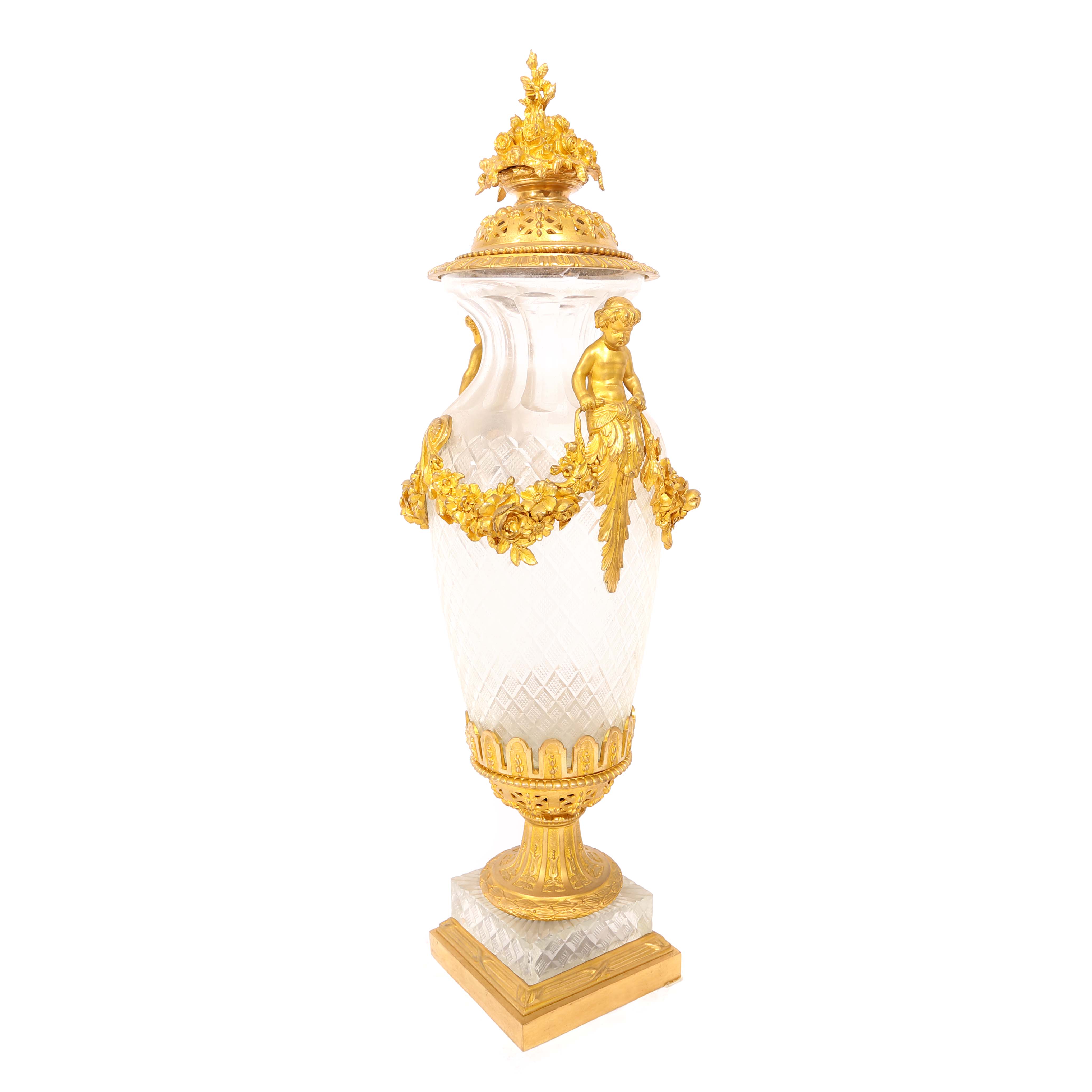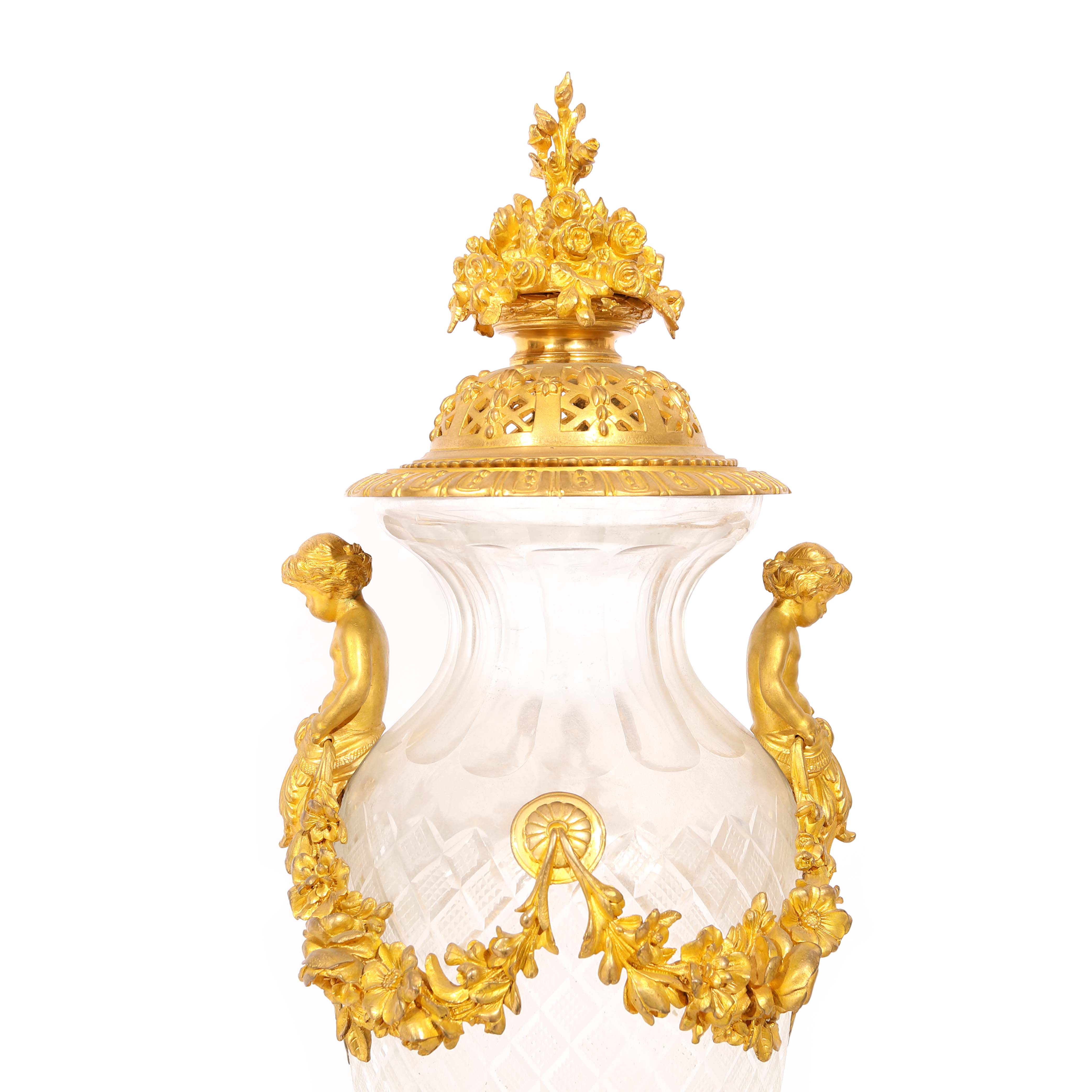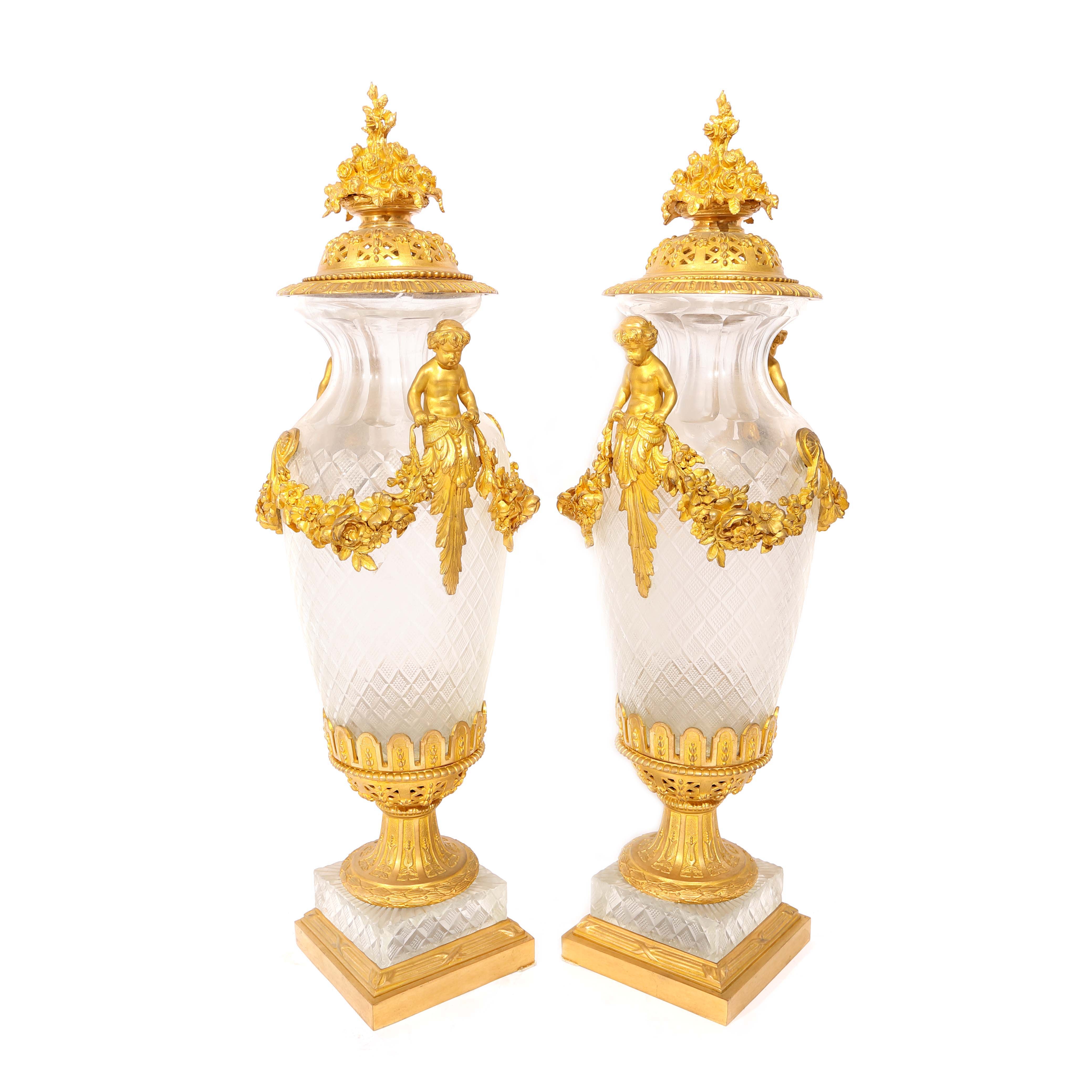 92. Pereche de vase de inspirație Louis XVI din cristal, cu montură din bronz aurit, decorată cu putti și ghirlade, sfârșitul sec. XIX