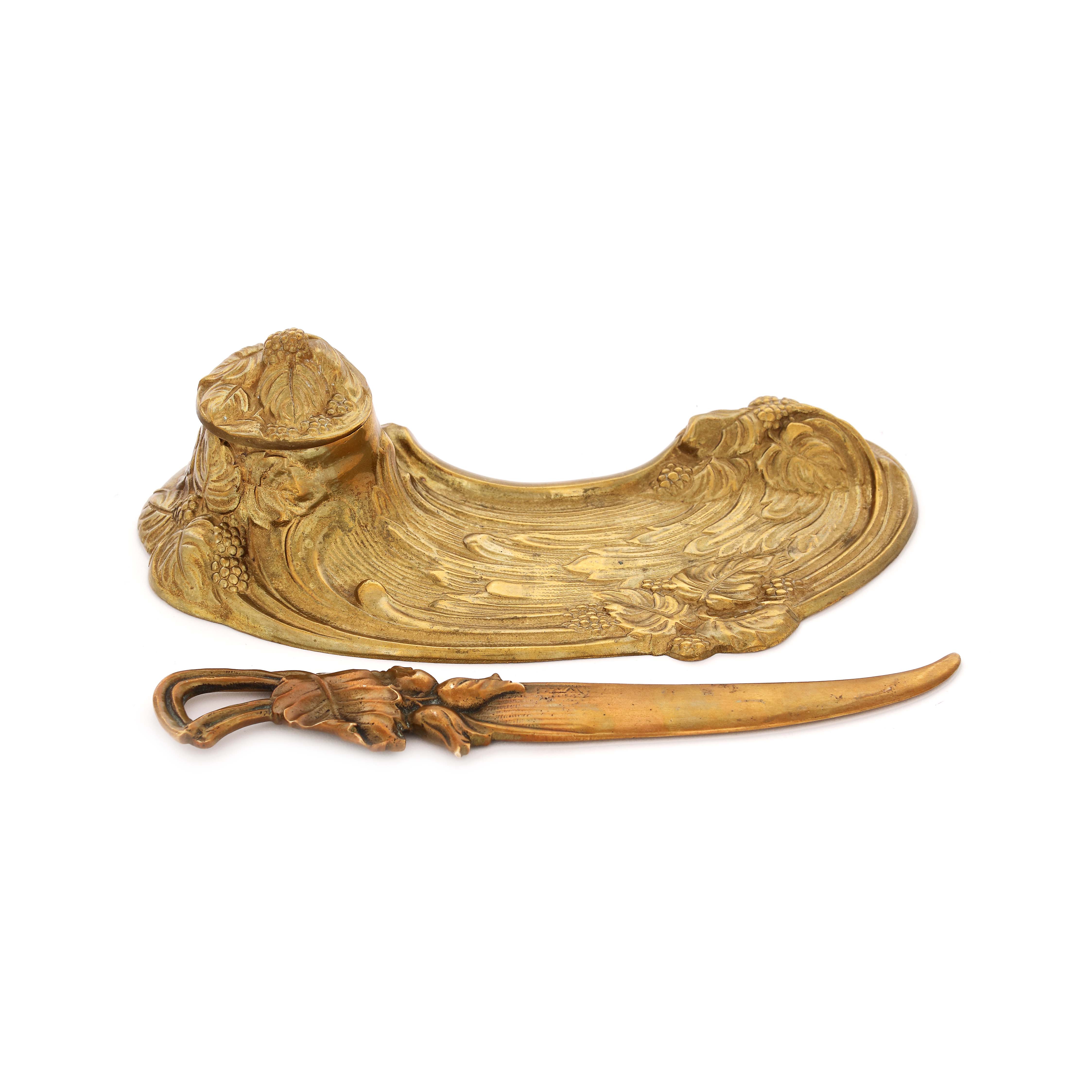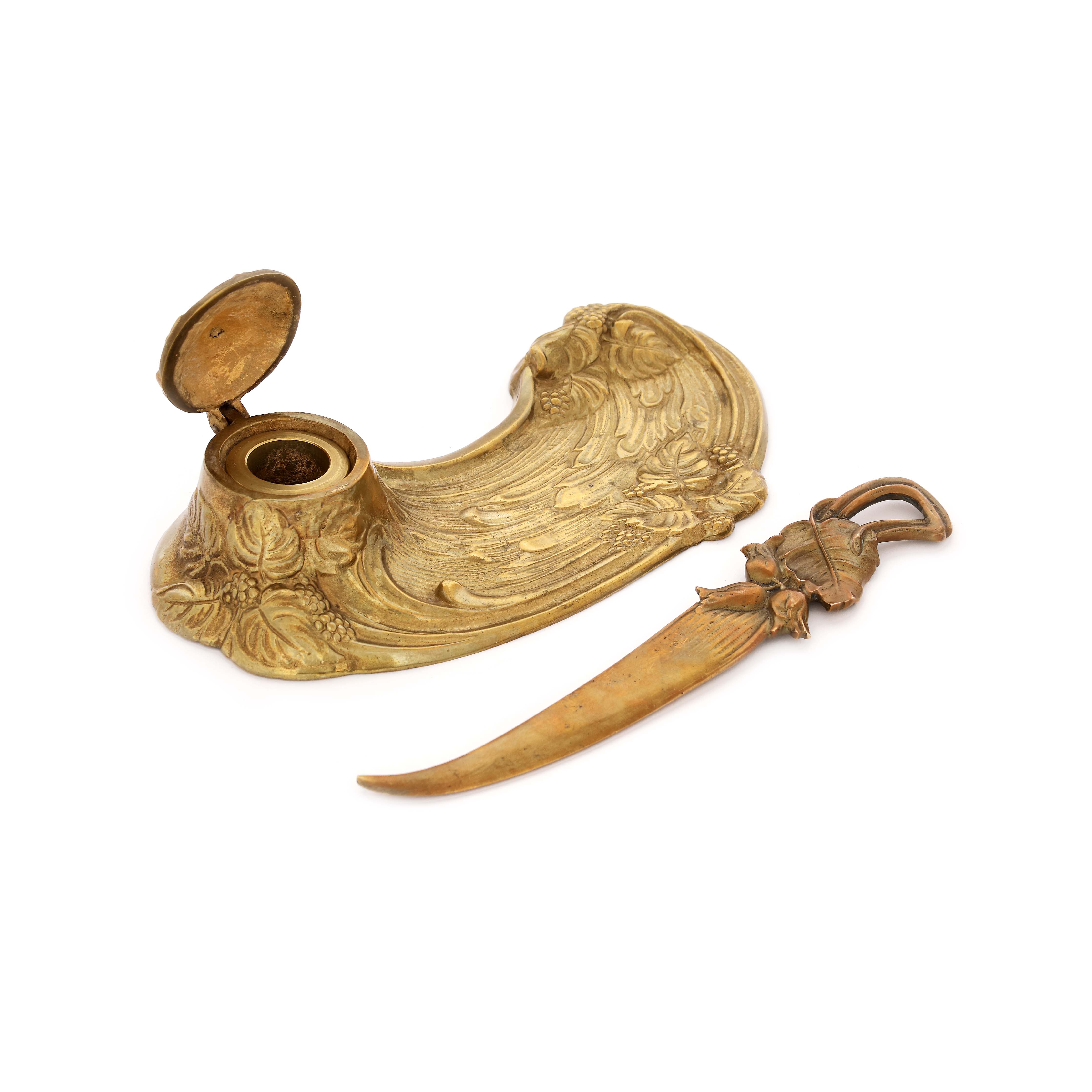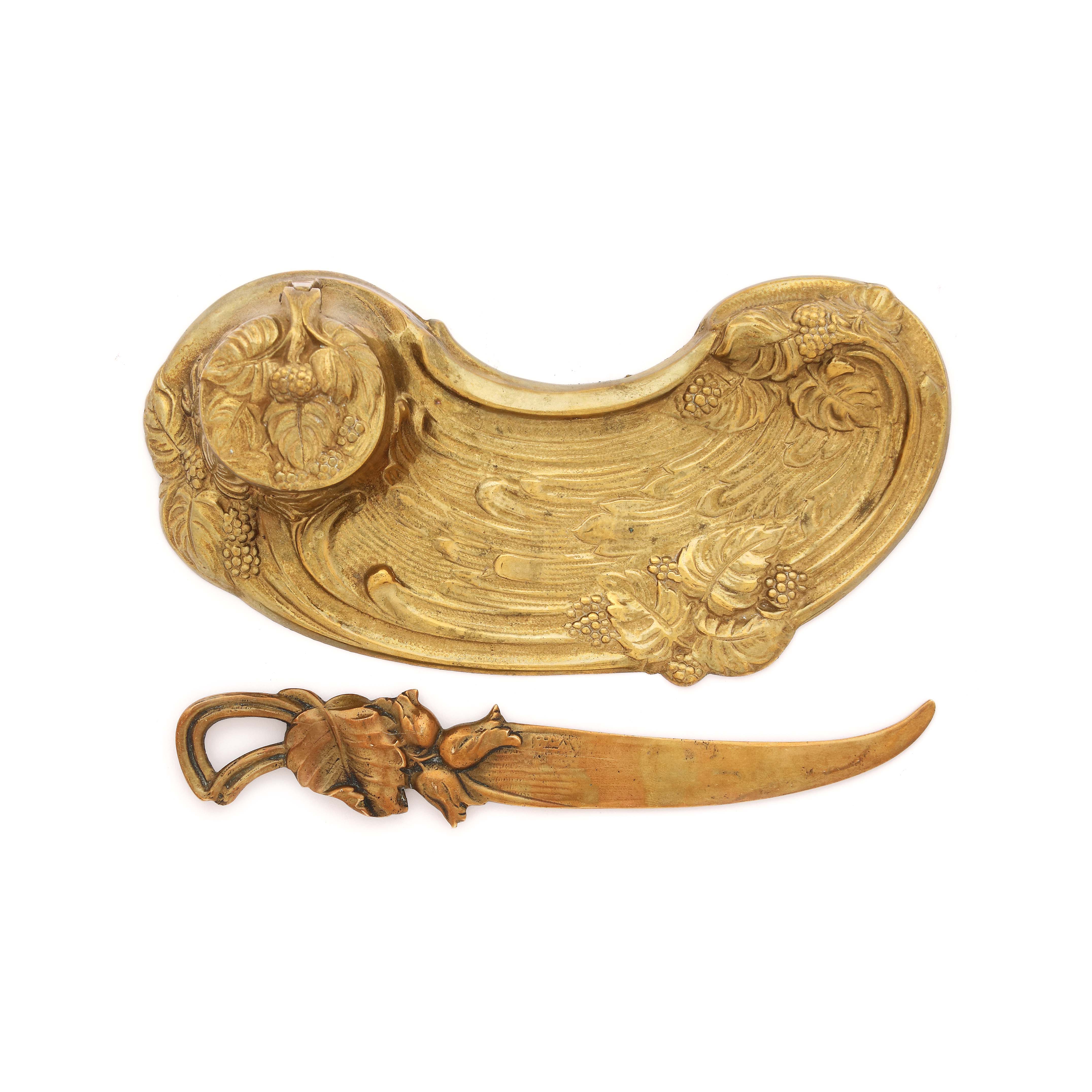 63. Set Art Nouveau format din encrieră și coupe-papier, din bronz, decorat cu elemente vegetale, cca. 1900-1905