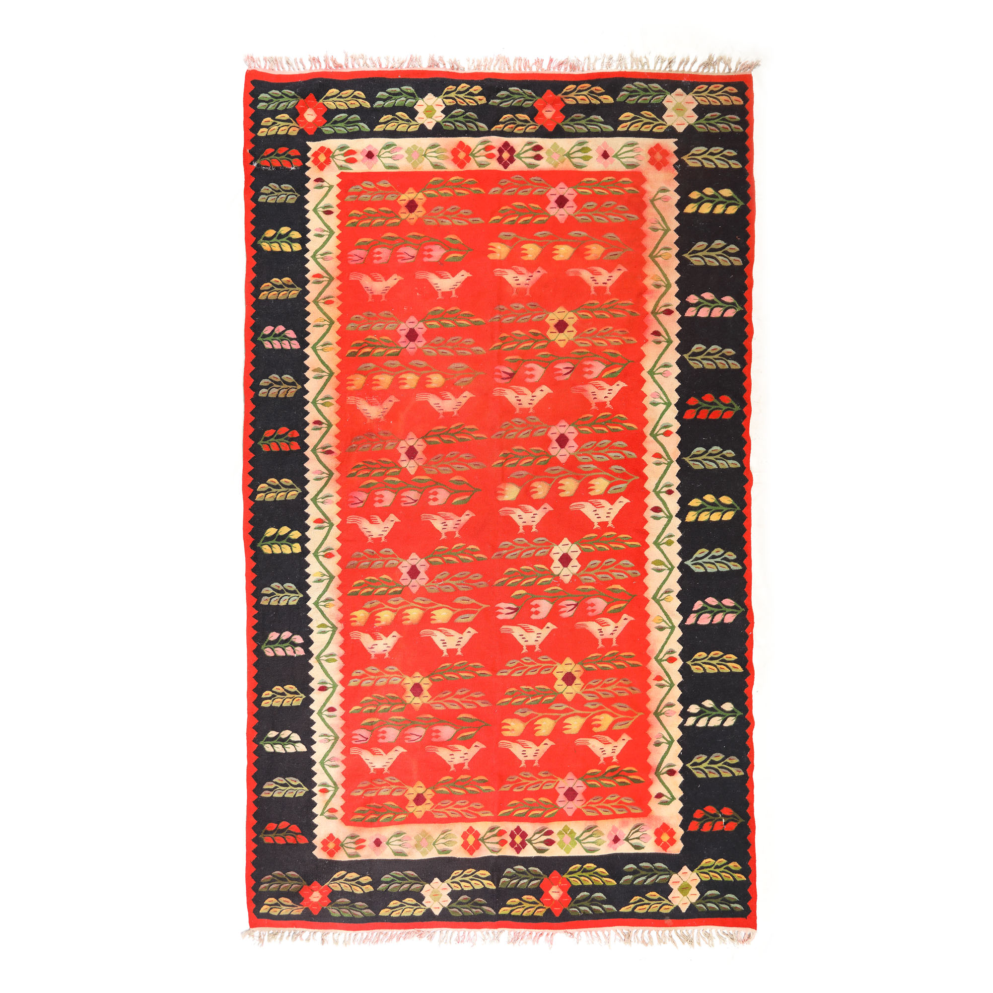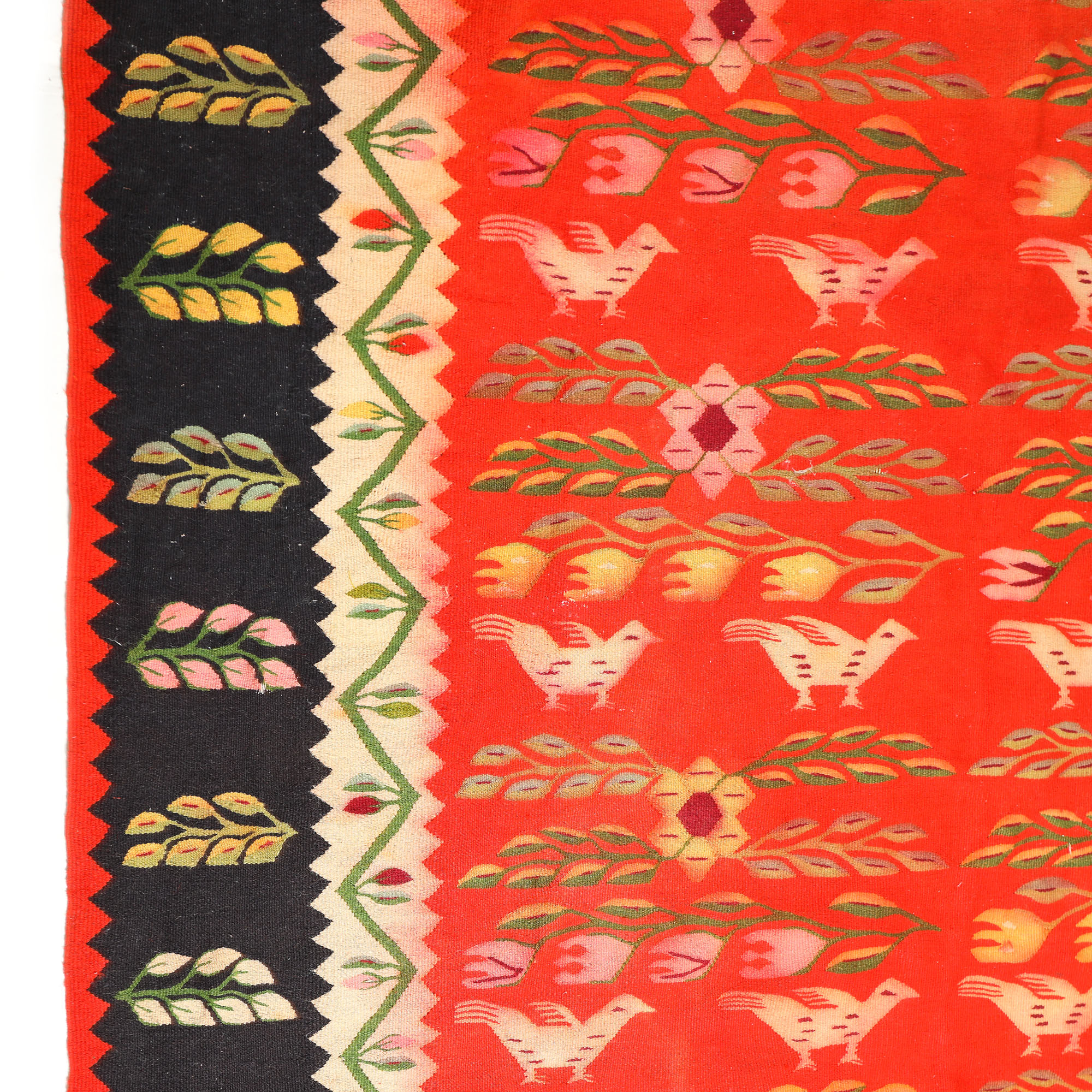 74. Covor oltenesc din lână, decorat cu cocoșei și lalele, prima jumătate a sec. XX, piesă rară