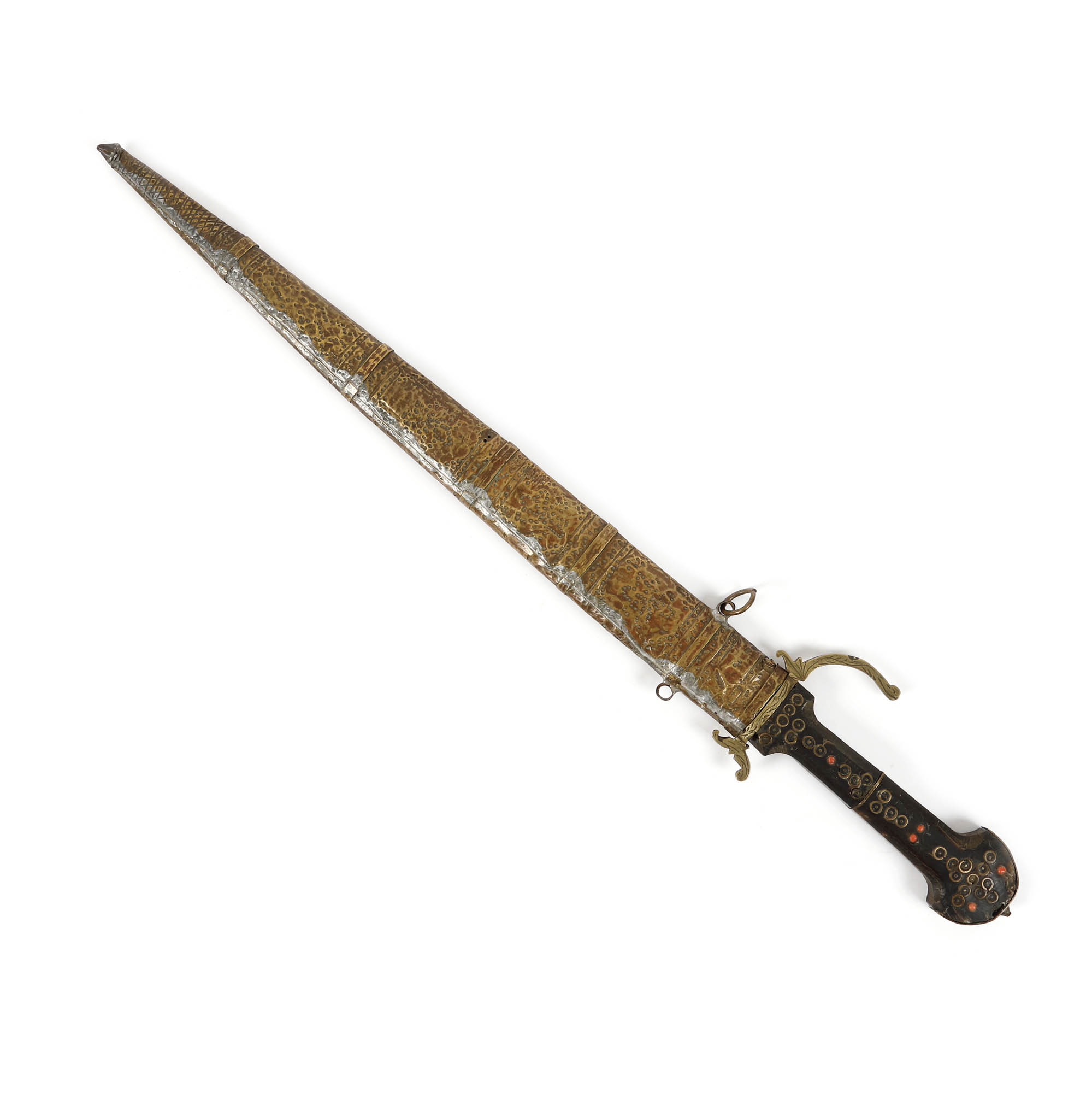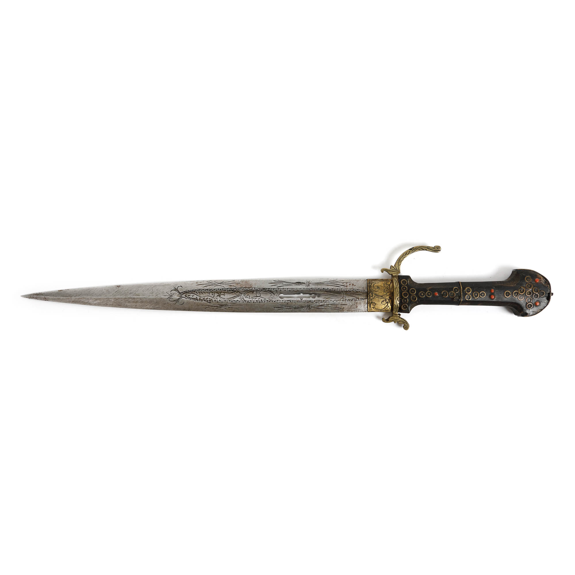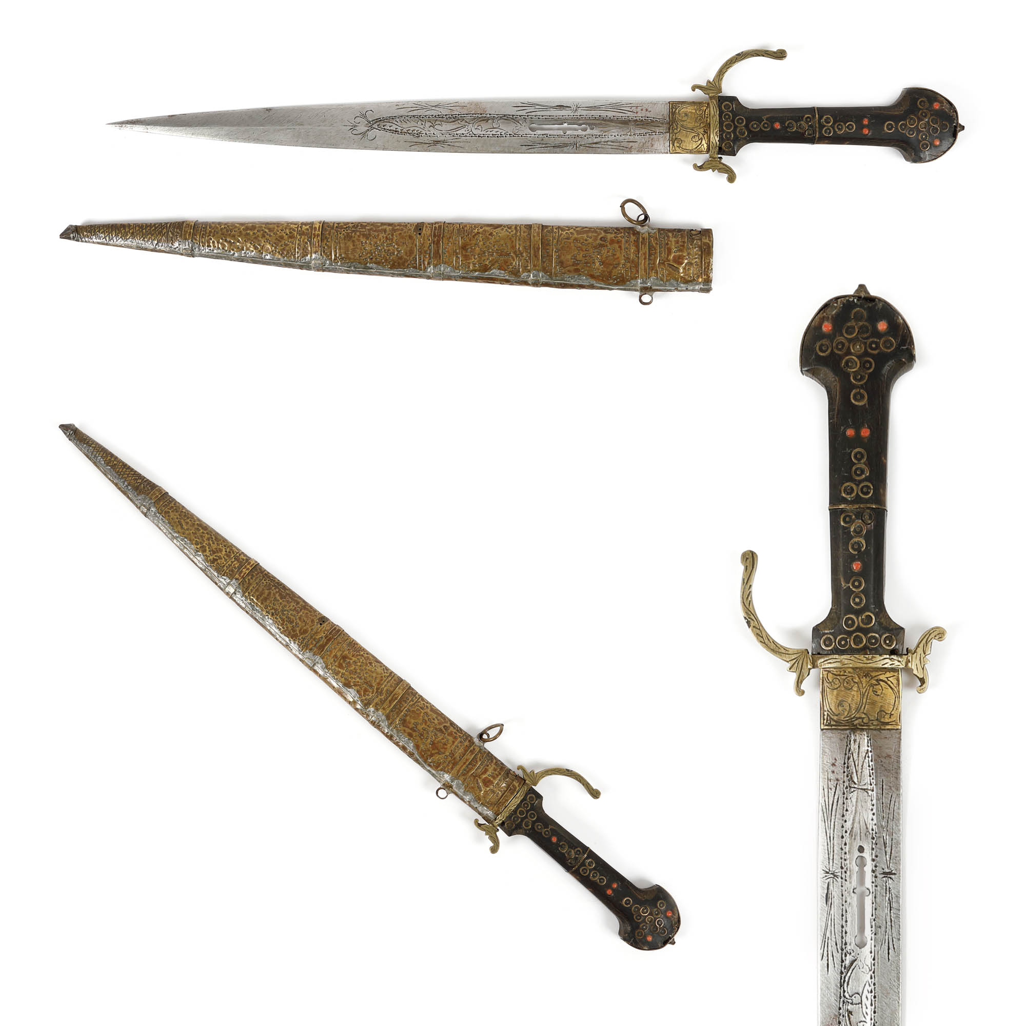 65. Kindjal caucazian, lamă decorată cu "noapte arabă" (stele, grădină și mihrab), cu teacă, sfârşitul sec. XIX