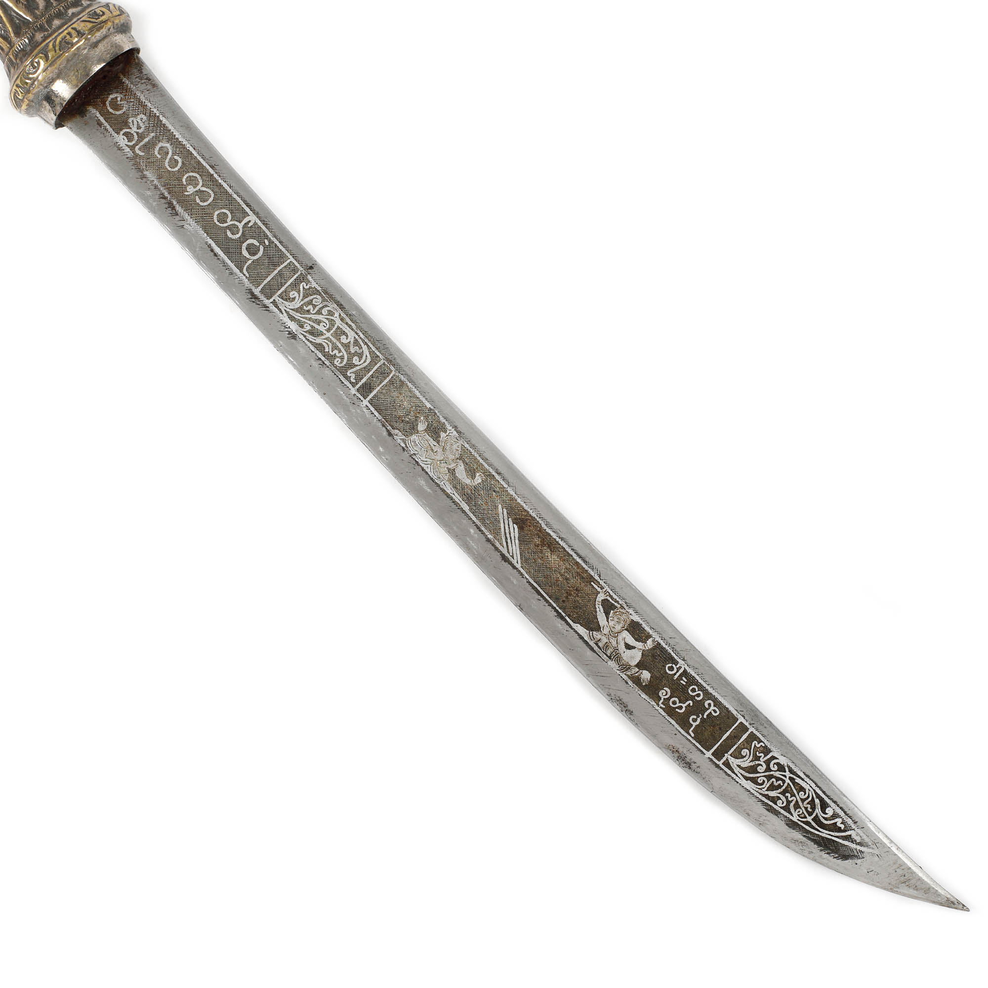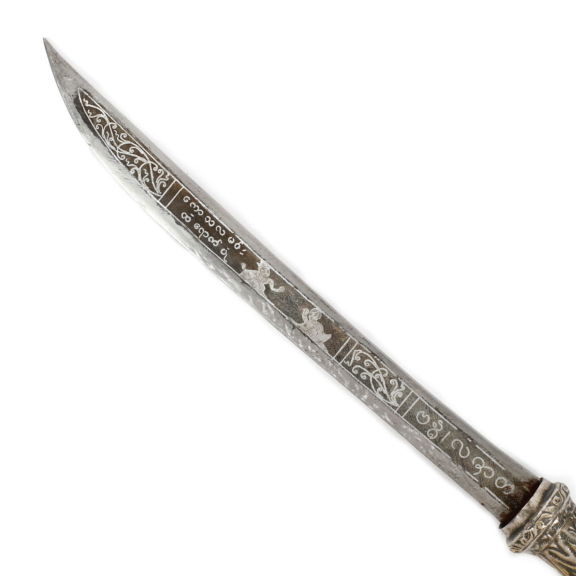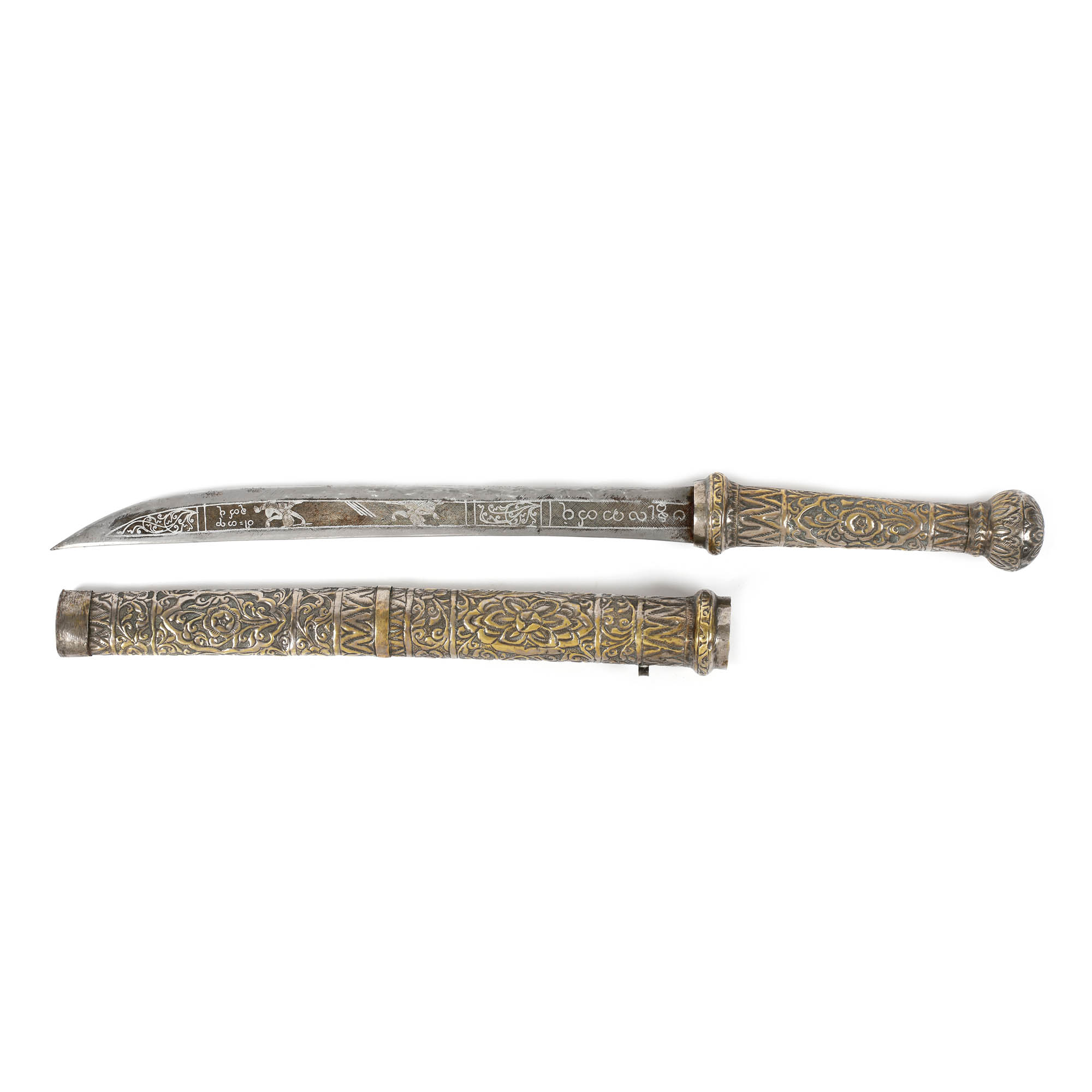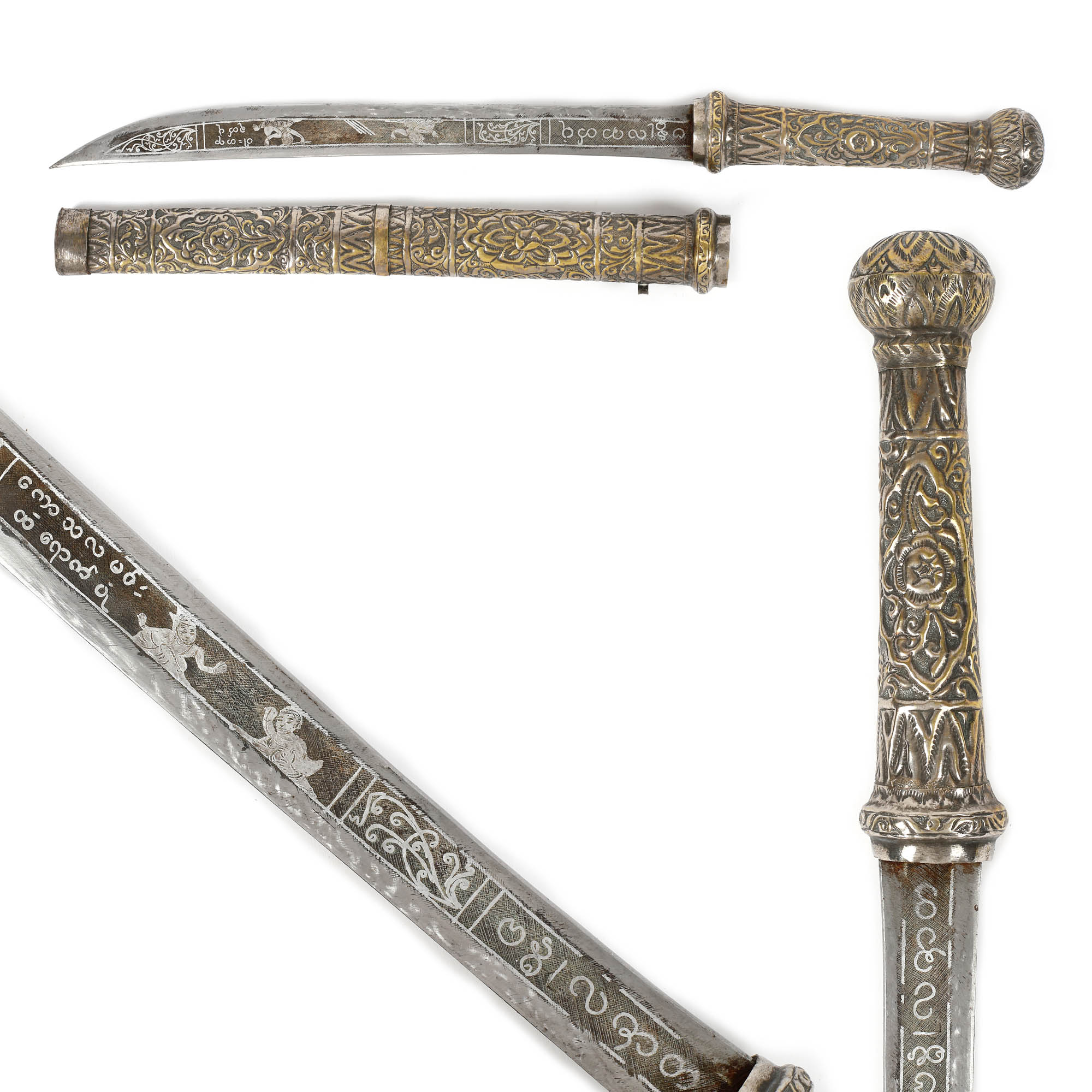 63. Sabie de tip Dha, cu teacă, lamă decorată cu scene ritualice, Burma, sec. XX