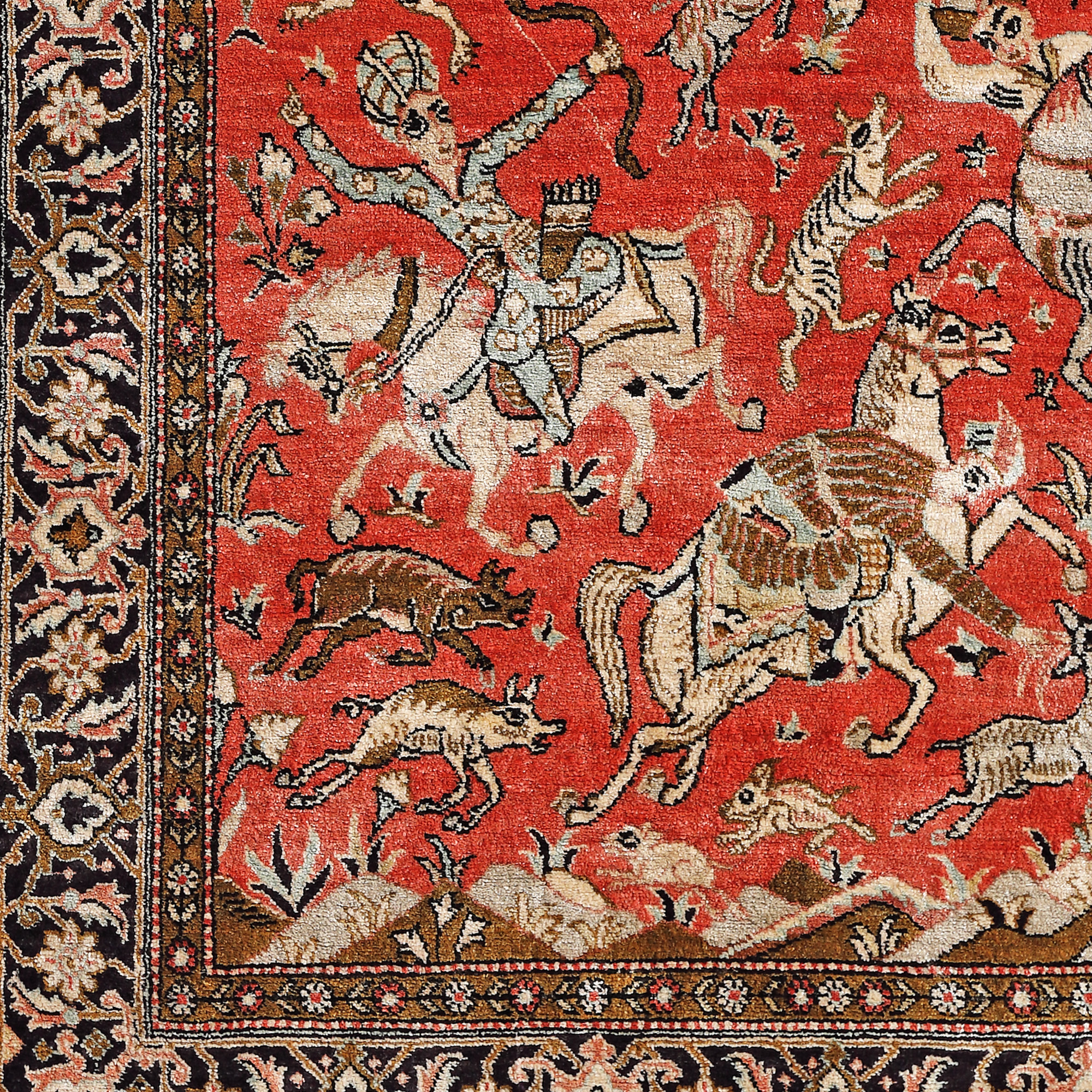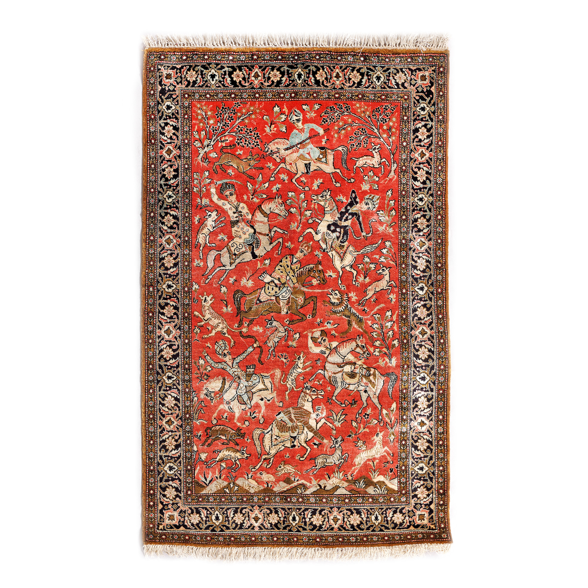 75. Covor Qum (Ghom) din mătase, decorat cu o scenă de vânătoare, Iran [a doua jumătate a sec. XX]