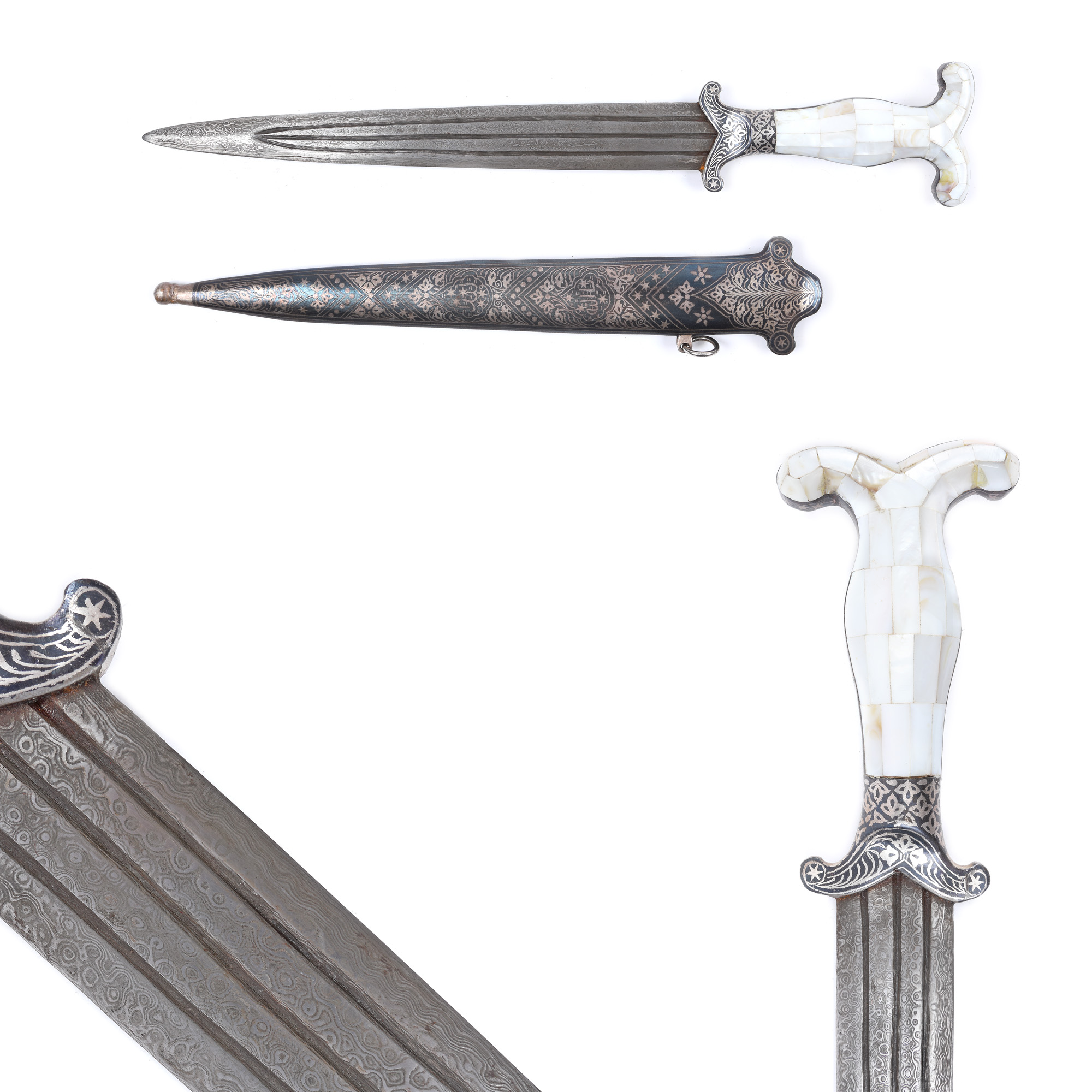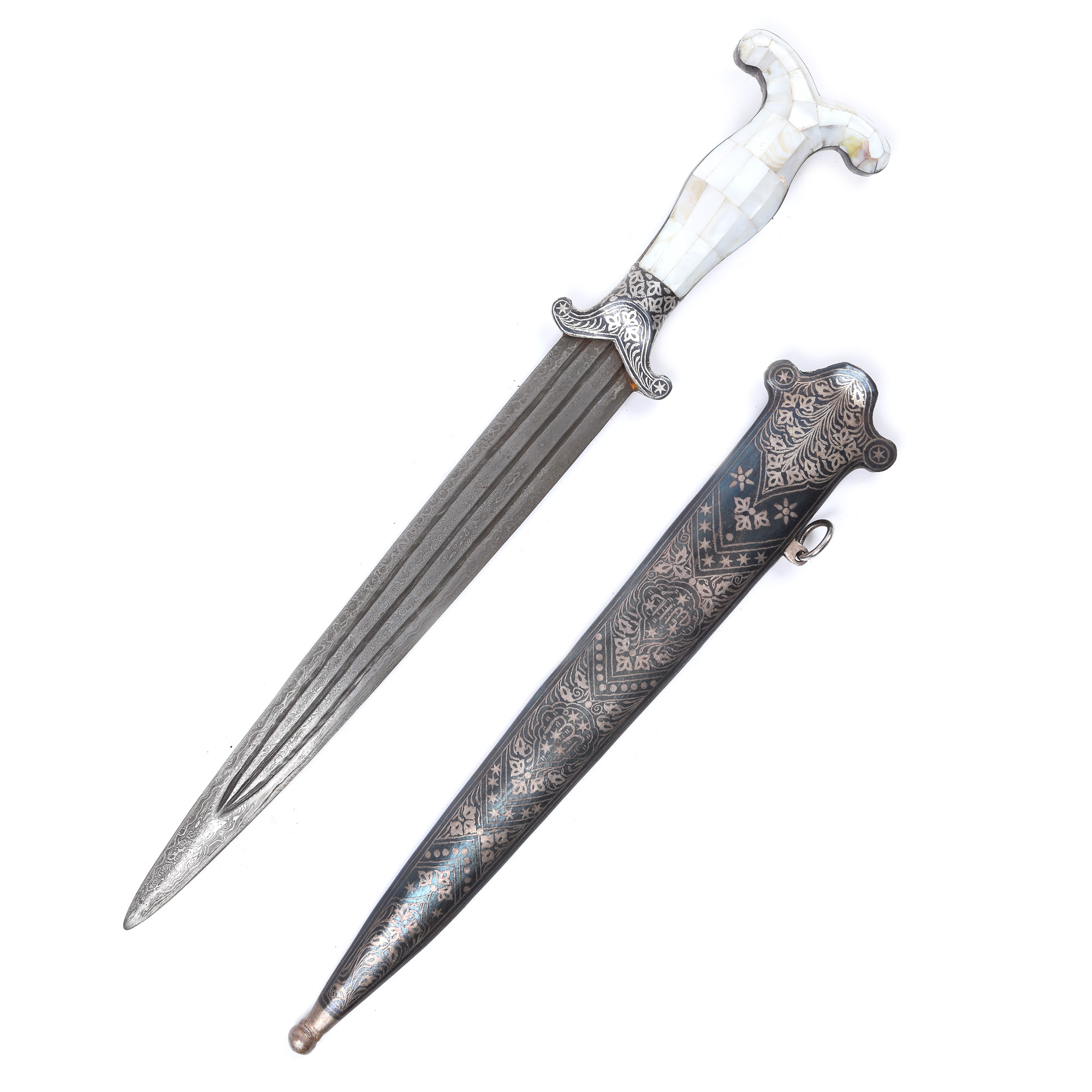 64. Pumnal persan cu lama damaschinată și mânerul decorat cu sidef, jumătatea sec. XX