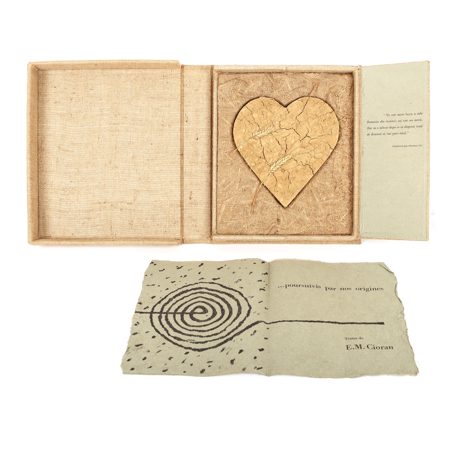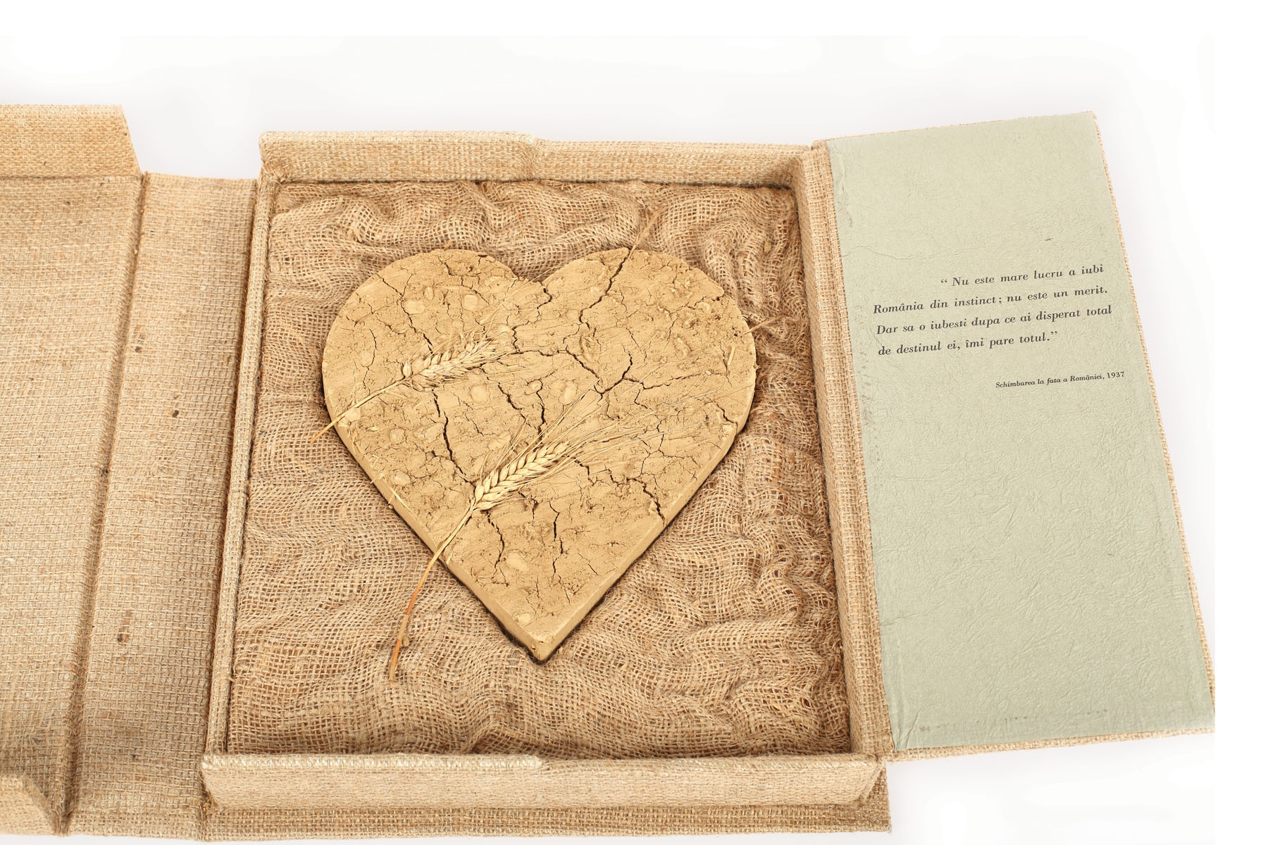 obiect (5 litografii, inimă din lut ars şi spice de grâu, pânză de sac)