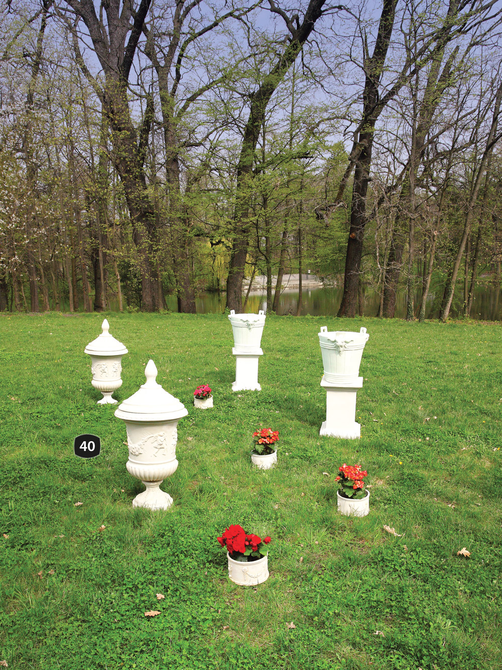 40. Vase decorative, acoperite cu capace fastuos decorate, așezate pe postamente