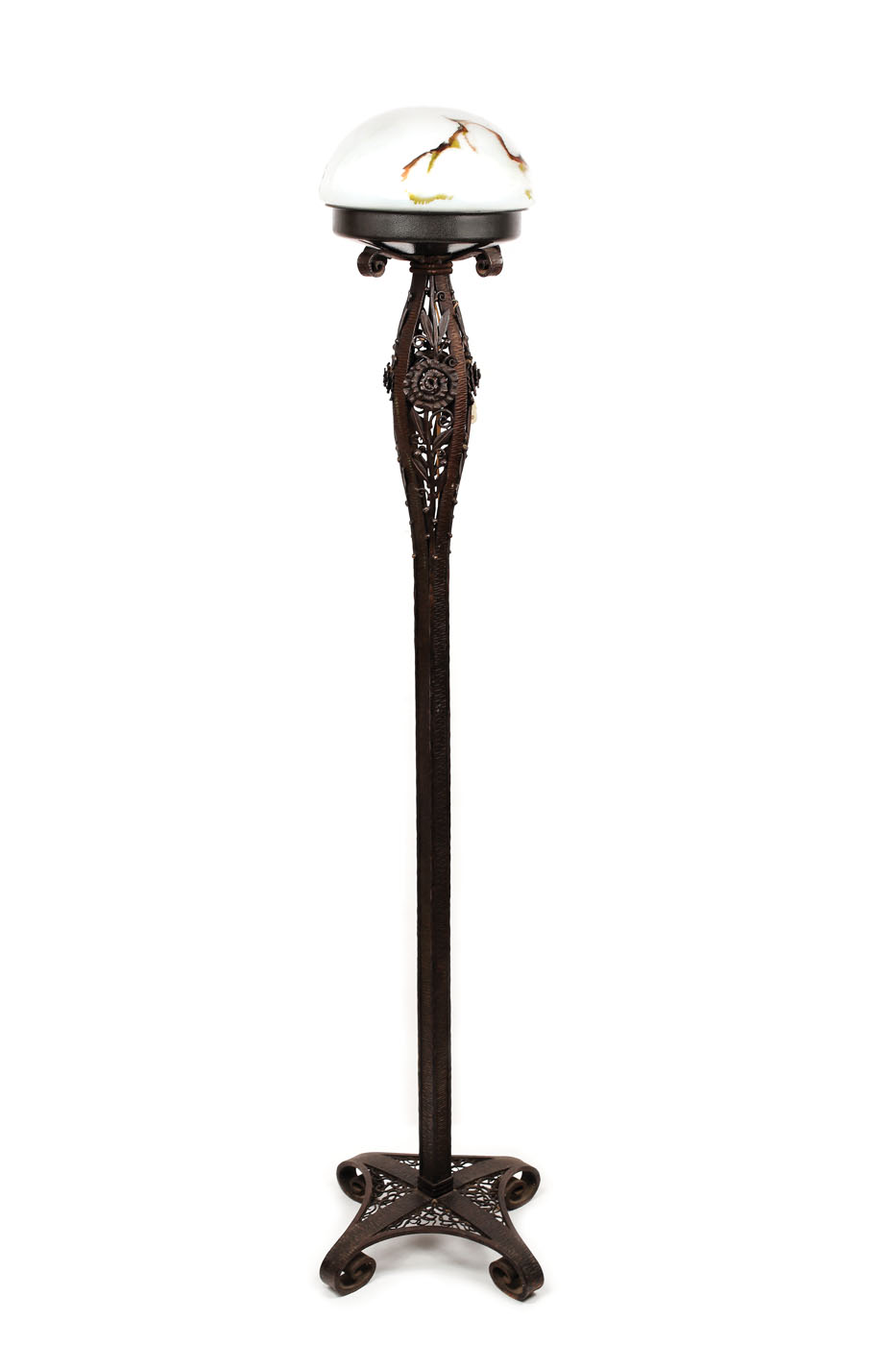 Lampadar înalt cu talpă pătrată, picior colonetă cu decor de bulb floral-vegetal din benzi de fier forjat, abajur din sticlă albă cu vine maron.