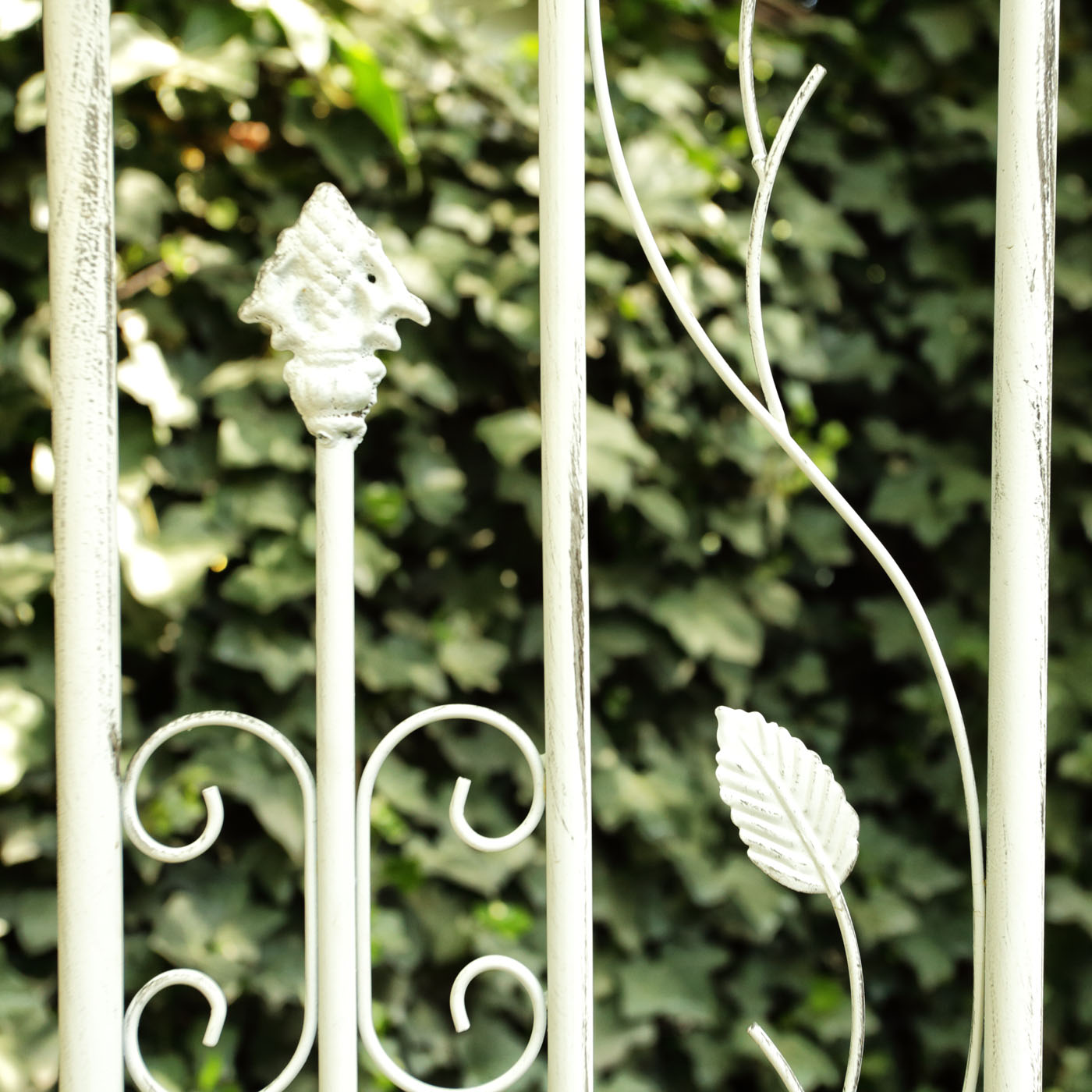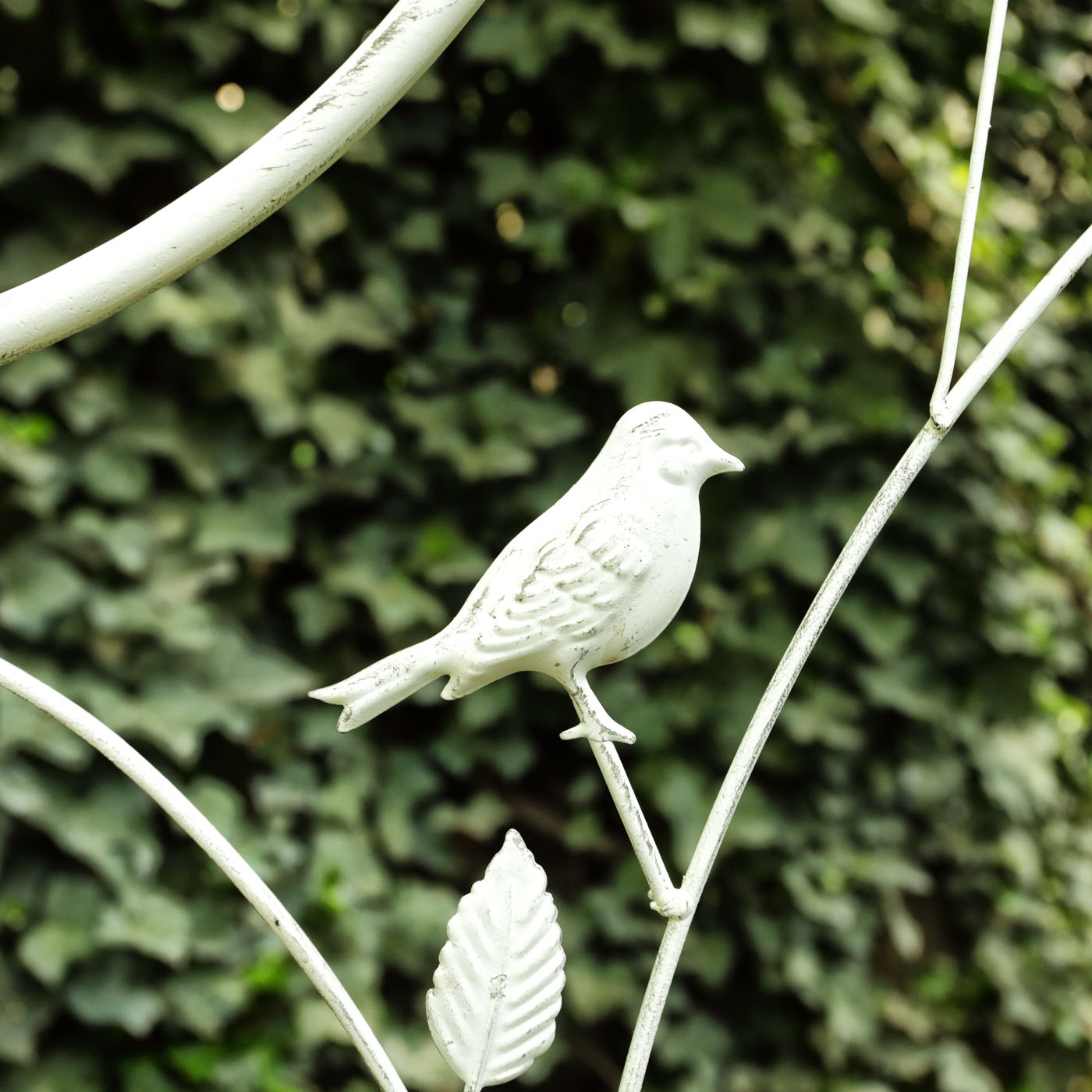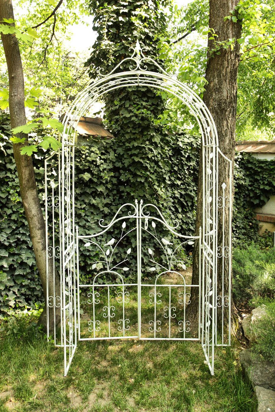 40. Arcadă decorativă pentru plante cățărătoare, cu portiță și ornamente - ramuri cu frunze și păsări