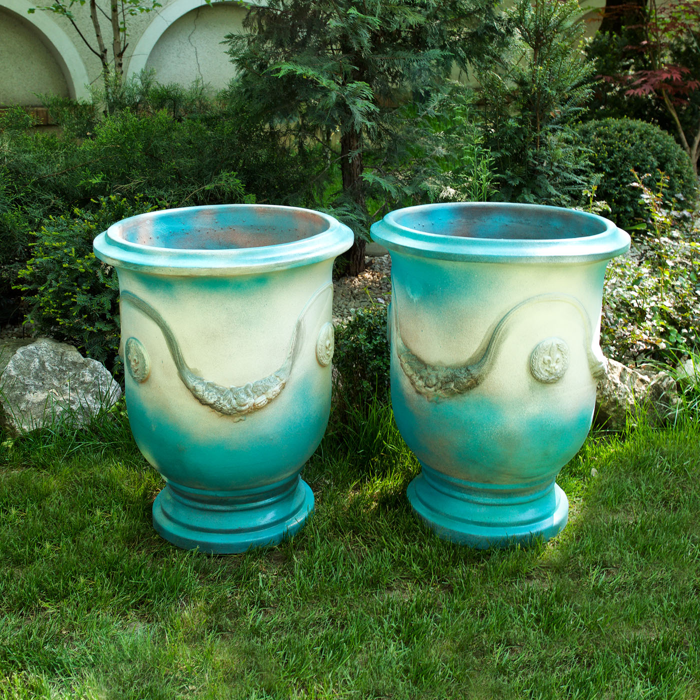 45. Monumentală pereche de vase decorate cu medalioane încadrând fleur-de-lis și ghirlande vegetal-florale