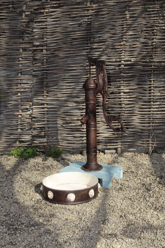Pompa cu corpul decorat cu anouri având central țeava de scurgere a apei în formă de pește fantastic iar partea superioară fiind decorată cu motive vegetale. Mânerul masiv în volută canelată este decorat cu motive floral-vegetale și scoici.