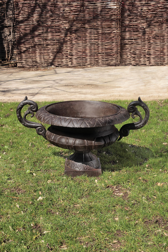 Vas de grădină, din fontă patinată, având formă de cupă, cu picior scurt şi postament patrulater. Buza cupei mult răsfrântă este decorată cu motiv frunză lanceolată, iar ansele volutate, supraînălţate, sunt dublate pe interior.