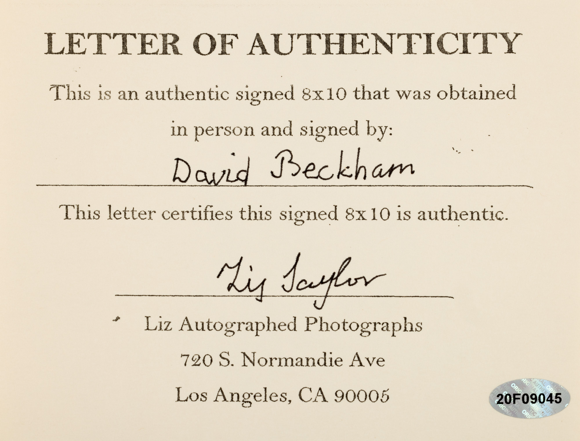 40. Fotografie reprezentându-l pe David Beckham, cu semnătura olografă a acestuia, însoțită de certificat de autenticitate