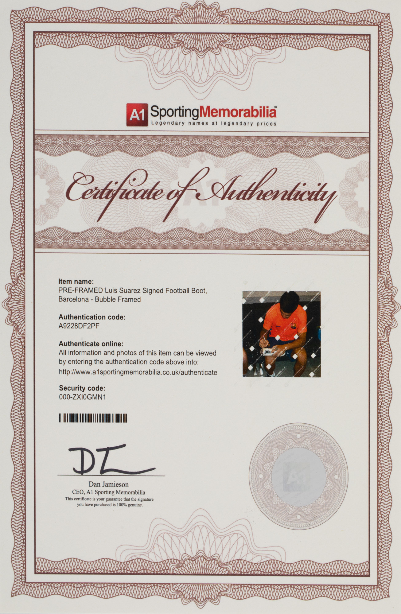 Obiectul este însoțit de certificat de autenticitate de la A1 Sporting Memorabilia.