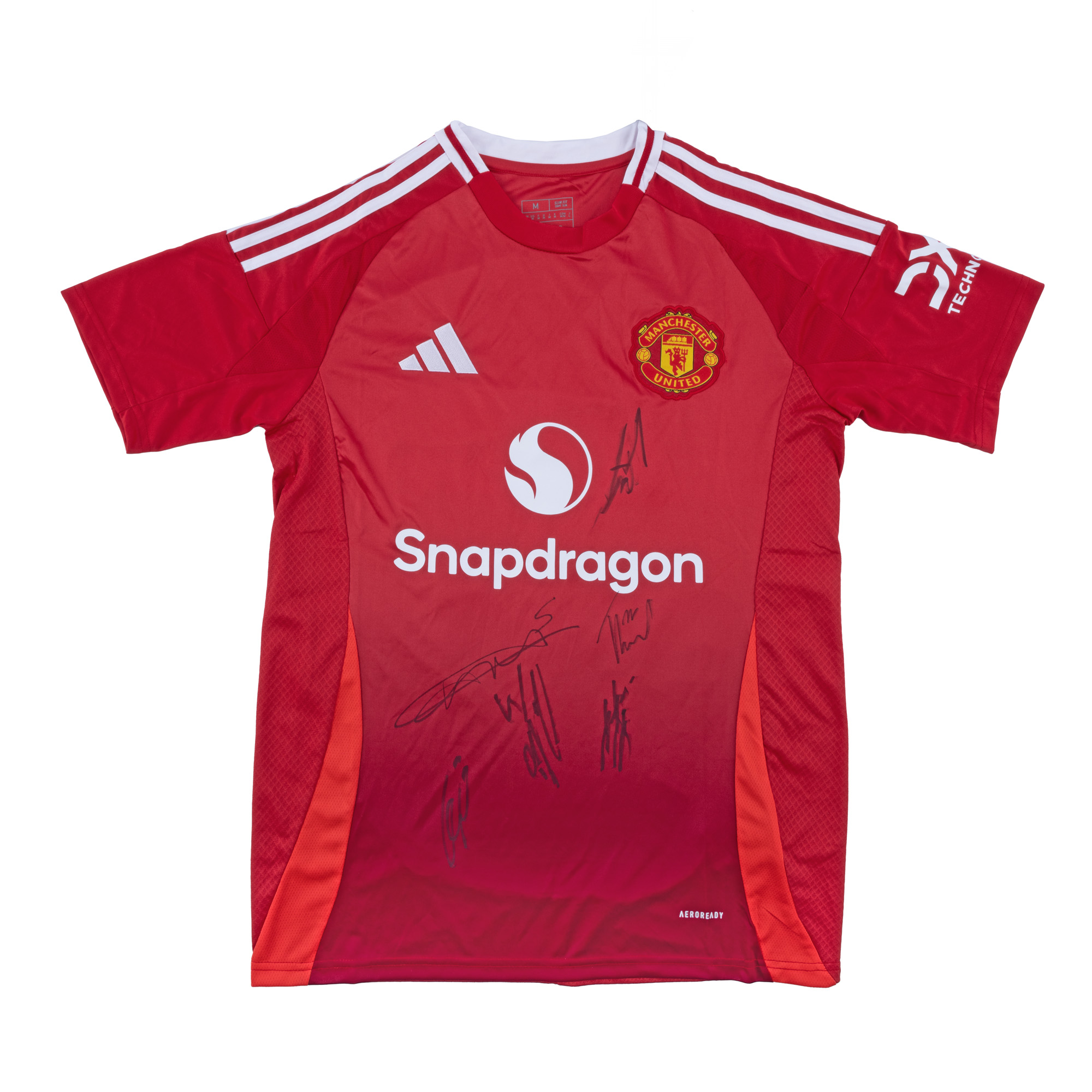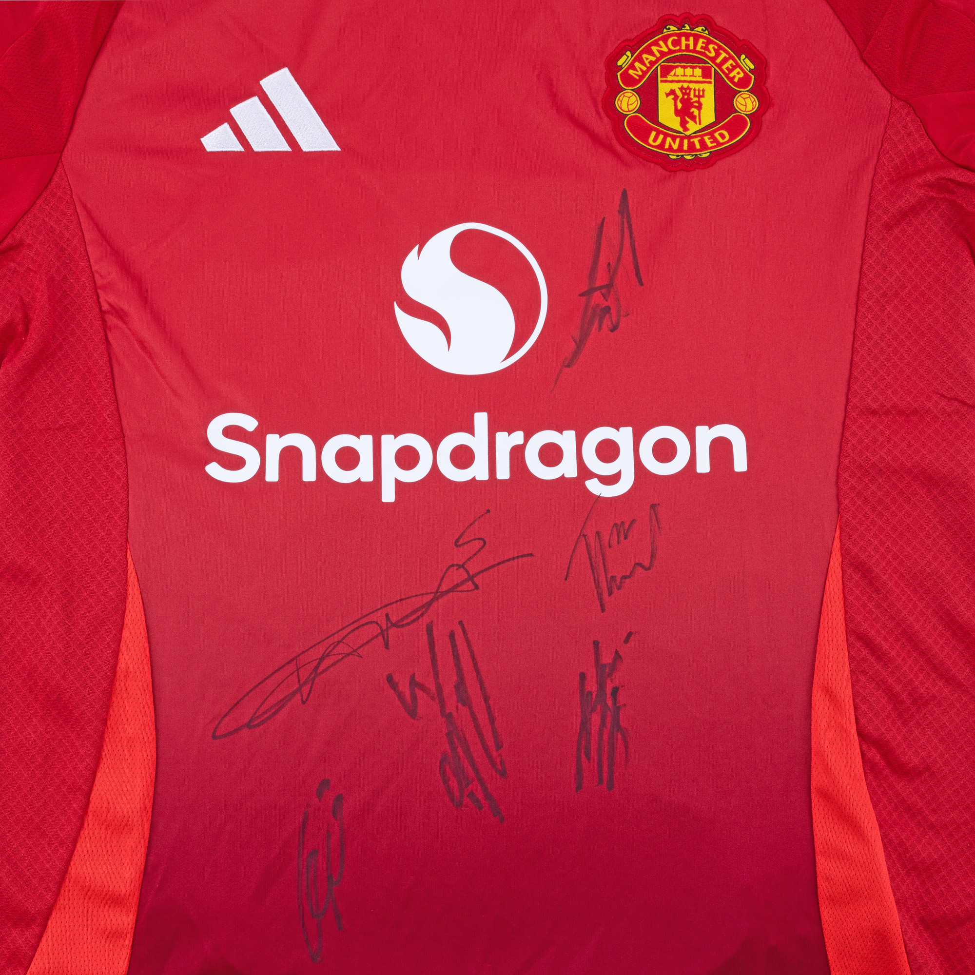 89. Tricou Manchester United, cu semnăturile olografe ale lui Casemiro, Victor Lindeelof, Harry Maguire, Manuel Ugarte, Leny Yoro