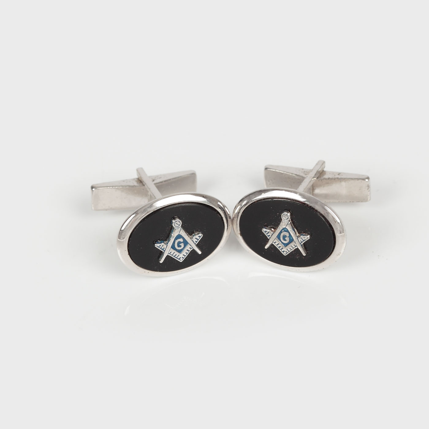 Butoni din argint de formă ovală, având însemne masonice clasice, aplicate pe onix ce urmărește conturul, piesa de fixare cu sacadare pe poziții fixe.