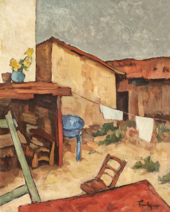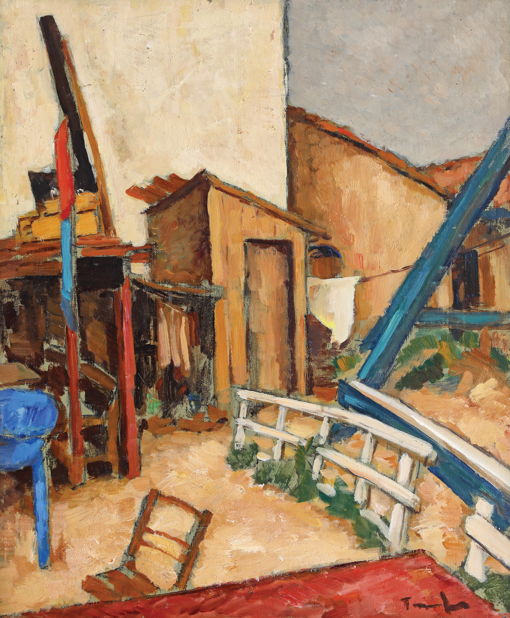 Anul 1925 marchează momentul întâlnirii lui Nicolae Tonitza cu mica așezare de la malul Mării Negre: Mangalia - locație în care artistul avea să revină, an de an, până în 1930. Întoarcerea periodică în ținutul dobrogean deschide calea către un vast periplu de peisaje, între care distingem cu întâietate țărmul torid inundat de soare. Însă perindarea lui Tonitza de-a lungul Dobrogei nu se va materializa în mod obligatoriu sub forma peisajelor marine, ci va îmbrăca, mai cu seamă, forme umile, care se vor transpune în opera sa în colțuri de mahala, interioare țărănești, case, cafenele sau curți. Paleta specifică acestei perioade va împrumuta din coloritul Dobrogei și se va traduce în pânzele autorului în ocrul solului marcat de arșiță, în arămiul porților de lemn sau în albastrul deschis al cerului lipsit de nori. Pictor al atmosferei, Tonitza surprinde în doar câteva tușe culoarea locală și impregnează cu măiestrie lumina dobrogeană în pânzele a căror geneză e atribuită spațiului de la malul Mării Negre. În intervenția sa radiofonică din anul 1932, transpusă sub forma unui vast eseu însumând nu mai puțin de douăsprezece pagini, Tonitza subliniază importanța pictorului pionier-novator în revelarea și popularizarea spațiilor care se bucură ulterior de o reputație prodigioasă. El insistă, astfel, să promoveze conceptul artiștilor-vilegiaturiști aflați în căutarea unor locuri încă neexplorate, pe care să le poată inaugura, în premieră, în maniera lor specific picturală. Nicolae Tonitza ni se dezvăluie, așadar, cu egală pasiune atât în opera pictată sau desenată, cât și în cea scrisă. Corespondența celor două va rezulta în mijloace comune și sfere de interes echivalente în reprezentarea realității artistului. Criticul de artă Tonitza își rezervă dreptul de a reveni, prin scris, asupra operei sale plastice deja configurate. Comentariile sale sunt menite să schițeze, să explice sau să sporească potențialul creator al pictorului sau al desenatorului. Se produce, așadar, o dedublare analitică al cărei scop final constă în realizarea artei pentru artă, a artei pentru popor, dar și a artei pentru sine. Dobrogea rămâne, pentru artist, o provincie dintre cele mai pitorești, însă prin alura sa etnică prezintă cel mai diminuat specific românesc. În peisajele realizate în această etapă de creație, Tonitza se înfățișează adesea meditativ, aflat într-o îndelungă contemplare asupra subiectului pe care urmează să îl transpună pe pânză. După-amiezile dobrogene toride și arșița băilor de soare de la malul Mării Negre contribuie la aprofundarea vocației culorii, culoare pe care artistul o utilizează atât ca mijloc de exprimare a ideilor, cât și ca modalitate de ilustrare a sentimentelor cele mai profunde. Trăsătura specifică a peisajelor lui Tonitza va rămâne, însă, absența elementului uman. Ritmicitatea decorativă a rufelor întinse pe frânghii, a porților sau cafenelelor, toate văduvite de prezența personajelor, apar în fața privitorilor ca un act dintr-o piesă ionesciană, în care scaunele goale înșirate grămadă par că monologhează în solitudinea lor. (D.C.)