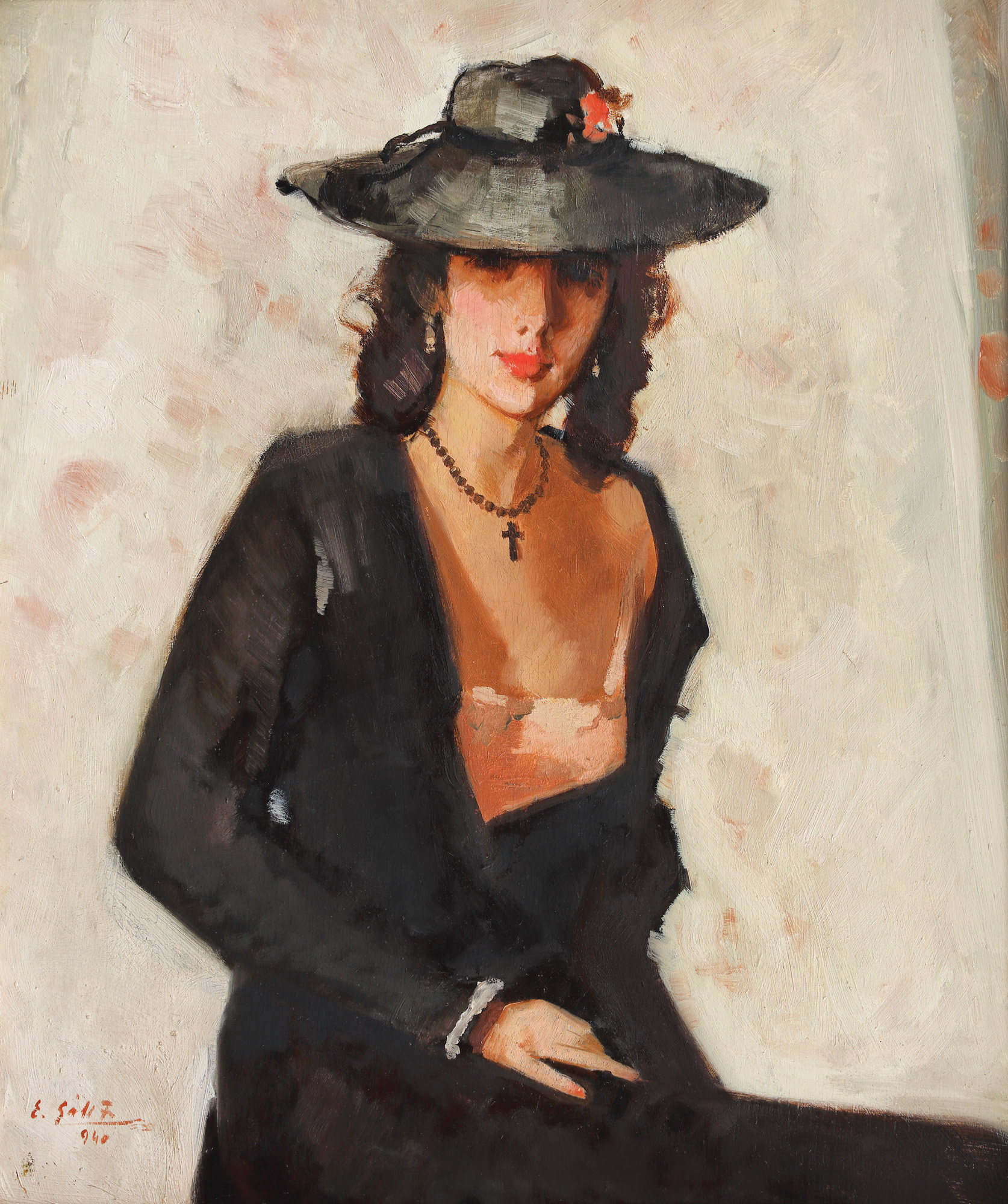Personalitatea remarcabilă a lui Francisc Gall se divide între titulatura de ”unul dintre cei mai reprezentativi artiști ai Centrului Artistic Baia Mare” și aceea de veritabil continuator al lui Monet sau Degas. Studiază succesiv la Cluj, Roma și Paris; iar în 1932 va expune la Galeria de Artă Modernă din Roma, acolo unde întâlnește pictori precum Friesz, Derain sau Picasso. Va fi prezent pe simezele internaționale pe tot parcursul carierei sale și va prelua tehnica, stilul și efectele de culoare specifice postimpresionismului francez. Atmosfera lirică a tablourilor sale va fi evidentă atât în lucrările în care îi servesc drept modele propriii săi copii, cât și în cele în care descoperim, uneori, și alte personaje. Cu părul negru-abanos șiroind de sub pălăria realizată în aceeași tonalitate închisă, muza lui Gall se destăinuie privitorului drept o prezență elegantă, cu o ținută sobră, care evocă, însă, senzualitatea și misterul. Tânăra va fi protagonista mai multor lucrări semnate de artist în care sunt invocate grația feminină și farmecul unei epoci apuse. Francisc Gall va fi un fin observator al modei vremii și va transcrie cu un devotat talent detaliile ținutelor personajelor sale. Purtată strict în scop decorativ, pălăria din lucrarea de față capătă dimensiuni reduse, menite să suțină stilul pur estetic abordat de femeile din epocă. Artistul nu ne dezvăluie un simplu portret sau un bust, ci merge mai departe, schițând aproape în întregime trupul muzei sale. Avem așadar șansa să observăm întreaga sa ținută și mai cu seamă rochia neagră, simplă, lungă peste genunchi, specifică perioadei din timpul celui de-al Doilea Război Mondial. Deși dificultățile imputate de conflictul armat impuneau oarecare limite, femeile compensau lipsa unor ținute mai elocvente prin confecționarea propriilor accesorii, prin aranjarea buclelor bogate, prin aplicarea rujurilor în culori aprinse sau prin purtarea pălăriilor mai sus-menționate. Pornind de la impresionism și ajungând până la școala modernă a Parisului, artistul studiază îndelung principiile compoziționale ale desenului și excelează în aplicarea acestora în lucrările sale. În opera de față adoptă o paletă mai sobră, o manieră profund liberă, cu tonalități robuste și prețioase și întocmește un pact oximoronic între sensibilitate și forță picturală. (D.C.)