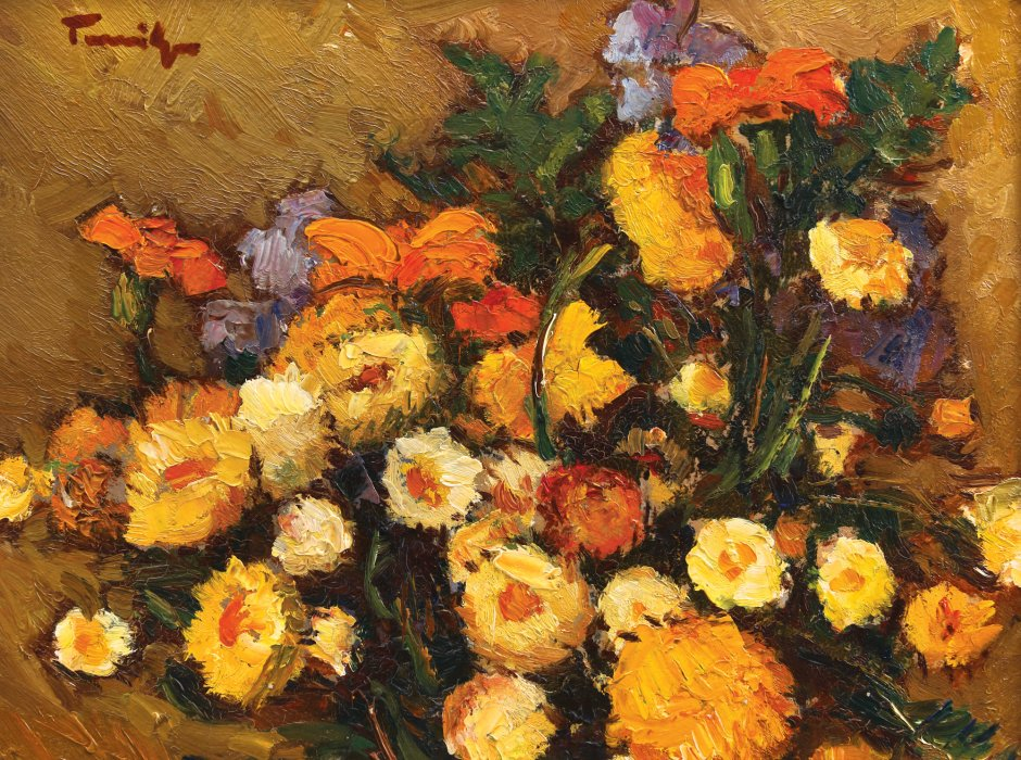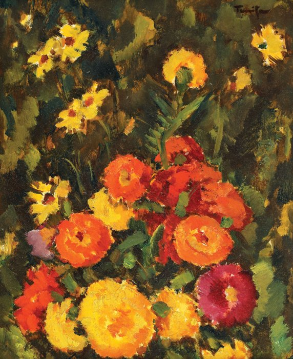 Talentul său e demonstrat mai cu seamă în elaboarea cromaticii, căreia Tonitza îi acordă o atenție deosebită, ținând seama de conceptul și tematica sub care așează vopseaua. Artistul nu reproduce natura, ci o reprezintă, devenind astfel un protector al mediului care îl înconjoară. Compune o îndelung studiată odă închinată elegiilor florale și modelează în pastă, mânuind energic cuțitul, garoafe, nalbe, crizanteme sau trandafiri. Amurgul vieții îl surprinde pe Tonitza înconjurat de pânzele care abundă în buchete sau vase cu flori. Biografia sa se împletește cu elementul creator, astfel că vom identifica pentru întâia oară pictura dedicată florilor în expoziția comună ”N. N. Tonitza – Ștefan Dimitrescu”, din ianuarie-februarie 1920. Însă fervoarea elegiilor închinate naturii se va face cunoscută și în jurul anilor 1935-1937, atunci când pictorul își va muta atelierul de creație la Schitul Durău, în Neamț. Tonitza va ajunge aici vreme de trei veri consecutive, alături de elevii săi de la Academia de Arte Frumoase din Iași. Natura îi incită spiritul creator artistului și rămâne drept una dintre principalele muze ale operei sale de-a lungul anilor. Ieșirile ”la peisaj” impuse de școala germană, în împrejurimile Münchenului, la Dachau; taberele de creație de la Durău sau descoperirea Dobrogei și a Balcicului se vor concretiza printr-un lung șir de opere dedicate naturii și spațiului exterior, dar și prin însușirea unei palete cromatice diferite sau prin îndelungate exerciții dedicate reprezentării luminii. Artistul consacră opera de față unui buchet de primăvară pe care îl alcătuiește din tonuri luminoase și accente cromatice stridente. Alegerea florilor, deloc întâmplătoare, conduce către ideea de fascinație și iubire nemărginită, întrucât garofițele au fost adesea asociate cu dragostea maternă. Observăm, de asemenea, și nalbele, pe al căror înțeles îl deslușim tot în cheie simbolică: de protectoare ale căminului, întruchipând totodată dragostea și sănătatea. Florile lui Tonitza sunt florile care au apărut în mod recurent în operele multor artiști români de-a lungul vremii. De la nalbele lui Petrașcu și până la garofițele lui Aman, istoria artei românești debordează de elegii florale transpuse pe pânză, cărora autorii lor le atribuie semnificații mult mai profunde. Majoritatea lucrărilor rezultate din incursiunile artistului la Durău, Mangalia, sau Balcic vor putea fi admirate în cadrul expozițiilor ”Grupului celor patru”, dar și în cadrul expozițiilor personale. Realizarea planurilor florale nu va fi, așadar, o practică străină de Tonitza, ci va deveni un motiv abordat cu recurență, dezvoltat și adorat de pictorul iubitor de natură. (D.C.)