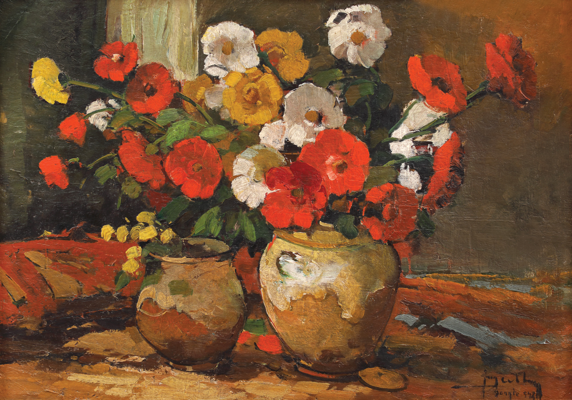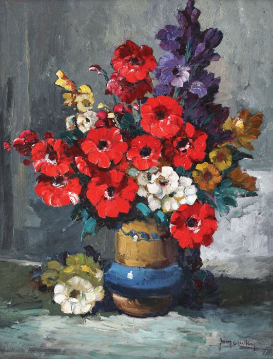 Descendent al unei familii germane pe filieră austriacă, Jean Cheller va adopta acest nume ca urmare a marginalizării sale odată cu instaurarea regimului comunist. Acesta îl va înlătura, treptat și indirect, din viața culturală publică a României. Nu ne rămân, așadar, prea multe date cu privire la formarea artistului, la călătoriile de studiu efectuate sau chiar cu privire la participările sale la expoziții. Informațiile existente au fost colectate de la familia și apropiații artistului și sunt marcate, în mod firesc, de subiectivitatea fiecăruia. Știm, totuși, că Jean Cheller a renunțat la studiile de la Academia de Artă (cel mai probabil din pricina neajunsurilor materiale), dar că i-a avut ca profesori pe Gheorghe Petrașcu și Alexandru Ciucurencu. Se spune că ar fi admirat mult opera celui dintâi și că ar fi devenit prieten bun cu cel din urmă. A legat, de altfel, o prietenie strânsă și cu pictorul Corneliu Baba, care îl stima enorm pe Cheller și care și-a exprimat în mod franc regretul că ostracizatul artist s-a stins mult prea repede, neavând suficient timp să își dezvăluie adevăratul potențial. În operele care s-au păstrat, regăsim indicii cu privire la voiajele efectuate de artist prin Franța, Italia, Egipt sau Balcic. Întâlnim panoramări ale spațiului bucureștean, cu străzile, colțurile și cartierele sale, dar și naturi statice cu flori, realizate în ulei sau acuarelă. Anemone, maci sau flori de câmp alcătuiesc adevărate elogii închinate motivului vegetal surprins într-o cromatică extrem de vie și grăitoare, cu declinări de alb, roșu sau galben, iar uneori primind chiar și inserții de roz sau albastru. Vasele din ceramică întregesc cadrul și atmosfera propusă de artist, care invocă reîntoarcerea către origini și simplitate, atât prin forme, cât și prin cromatica aleasă. (D.C.)