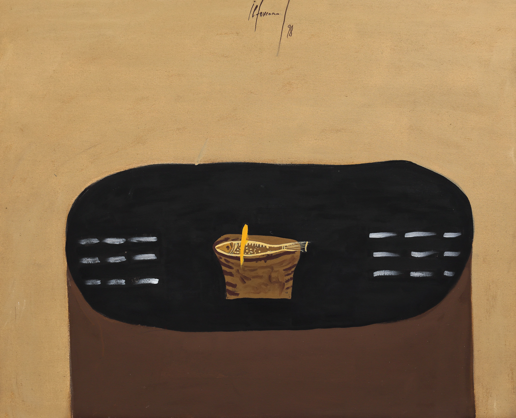 Sorin Ilfoveanu se concentrează mai cu seamă pe valorificarea lumii obișnuite și pe transcrierea ei prin semantica picturală a sensibilității sale. Sintetizează, atât prin formă, cât și prin cromatică, simplitatea universului teluric în care își desfășoară activitatea. Înregistrează, printr-o sinergie de linii, un întreg univers în care încifrează simboluri și mister. Artistul își împarte potențialul creator în teme ciclice, pe care le reia constant sub forme noi și cărora le acordă, de fiecare dată, o atenție deosebită și un înțeles nou. Subiectul lucrării de față se divide în titluri precum ”Hierofanie” sau ”Masa”. Cu ajutorul celui dintâi, Ilfoveanu invocă sacrul și religia, misterul și revelațiile spirituale. Calitățile sale intelectuale sunt demonstrate îndeosebi în naturile statice, care ne destăinuie rafinamentul său artistic sau impulsurile plastice sensibile. Cu o construcție logică și simplă, artistul îmbină formele și paleta cromatică reușind astfel să potențele efectul propus de cele câteva linii fade care descriu motivul. Ilfoveanu așează pe mesele sale ofrande, fie sub formă de natură vegetală (nuci, mere), fie sub formă de natură animală (fazan, pește). Peștele apare drept simbol al vieții și al înțelepciunii, primește un sens moral, orientat către lumea interioară și dezvăluie o latură emotivă. (D.C.)