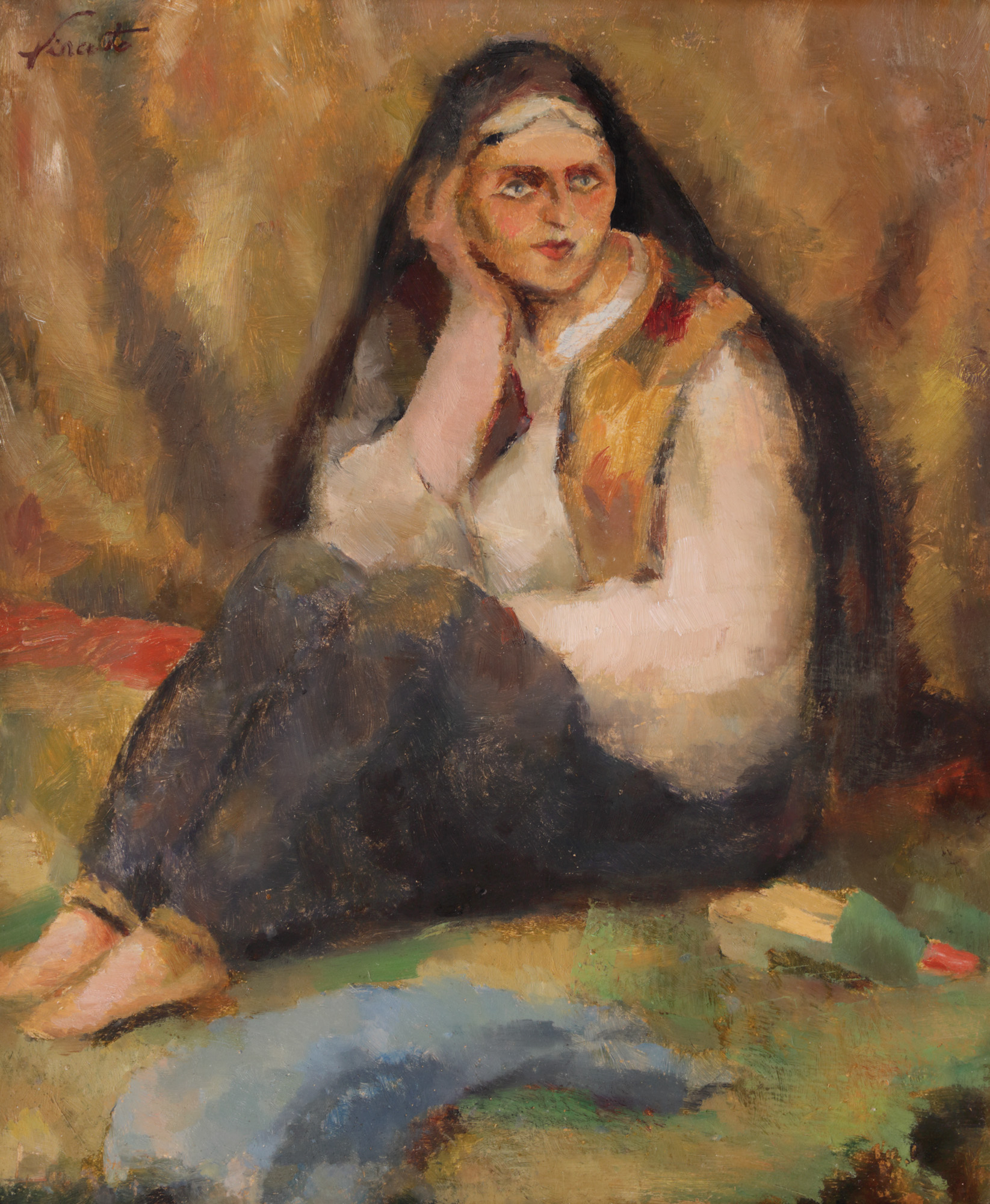 Pictată în primii ani ai deceniului al treilea, opera de față ne introduce într-o tematică specifică acestei perioade, în care Francisc Șirato integrează două construcții individualizate - interiorul cu personaj, respectiv tema de sorginte orientalistă. Chiar dacă nu marchează apariția pitorescă așa cum o făcea un Iser (care se dedica acestei teme), Șirato nu ratează să puncteze imaginarul cu principalele caracteristici estetice. Subiectul apare așadar la câțiva ani distanță de când acesta interpreta fie compoziția cu personaje - începutul anilor '20 -, fie farmecul pitoresc al tipologiei orientale - Mangalia, apoi Balcicul, apar după 1925 în vizorul artistului. Uleiul, care ne este prezentat de marele critic de artă Henri Blazian în "Plastica anului 1931", ne oferă ocazia analizării unei compoziții ce marchează schimbările survenite în pictura lui Șirato la cumpăna dintre deceniile 3 și 4. Pensulația este principala sursă de noutate, fiind extensiv marcată de noile descoperiri în plan cromatic și luministic. Pictată în tonuri concentrate, reci, pânza impresionează prin structurarea pensulației în funcție de suprafața abordată, formând valuri cromatice expresive ce marchează principalele volume compoziționale. Opera anunța într-un fel ciclul abordat în perioada 1933-1934, cu lucrări ce se modelau după același tipic – personaj feminin, surprins într-un interior neindetificabil, în posturi relaxate. Chiar dacă în această lucrare modelul este mult mai bine definit, prin evidenta apariție pitorească, Șirato nu a căutat să marcheze în special rezonanța orientală, ci mai mult s-a axat pe sursa cromatică inedită. Acest lucru este punctat tocmai prin calitatea paletei – un joc cromatic senzorial -, dar și prin specificitatea pensulației, racordată și ea la atmosferă.