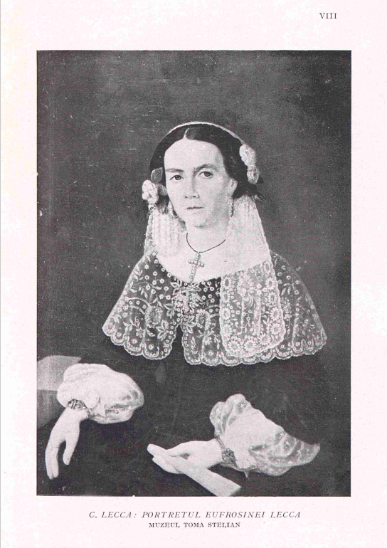 Cu rădăcini într-o veche familie boierească aflată în fruntea negustorilor brașoveni, bucurânu-se, așadar, de renume și posibilități financiare considerabile, Constantin Lecca va părăsi orașul natal în jurul vârstei majoratului pentru a-și continua studiile la Buda. Deși în epocă era practicat un stil pictural a cărui esență era eminamente religioasă, cu rol decorativ în lăcașurile de cult sau în căminele boierești, acest tip de artă bizantină a fost abordat mult mai frugal de către tânărul artist școlit în străinătate. Lecca își va orienta penelul mai curând asupra portretisticii, demonstrând în mod clar influențele școlii vieneze. Își desăvârșește formarea artistică la Buda, Viena, Roma și Berlin, urmând ca la Roma să deprindă meșteșugul copiștilor prin reproducerea unor tablouri celebre. Acestea stau mărturie studiilor realizate în străinătate, iar Constantin Lecca se va număra printre primii artiști români care practică astfel de îndeletniciri. Întors în țară, își deschide propria tipografie la Craiova, în jurul școlii centrale (având încheiată o înțelegere în privința fondurilor cu unitatea de învățământ). Vor fi tipărite aici reviste (”Mozaicul” rămâne printre cele mai cunoscute), diverse publicații creștine sau de uz moral, piese de teatru sau dicționare. Va ocupa apoi catedra de desen și caligrafie a școlii de la Craiova și va fi, de asemenea, primul profesor de desen al lui Theodor Aman sau Petre Alexandrescu. Cronicile vremii îl descriu drept un pictor influent, care a realizat pânze monumentale dedicate domnitorilor Mihai Viteazul , Radu Negru-Basarab, Dragoș Vodă, Dimitrie Cantemir, sau Ștefan cel Mare, expuse ulterior în Școlile din București, spre a servi drept izvor istoric și prilej de admirație elevilor acestor școli. Va aborda cu aceeași iscusință și subiecte istorice ca încheierea păcii, desfășurarea bătăliilor, sau a descălecatelor; dar va rămâne, în esență, un pictor romantic. Va întemeia un așa-zis ”triumvirat” în epocă, alături de pictorii Mișu Popp și Barbu Stăncescu. Împreună vor prelua diverse comenzi, de la pictarea stemei țării pe drapele oștirii și până la zugrăvirea de biserici. Constantin Lecca manifestă însă o predilecție deosebită pentru revelarea caracterelor umane în portrete. Surprinde chipuri de nobili înstăriți, medici sau preoți; dar își pictează și soția, copiii, verii (Ion și Eufrosina Lecca) sau alți membri ai familiei. Aceste portrete sunt veritabile documente de epocă datorită migalei de miniaturist pe care o atestă artistul în redarea vestimentației, a coafurilor, a dantelelor și a podoabelor. Realizează, practic, o întreagă galerie de portrete dedicată boierimii românești, însă se va orienta adesea și către propria-i persoană. Creează ciclul tematic al autoportretelor - aflat încă sub influența romantimsului vienez, dar în Italia, schițează un prim autoportret de tinerețe, păstrat astăzi de Academia Română. Acordă o atenție deosebită modului de realizare a părului, mustății sau bărbii. Cu vădite unduiri și ondulări, trăsăturile sale emană grație și eleganță. În portretul de față surprinde delicatețea personajului feminin. Paloarea carnației e evidențiată de cromatica vișinie a rochiei brodată cu dantele albe. Tonurile alese de artist sunt reci, însă armonios îmbinate. Fața de masă albastră și peretele în nuanțe de gri sunt în perfectă concordanță cu atmosfera generală a tabloului. Protagonista e surprinsă într-o ipostază calmă, pe scaun; cu o mână așezată pe faldurile rochiei, în care întrezărim coperta unei cărți, și un braț sprijinit de masa pe care e situat un vas cu flori. Statutul social al personajului este dezvăluit de bijuteriile elegante, realizate din aur, dar și de vestimentația elegantă și prețioasă. Constantin Lecca rămâne, așadar, un promotor al romantismului și un poet făuritor de portrete dedicate nobilimii române, care s-a desprins din mrejele artei bizantine, asumându-și rolul de pictor al omului. (D.C.)