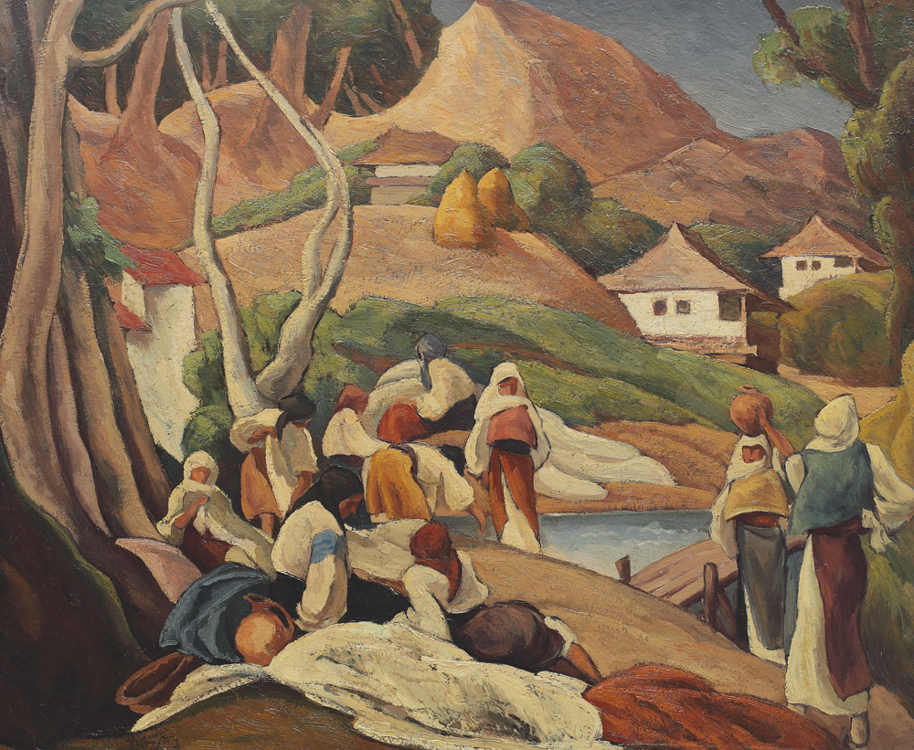 Ion Theodorescu Sion, precum mulţi alţi pictori români de valoare de o generaţie cu el, a avut parte de o pregătire temeinică în ale artei. Iniţial a învăţat pictura la Şcoala de Belle Arte din Bucureşti. Mai apoi a plecat ca bursier la Academia Julian din Paris, unde a beneficiat de ghidarea lui Jean-Paul Laurens şi a lui Luc Olivier Merson. O combinaţie de situaţii - la care a contribuit şi întreruperea bursei ce îngăduia existenţa unui statut privilegiat şi a unui oarecare confort material pentru pictorul în devenire - l-a împins pe Theodorescu Sion la a se pregăti nu numai în mediul academic, ci şi pe cont propriu. Prin numeroase vizite de studiu la galeriile şi muzeele din Paris – în special Luvrul – a intrat în contact direct cu arta marilor nume în pictură. Mai mult decât atât, Theodorescu Sion nu s-a expus doar la viaţa artistică sterilă, ci a gustat şi din efervescenţa organică a vieţii boeme şi a atelierelor de artişti din Montmartre. Cumulul de experienţe şi situaţii la care Ion Theodorescu Sion a fost expus l-au condus pe acesta la a-şi dezvoltat propriile filtre de critică şi analiză în domeniul artei. Una dinte consecinţele acestei experienţe este evidentă în arta sa nu numai prin remarcabila stăpânire tehnică de care a dat dovadă, dar şi prin versatilitatea stilului sesizabilă pe percursul evoluţiei sale artistice. Diversitatea şi complexitatea de tehnici, stiluri şi metode adoptate aduce un plus nu numai creatorului, ci şi artei româneşti care s-a îmbogăţit considerabil cu zestrea lăsată de acest mare maestru. Theodorescu Sion – numit „leul” în cercurile prin care se învărtea pentru forţa şi nobleţea inspirate de prezenţa sa – a acceptat, adoptat şi înglobat cu încredere şi siguranţă de sine curentele în vervă ale occidentul european şi urban din vremea sa. Astfel, în creaţia pictorului nu se resimt notele de manierism rigid, ci aceasta se remarcă şi se distinge prin prospeţimea şi originalitatea impregnate, pe care artistul le aduce şi în scena artistică de pe meleaguri mioritice. Se vor evidenţia cu precădere influenţele Art Nouveau prin care, în mod absolut unic şi natural, sunt redate motive, subiecte şi teme specifice ale spaţiului tradiţional românesc de care Theodorescu Sion s-a simţit profund legat. “Sentimentul plastic al românismului se deosebeşte de celelalte popoare printr-o sensibilitate aparte. O discreţie în gingăşie şi armonizarea unui cromatism în surdină. Totul se contopeşte calm şi limpede ca o după-amiază de vară”, afirma pictorul într-un interviu. Elementele menţionate de acesta se regăsesc prin cumpătarea liniei desăvârşite de moderaţia culorii care umple forma, conferind volum domol şi muscularitatea ce transpare din compoziţiile sale. Acestea se sedimentează în decursul perioadelor de creaţie, cu propriile specificităţi. Prima perioadă (1909-1920) – simbolistă – se manifestă într-o eră post-grigoresciană, dominată de melancolia toamnei sau portrete de apostoli. În această perioadă transpare temperamentul artistic viu al pictorului prin folosirea arabescului şi a tehnicilor variate, de la desen – în care excelează – la acuarelă, pastel, ulei şi chiar encaustică. Impresionează prin maniera coloristică variată: tuşe preşungi în stil expresionist (1912), culori pur exaltante şi complementare (1913) sau spectrale (1914). Încă de la începuturi, Theodorescu Sion va reuşi să redea armonia unduioasă a raportului între om şi natură, ce marchează cu precădere cea de-a doua şi cea mai fructuoasă perioadă de creaţie (1920-1930). Cât despre a treia şi ultima perioadă (1931-1939), aceasta este considerată ca fiind coloristică, remarcabilă prin acorduri de culoare vie şi strălucitoare, echilibrate de lumină difuză şi geometrizarea formelor. Compoziţia cu ţărănci la răscruce face parte din a doua perioadă de creaţie, profund marcată de inspiraţia lui Theodorescu Sion din tradiţia populară şi meleagurile natale. Prin consistenţa onctuoasă şi densitatea vâscoasă a materiei, în vălurirea naturală a liniei ce conferă geometrizarea formei în arcuri de cerc şi unghiuri care se resping, se obţine aplatizarea decorativă care conferă teatralitate tabloului. Compoziţia este unitară, echilibrată şi raţional construită, personajele feminine dispuse piramidal conducând vizual către elementele de cadru natural ce redau pitorescul satelor româneşti. Se resimte inspiraţia din legendele, baladele, tradiţiile şi obiceiurile populare prin lirismul Compoziţiei cu ţărănci la răscruce. Tabloul capătă totodată şi o latură fantastică şi de basm prin reprezentarea codrului ce încadrează compoziţia. Prezenţa copacului, recurentă în creaţiile lui Theodorescu Sion, redă pulsarea vie a ţinuturilor, în care natura este în armonie deplină cu locuitorii săi.
