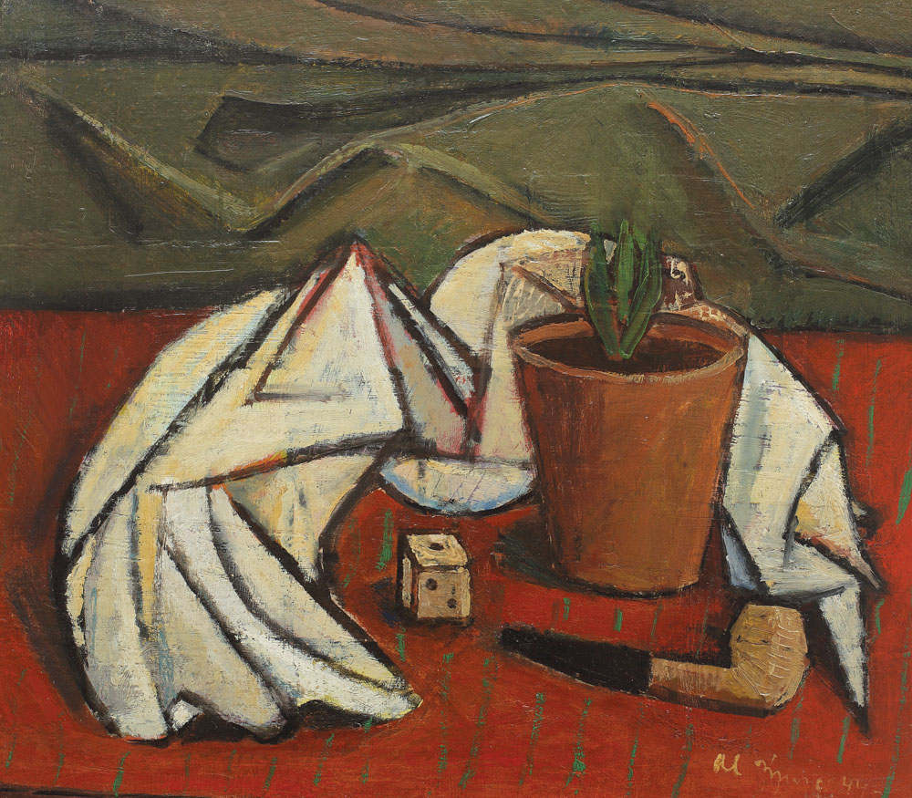 Pentru primele trei decenii de viață ale lui Alexandru Țipoia există o sumă de puncte biografice care îl definesc pe tânărul artist de la 1944. Studiile superioare sunt cele ce îi modelează pornirile artistice cultivate chiar în sânul familiei, astfel Țipoia intra în contact serios cu pictura la cursurile Academiei de Arte Frumoase din București, începând cu anul 1933. Primii maeștrii ce îi vor tempera și contura activitatea au fost profesorii Dărăscu și Gabriel Popescu, în preajma cărora tânărul va activa până spre absolvirea Academiei, în 1937. O primă călătorie în Italia se va dovedi hotărâtoare pentru traseul pe care și-l va impune artistul, în special în ceea ce privește înțelegerea artei la un nivel superior simplei apariții vizuale, un prim pas spre acel abstract de concepție. Dacă peisajul urban este cea mai pregnantă componentă a stilului impus de Țipoia în deceniul al cincilea al secolului trecut, aceasta se datorează unei viziuni realiste suprapuse unui studiu exhaustiv al formei și culorii. Suprafața devine ținta principală de studiu, planul formal fiind divizat și reorganizat, începând chiar cu planul perspectival, cel puțin în cazul peisajelor. Soliditatea lucrului după natură se va transpune treptat spre pictura în atelier, ce îi va deschide drumul și spre experimente interioare. Natura statică, preluată ca atare în forma ei clasică, va fi și ea remodelată sub imperiul exercițiului și experimentului, date ce se regăsesc totuși într-o atmosferă sobră, dar saturată. Tipică pentru perioada din care se extrage, opera de față ne prezintă o natură statică de o aparentă simplitate ascetică. Sentimentul transmis nu este eliminat de sintetizarea extremă pe care o încearcă Țipoia, chiar și în această apariție de o rigiditate stilistică aparte. Aspectul uleiului este coordonat de cele trei obiecte recognoscibile ce sunt “aruncate” într-o compoziție ce dorește să răspundă și altor probleme decât cele ridicate de realitatea imediată a atelierului. Viața (planta), hazardul (zarul) și existanța umană (pipa - drept viciu) trăiesc din plin într-o statică dispunere a lumii înconjurătoare, esențializată ca atare de ochiul sincer al unui pictor aflat în pragul maturității.