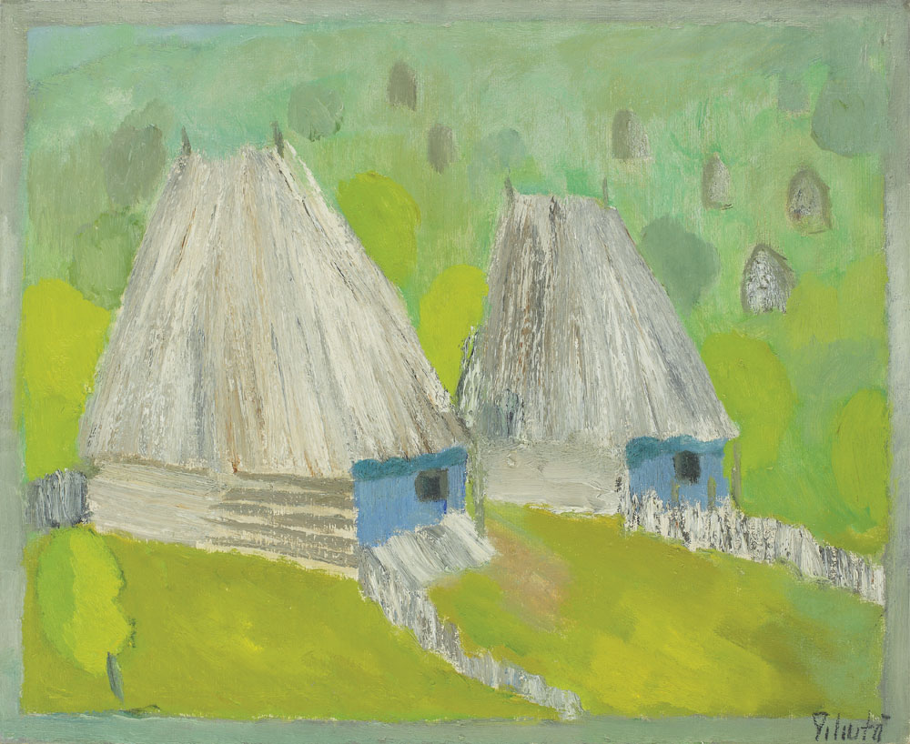“Să nu fi fost pictor, Constantin Piliuță ar fi fost un povestitor de mare savoare”. Tudor Octavian 1981. Constantin Piliuță s-a născut în anul 1929 la Botoșani, fiind a al treilea copil al unui modest funcționar. A urmat cursurile Institutului de arte plastice “Nicolae Grigorescu” din București între anii 1949-1955, unde l-a avut profesor pe Alexandru Ciucurencu. A participat la numeroase expoziții în țară și în străinătate, și a expus la cel de-al 84-lea Salon de arta al Independenților din Paris. Fie că a pictat orașul, satul sau malul Dunării, Piliuță a spus mereu o poveste. A surprins atmosfera de la marginea orașului, străzile mahalalei cu birtul sau casele acoperite de zăpadă. În peisajele de primăvară a înfățișat “cu o sinceră bucurie, spectacolul reconfortant al armonioasei desfășurări a locuințelor, al triumfătoarei explozii a vegetației”. Fănuș Neagu spunea: “Misterul unui tablou de Piliuță e mișcarea, legănarea fragilă și abia perceptibilă a subiectului”. “Peisaj cu case” este realizat în culori vii, purtătoare de lumină, pictorul eliminând intenționat tonurile întunecate. Tabloul ne oferă “prilejul unei călătorii într-un univers atemporal”, unde natura pare a fi eternă.
