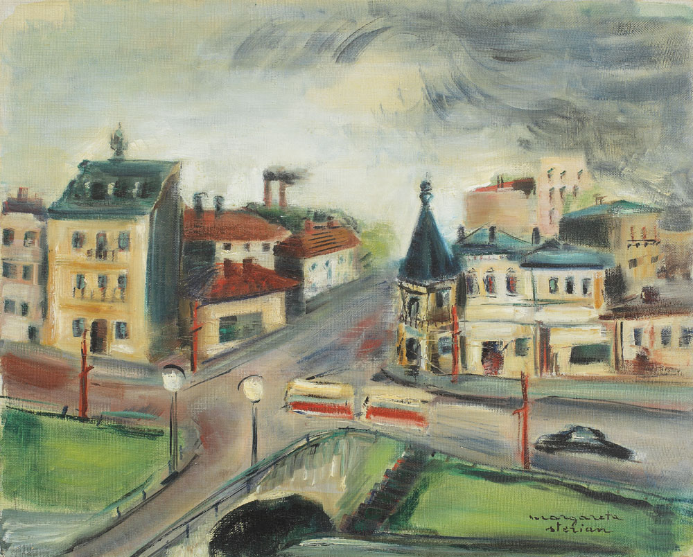 „Talent proteic”, manifestat în cele mai diferite genuri artistice – pictură, grafică, ceramică, literatură – Margareta Sterian ne-a lăsat o operă deosebit de vastă şi complexă, imagine a libertăţii şi a vigorii, ce se constituie într-un stil inovator, postmodernist. Operele sale stau sub semnul propriilor impresii adânci, memorii bine sedimentate, ce se repropun ori de câte ori artista le formula pe pânză, hîrtie sau ceramică. Principalul izvor al creaţiei lui Sterian se regăseşte în însăşi personalitatea acesteia, în baza căreia a construit un univers artistic bine definit în peisajul artei româneşti al generaţiei sale. Eugen Ionescu numea pictura Margaretei Sterian „climat magic” (1932). Mai târziu, criticul de artă Olga Buşneag, cea care a analizat pentru prima dată universul creaţiei artistei, a pus operele acesteia sub semnul „realismului magic”, un concept atribuit iniţial mişcării germane „Neue Sachlichkeit” („Noua Obiectivitate”), asimilat în anii ’60 de „Noul realism” şi de „Pop art”. Văzut ca un proces de îmbinare a observaţiilor precise şi a elementelor meditative, în care banalul devine îngrozitor, realismul magic are, în cazul Margaretei Sterian, conotaţii precise şi o semnificaţie aparte, fiind o împletire între existenţialism şi sentimente de trăire, pe de o parte şi de încredere în valorile umane, pe de altă parte. „Vedere din atelierul artistei” către clădirile şi străzile bucureştiului ce se întâlnesc la o răscruce, cromatica rece (albastru, cenuşiu, griuri violacee şi doar câteva accente de roşu stins) ne relevă un oraş mai puţin luminos şi mai mult dramatic. Imaginea este privită de sus, parcă din zborul unei păsări rătăcite în atmosfera rece a oraşului înainte de începerea furtunii.