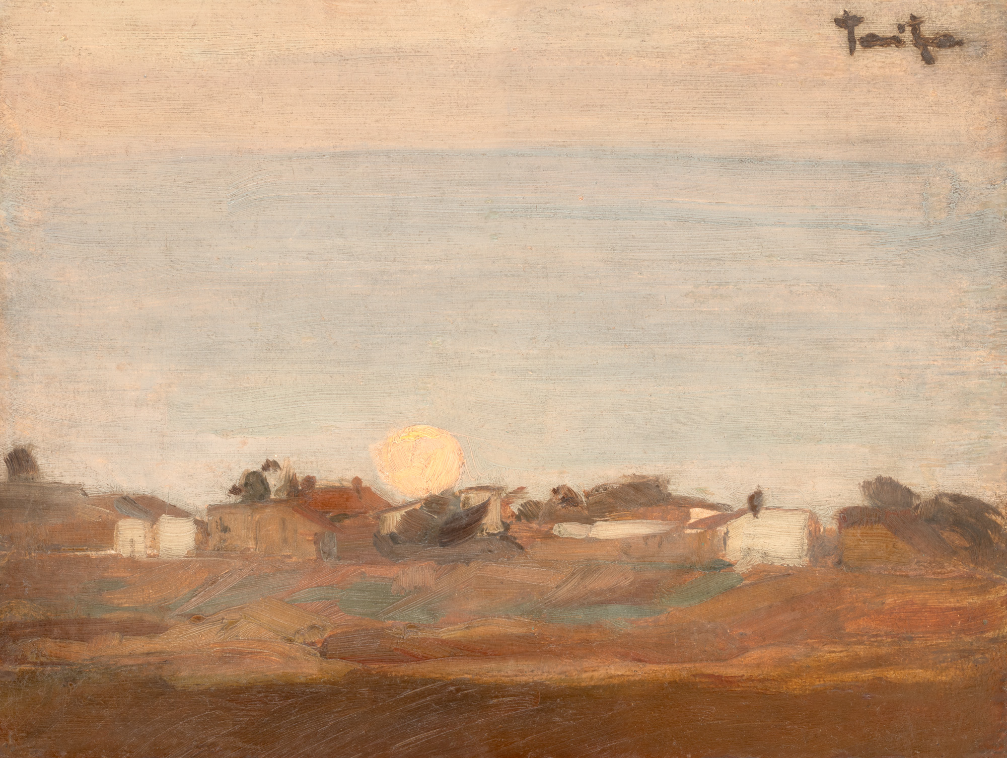 Predilecția lui Tonitza pentru desen este aprofundată în urma studiile realizate la München, însă calitățile picturale le va dobândi ca urmare a înscrierii sale în cadrul Academiei de Artă de la Paris, unde acolo învață cum să utilizeze culoarea în favoarea sa și dobândește cunoștințele necesare care să îl ajute să atribuie spațiul și forma în ceea ce privește cromatica. În perioada anilor 1920 Tonitza începe să se retragă periodic pe litoralul Mării Negre, în special la Mangalia, unde este atras de lumina specifică Dobrogei și va realiza o serie de opere inspirate de zona Mării Negre. Această perioadă este una dintre cele mai luminoase și poetice din cariera sa. Compozițiile sale sunt echilibrate cromatic, cu accent pe lumină și atmosferă, cu tușe vibrante și plăcute, unde câteva exemple în acest sens sunt:,,Peisaj dobrogean” sau ,,Peisaj din Deltă”. Lucrarea de față, face parte din perioada anilor 1920 și este una dintre temele sale predilecte pe care o va relua de mai multe ori în cadrul acestei perioade de creație artistică pe care o va petrece pe litoralul românesc. Lucrarea surprinde momentul apusului de soare peste Marea Neagră, într-o atmosferă calmă și liniștită. Orizontul este jos, iar cea mai mare parte a lucrării fiind dominată de cer și mare, alături de câteva bărci și clădiri redate ușor în partea inferioară a lucrării, punând accent pe armonia dintre natură și lumină. Compoziția este dominată de tonuri calde de portocaliu, brun și albastru închis ce creează o stare de liniște și contemplare, ce reflectă capacitatea lui Tonitza de a transmite stări sufletești prin intermediul peisajului. Astfel, apusul devine aici un simbol al trecerii timpului și al tăcerii. Stilul pe care îl adoptă în pictură reprezintă rezultatul unui studiu asiduu și al unui exercițiu continuu de îmbinare armonioasă a formelor și a culorilor dobândit în în urma studiilor de la Paris.