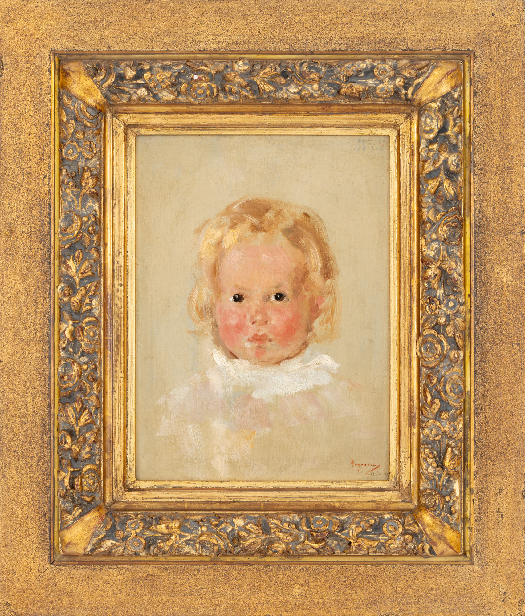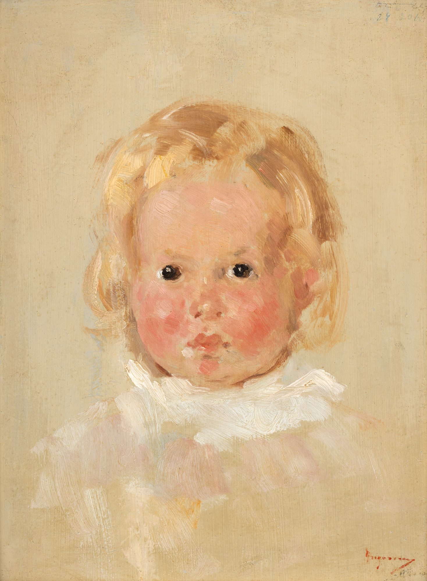 Datând din perioada maturității depline, această schiță magistrală mărturisește totala înstăpânire asupra mijloacelor de expresie de către Grigorescu. Arta redării prin câteva trăsături de penel, în nuanțe cromatice deschise și luminoase, a unui univers uman se împletește cu fina intuiție psihologică în acest sondaj pe care artistul îl face în universul de puritate al copilăriei. Subjugat de vivacitatea și prospețimea acestui început de viață, artistul sesizează privirea interogatoare și directă adresată lumii, ochii de catifea ai copilului pe care așterne rapid și sigur, câte un strop de alb. Chipul bucălat și roz se detașează pe fondul de culoare alb-gri pictat în strat fin, subțire, ca un voal. Meșele de păr mătăsos, auriu, indicate prin câteva tușe dezinvolte, susțin delicatețea acestui chip surprins către vârsta de doi ani. Conform însemnării ce a figurat - astăzi este aproape ilizibilă - pe dosul ramei, „copilul lui Grămadă”, s-a putut propune de către deținători succesivi ai picturii, drept identitate a modelului, unul dintre personajele familiei bucovinene Grămadă, afirmată în prima jumătate a secolelui XX prin mai mulți istorici, scriitori, profesori universitari la Iași sau Cernăuți. Amintim două personalități ale căror date anagrafice ar putea corespunde cu realizarea lucrării de față: Ion Grămadă (1886-1917), scriitor, eroul de la Cireșoaia; Niculai Grămadă (1892-1961), istoric, profesor universitar. Putem presupune că ar fi făcut parte din colecția de artă a fondatorului Băncii Naționale, economistul Eugeniu Carada (1836-1910), colecție renumită în epocă prin calitatea Grigoreștilor. În acest sens, existența pe verso-ul ramei a unui număr 12, ar putea corespunde cu numărul din catalogul colecției Carada pusă în vânzare în 1910 (nr. 12 , „Cap de copil”). Apreciem că lucrarea se prezintă în încadrarea inițială. (I.B.)